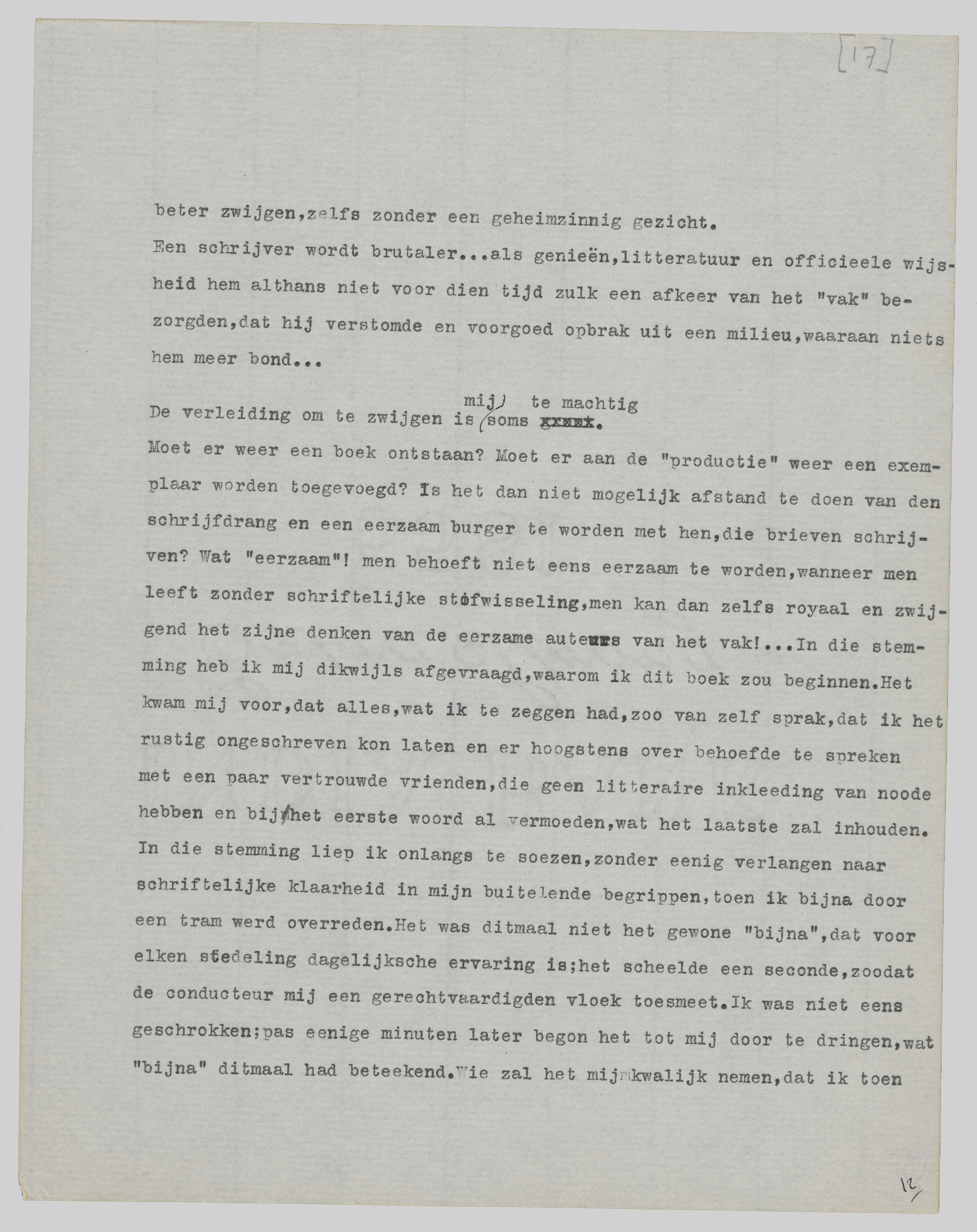 Ik ben niet coquet, wanneer ik mij verdedig tegen mijn schrijverschap; de eerste coquetterie van het schrijven ligt achter mij, met le plaisir de se voir imprimé. Ik loochen ook niet de genoegens van het schrijven, ik loochen zelfs niet den hartstocht van het schrijven, waaraan ik verslingerd ben; platvloersche geesten, die uit mijn woorden de conclusie willen trekken, dat schrijven voor mij een nonchalant, haast katterig amusement is, bezondigen zich weer aan de vergrootingsmanie, die alle dingen ‘des geestes’ pompeus etaleert om ze zichtbaar te maken. Maar ik heb te vaak aan het schrijven getwijfeld, om nog langer de vlijt en het mysterie van het ‘vak’ te kunnen voorwenden; ik voel geen spoor van gemeenschap meer met mijn medeleden van het schrijversgilde, ook niet met hen, die mèt mij jong waren en zich gelijktijdig aan de litteratuur begonnen te vergrijpen. Was vroeger, enkele jaren geleden nog, het schrijven een teeken, waaraan wij elkaar herkenden, thans vraag ik mij bij een ontmoeting met een schrijver aanstonds af: wat verbergt hij door zijn noeste vlijt aan letters besteed, hoe