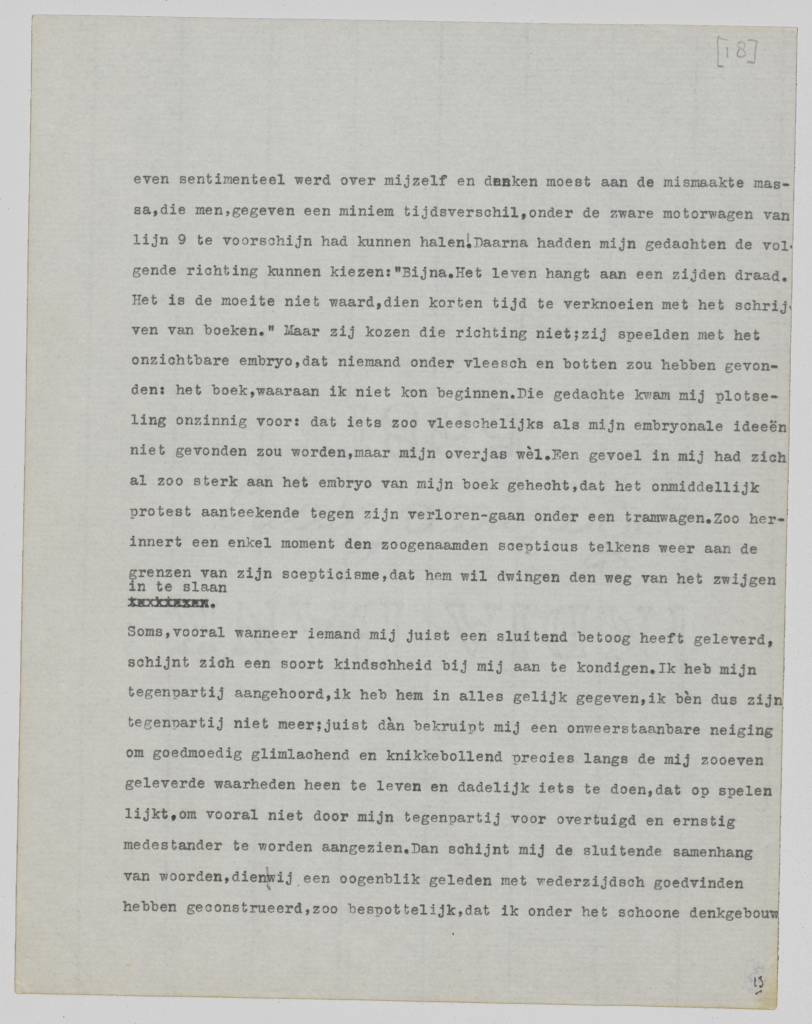 zijden draad. Het is de moeite niet waard, dien korten tijd te verknoeien met het schrijven van boeken.’ Maar zij kozen die richting niet; zij speelden met het onzichtbare embryo, dat niemand onder vleesch en botten zou hebben gevonden: het boek, waaraan ik niet kon beginnen. Die gedachte kwam mij plotseling onzinnig voor: dat iets zoo vleeschelijks als mijn embryonale ideeën niet gevonden zou worden, maar mijn overjas wèl. Een gevoel in mij had zich al zoo sterk aan het embryo van mijn boek gehecht, dat het onmiddellijk protest aanteekende tegen zijn verloren-gaan onder een tramwagen. Zoo herinnert een enkel moment den zoogenaamden scepticus telkens weer aan de grenzen van zijn scepticisme, dat hem wil dwingen den weg van het zwijgen in te slaan.