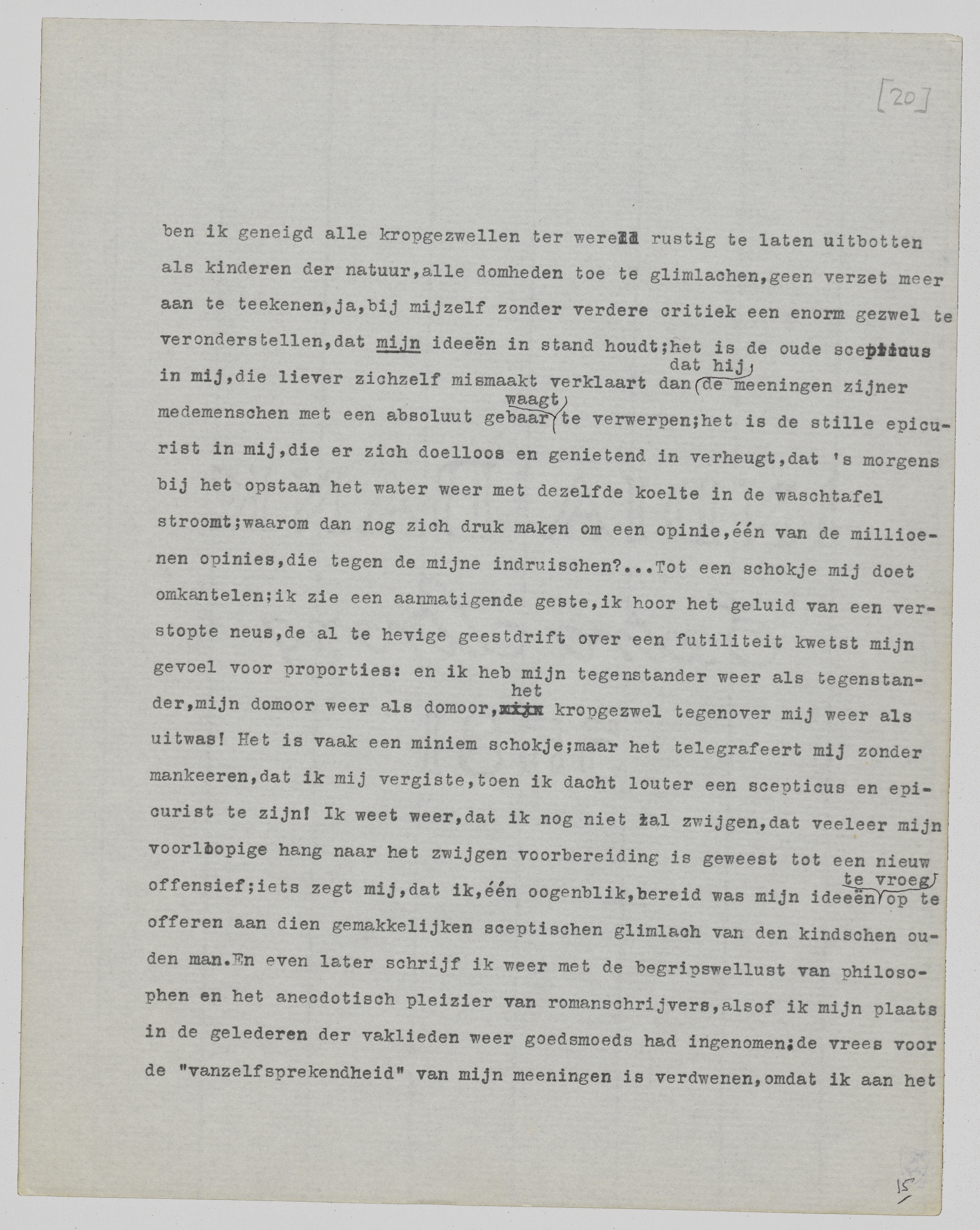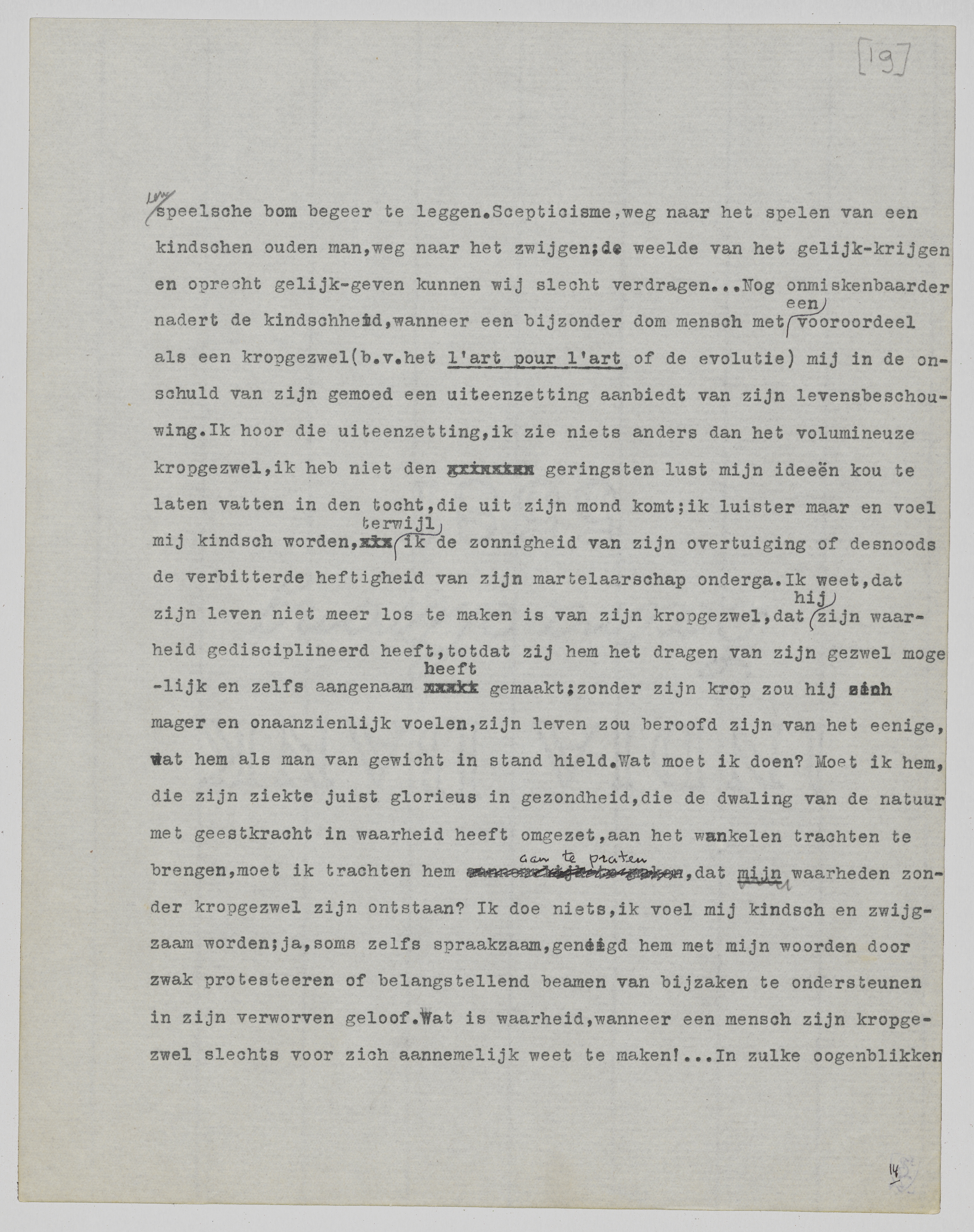 dat ik onder het schoone denkgebouw een speelsche bom begeer te leggen. Scepticisme, weg naar het spelen van een kindschen ouden man, weg naar het zwijgen; de weelde van het gelijk-krijgen en oprecht gelijk-geven kunnen wij slecht verdragen... Nog onmiskenbaarder nadert de kindschheid, wanneer een bijzonder dom mensch met een vooroordeel als een kropgezwel (b.v. het l'art pour l'art of de evolutie) mij in de onschuld van zijn gemoed een uiteenzetting aanbiedt van zijn levensbeschouwing. Ik hoor die uiteenzetting, ik zie niets anders dan het volumineuze kropgezwel, ik heb niet den geringsten lust mijn ideeën kou te laten vatten in den tocht, die uit zijn mond komt; ik luister maar en voel mij kindsch worden, terwijl ik de zonnigheid van zijn overtuiging of desnoods de verbitterde heftigheid van zijn martelaarschap onderga. Ik weet, dat zijn leven niet meer los te maken is van zijn kropgezwel, dat hij zijn waarheid gedisciplineerd heeft, totdat zij hem het dragen van zijn gezwel mogelijk en zelfs aangenaam heeft gemaakt: zonder zijn krop zou hij zich mager en onaanzienlijk voelen, zijn leven zou beroofd zijn van het eenige, wat hem als man van gewicht in stand hield. Wat moet ik doen? Moet ik hem, die zijn ziekte juist glorieus in gezondheid, die de dwaling van de natuur met geestkracht in waarheid heeft omgezet, aan het wankelen trachten te brengen, moet ik trachten hem aan te praten, dat mijn waarheden zonder kropgezwel zijn ontstaan? Ik doe niets, ik voel mij kindsch en zwijgzaam wor-