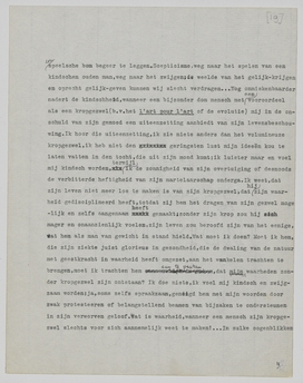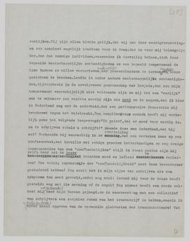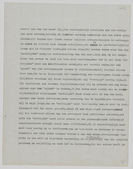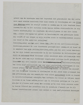 moreelen klank van het woord ‘eerlijk’. Het wil voor mij niet zeggen, dat ik nu ieder, die voor mij klaar is gaan staan, trouwhartig de hand kom schudden, om hem daarna te overweldigen met de hoeveelheid schandalen, die samen ‘mijn leven’ vormen. Het wil voor mij evenmin zeggen, dat ik alle schrijversijdelheid prijsgeef, om naakt te poseeren voor alle leden van het leesgezelschap; ik heb nog ijdelheid genoeg, om mijn zinnen zoo te styleeren, dat zij voor principieele eerlijkheidsmaniakken onleesbaar zijn, en mijn leven zoo te styleeren, dat het een rijk gevarieerd schouwspel zonder al te veel vooze plekken lijkt; ik heb alleen niet genoeg ijdelheid meer, om een professoraat te ambieeren en daarvoor onverdroten specialistische tijdschrift-artikelen te gaan vervaardigen. Dit laatste zou men dan mijn eerlijkheid kunnen noemen: ik ben ijdel genoeg, om mij liever te laten bewonderen als enfant terrible te midden van kunstenaars en wijsgeeren dan als eerlijk en bescheiden vakman. Met andere woorden: een volkomen oneerlijke, ijdele vorm van diplomatie, waarachter men mijn levensbiecht zelf maar moet zoeken, als men daarvoor den tijd wil nemen. Mijn eerlijkheid is niet voor iedereen gratis beschikbaar, zooals die van dr. van der Velde of andere weergaloos eerlijke auteurs, waartegen concurrentie onmogelijk is.