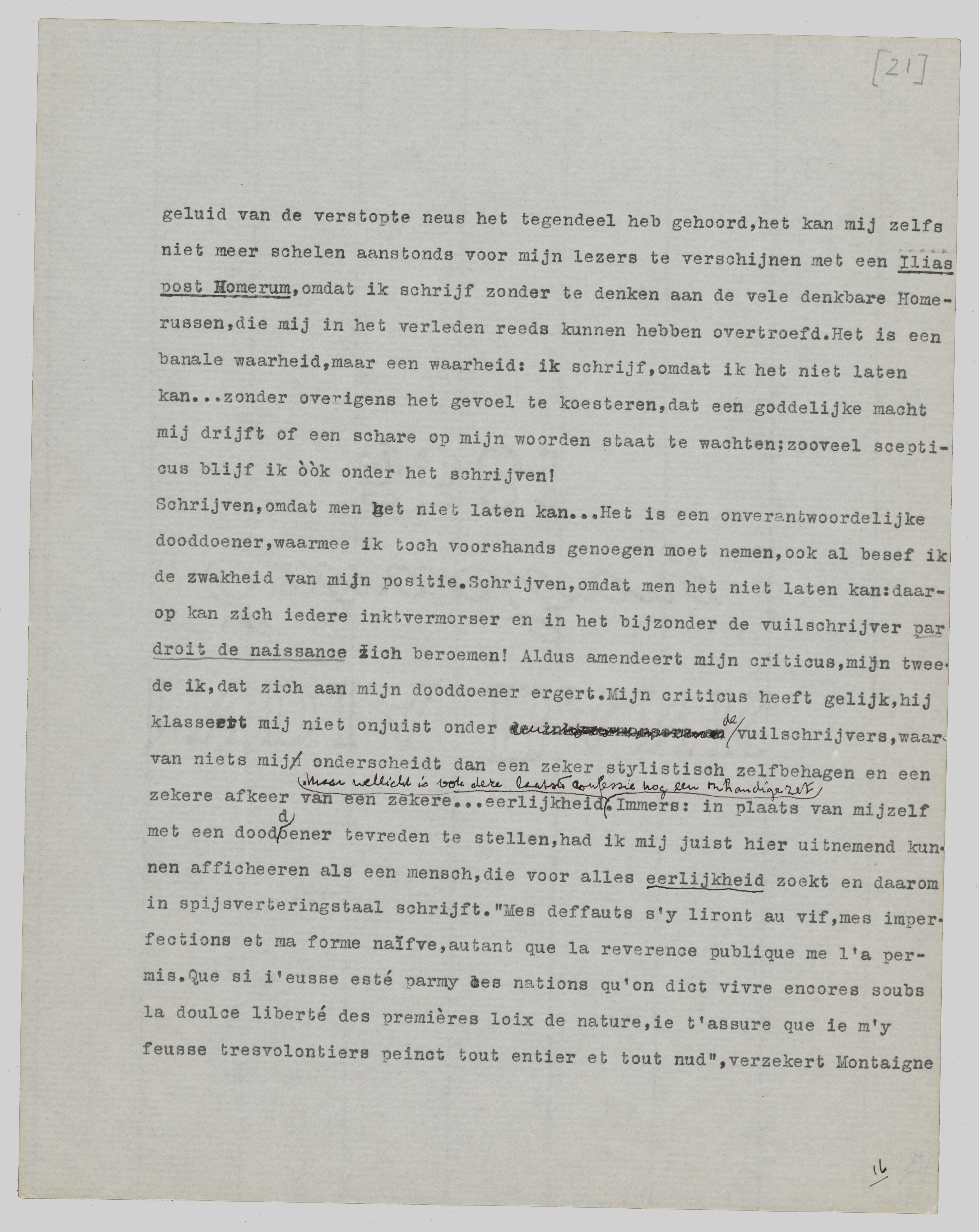 Schrijven, omdat men het niet laten kan... Het is een onverantwoordelijke dooddoener, waarmee ik toch voorshands genoegen moet nemen, ook al besef ik de zwakheid van mijn positie. ‘Schrijven, omdat men het niet laten kan: daarop kan iedere inktvermorser en in het bijzonder de vuilschrijver par droit de naissance zich beroemen!’ Aldus amen-