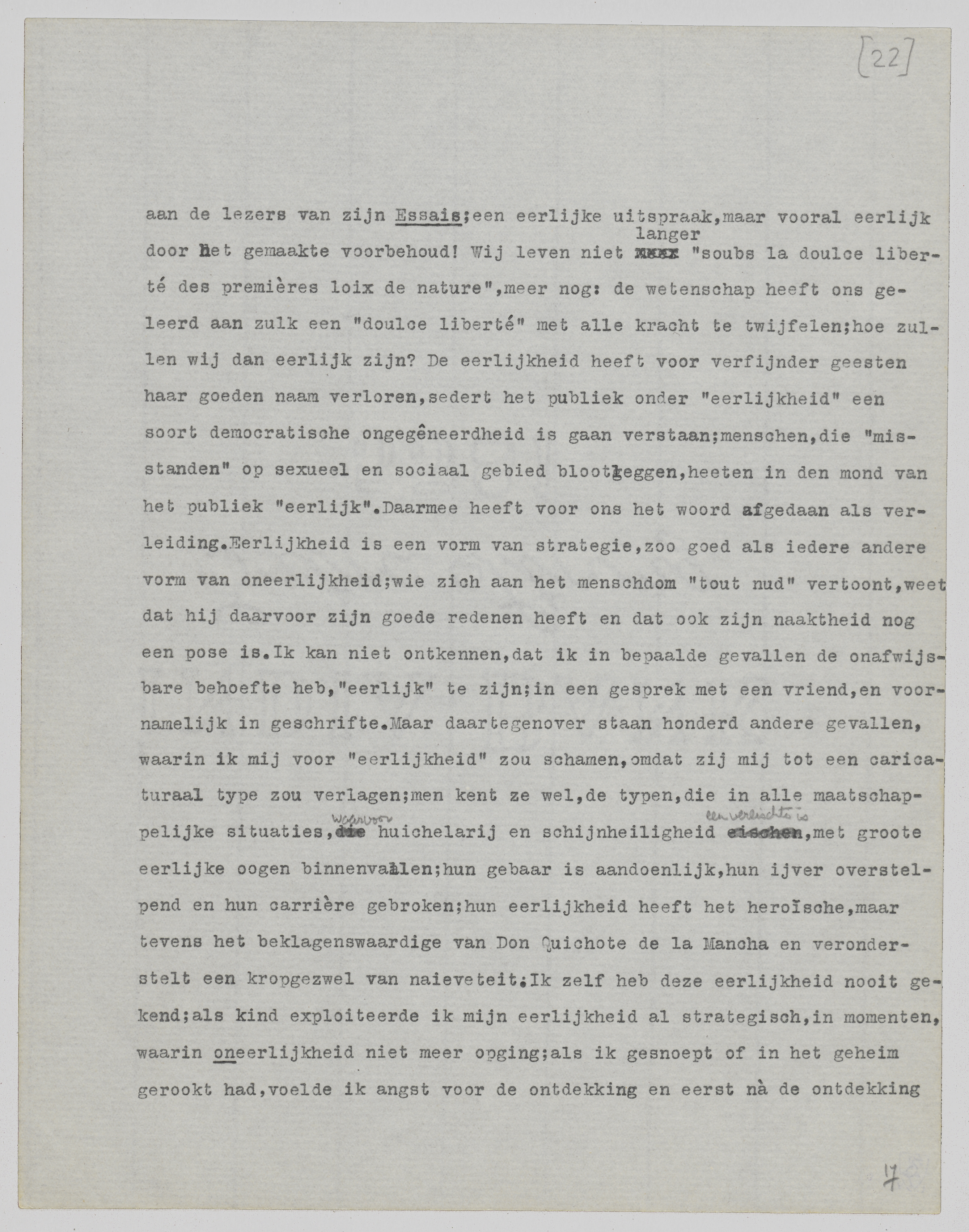 ons het woord afgedaan als verleiding. Eerlijkheid is voor mij een vorm van strategie, zoo goed als iedere andere vorm van oneerlijkheid; wie zich aan het menschdom ‘tout nu’ vertoont, weet dat hij daarvoor zijn goede redenen heeft en dat ook zijn naaktheid nog een pose is. Ik kan niet ontkennen, dat ik in bepaalde gevallen de onafwijsbare behoefte heb, ‘eerlijk’ te zijn; in een gesprek met een vriend, en voornamelijk in geschrifte. Maar daartegenover staan honderd andere gevallen, waarin ik mij voor ‘eerlijkheid’ zou schamen, omdat zij mij tot een caricaturaal type zou verlagen; men kent ze wel, de typen, die in alle maatschappelijke situaties, waarvoor huichelarij en schijnheiligheid een vereischte is, met groote eerlijke oogen binnenvallen; hun gebaar is aandoenlijk, hun ijver overstelpend en hun carrière gebroken; hun eerlijkheid heeft het heroïsche, maar tevens het beklagenswaardige van Don Quichote de la Mancha en veronderstelt een kropgezwel van naïveteit. Ik zelf heb deze eerlijkheid nooit gekend; als kind exploiteerde ik mijn eerlijkheid al strategisch, in momenten waarin oneerlijkheid niet meer opging; als ik gesnoept of in het geheim gerookt had, voelde ik angst voor de ontdekking en eerst nà de ontdekking heftig berouw. Blijkbaar was dit berouw echt, want het was heftig; maar even blijkbaar was het geen moreele imperatief, die vermanend tot mij sprak, omdat hij zich alleen liet hooren en flagrant délit...