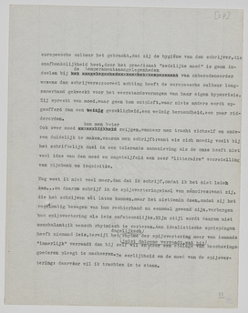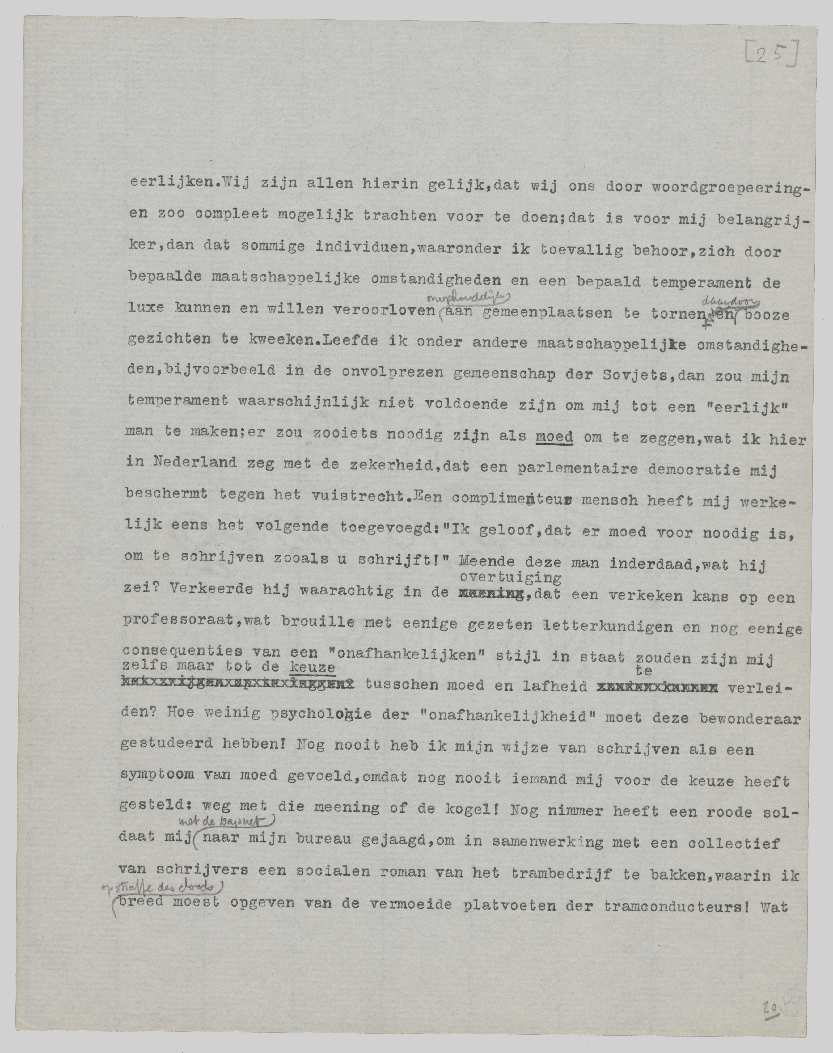 Ook over moed kan men beter zwijgen, wanneer men tracht zichzelf en anderen duidelijk te maken, waarom men schrijft; want wie zich moedig voelt bij het schriftelijk duel in een tolerante samenleving als de onze heeft niet veel idee van den moed en ongetwijfeld een zeer ‘litteraire’ voorstelling van pijnbank en inquisitie.