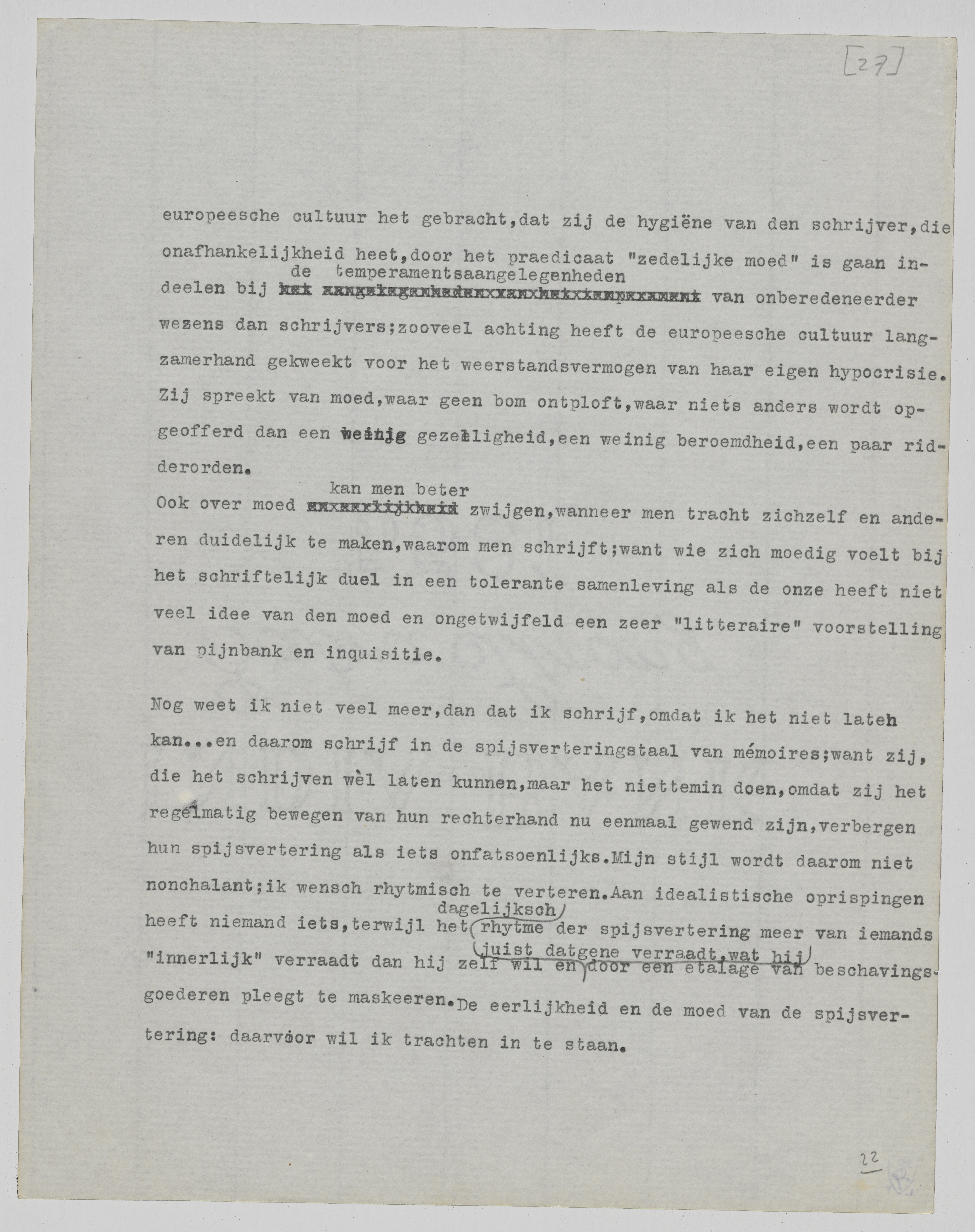 Nog weet ik niet veel meer, dan dat ik schrijf, omdat ik het niet laten kan... en daarom schrijf ik in de spijsverteringstaal van mémoires; want zij, die het schrijven wèl laten kunnen, maar het niettemin doen, omdat zij het regelmatig bewegen van hun rechterhand nu eenmaal gewend zijn, verbergen hun spijsvertering als iets onfatsoenlijks. Mijn stijl wordt daarom niet nonchalant; ik wensch rhythmisch te verteren. Aan idealistische oprispingen heeft niemand iets, terwijl het dagelijksch rhythme der spijsvertering meer van iemands ‘innerlijk’ verraadt dan hij zelf wil en juist datgene verraadt, wat hij door een etalage van beschavingsgoederen pleegt te maskeeren. De eerlijkheid en moed van de spijsvertering: daarvoor wil ik trachten in te staan.