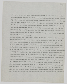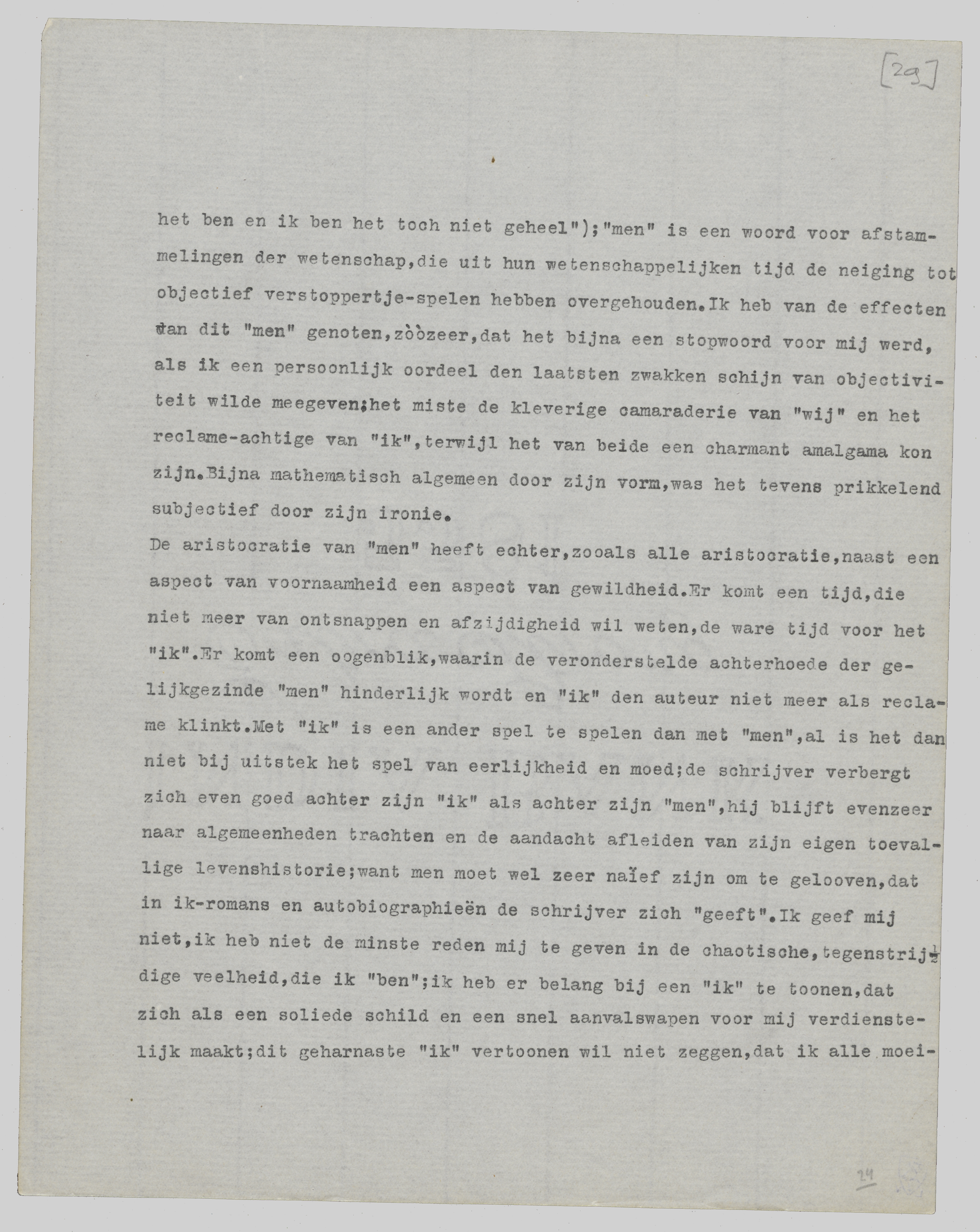 De aristocratie van ‘men’ heeft echter, zooals alle aristocratie, naast een aspect van voornaamheid een aspect van gewildheid. Er komt een tijd, die niet meer van ontsnappen en afzijdigheid wil weten, de ware tijd voor het ‘ik’. Er komt een oogenblik, waarin de veronderstelde achterhoede der gelijkgezinde ‘men’ hinderlijk wordt en ‘ik’ den auteur niet meer als reclame klinkt. Met ‘ik’ is een ander spel te spelen dan met ‘men’, al is het dan niet bij uitstek het spel van eerlijkheid en moed; de schrijver verbergt zich even goed achter zijn ‘ik’ als achter zijn ‘men’, hij blijft evenzeer naar algemeenheden trachten en de aandacht afleiden van zijn eigen toevallige levenshistorie; want iemand moet wel zeer naïef zijn om te gelooven, dat in ik-romans en autobiographieën de schrijver zich ‘geeft’. Ik geef mij niet, ik heb niet de minste reden mij te geven in de