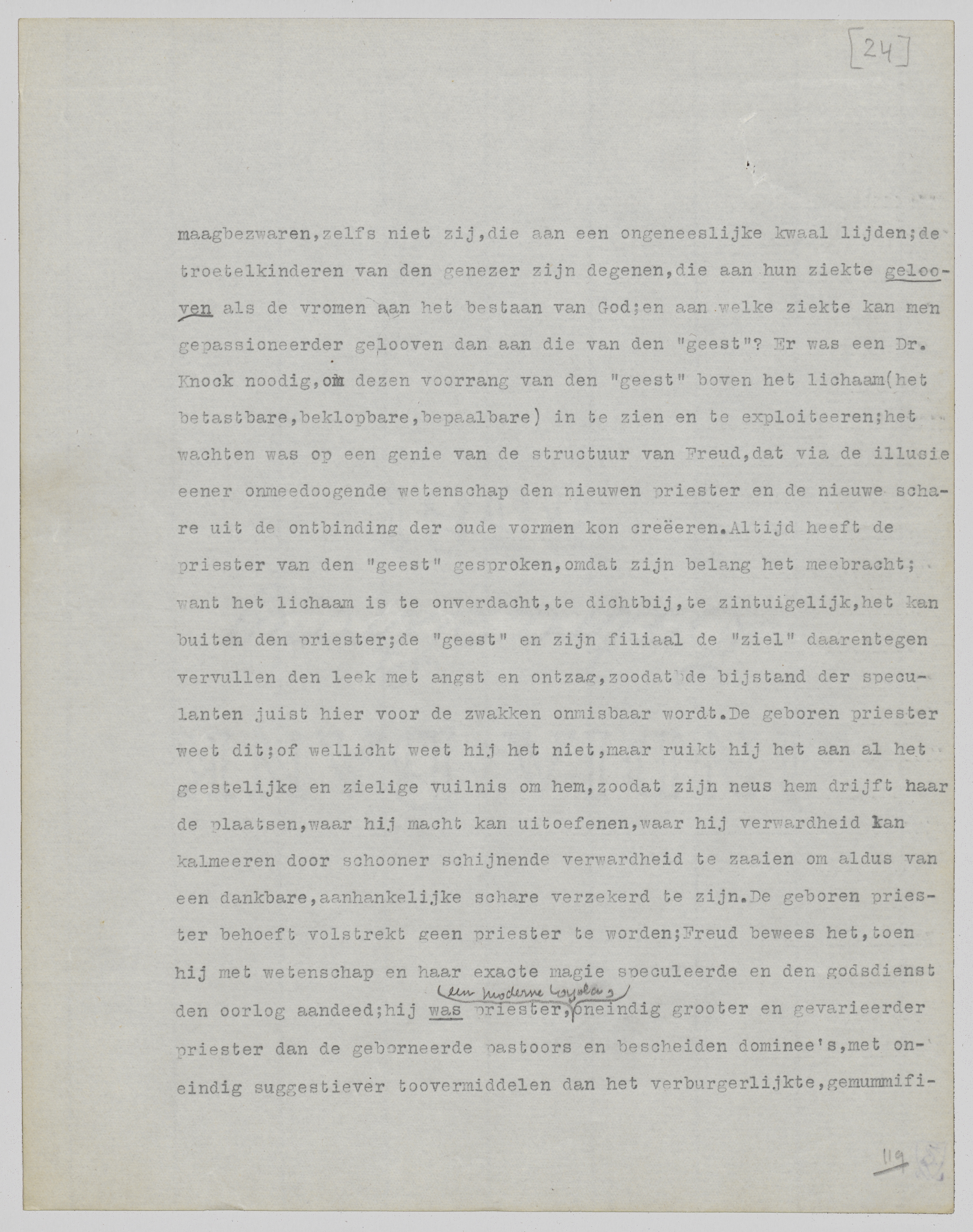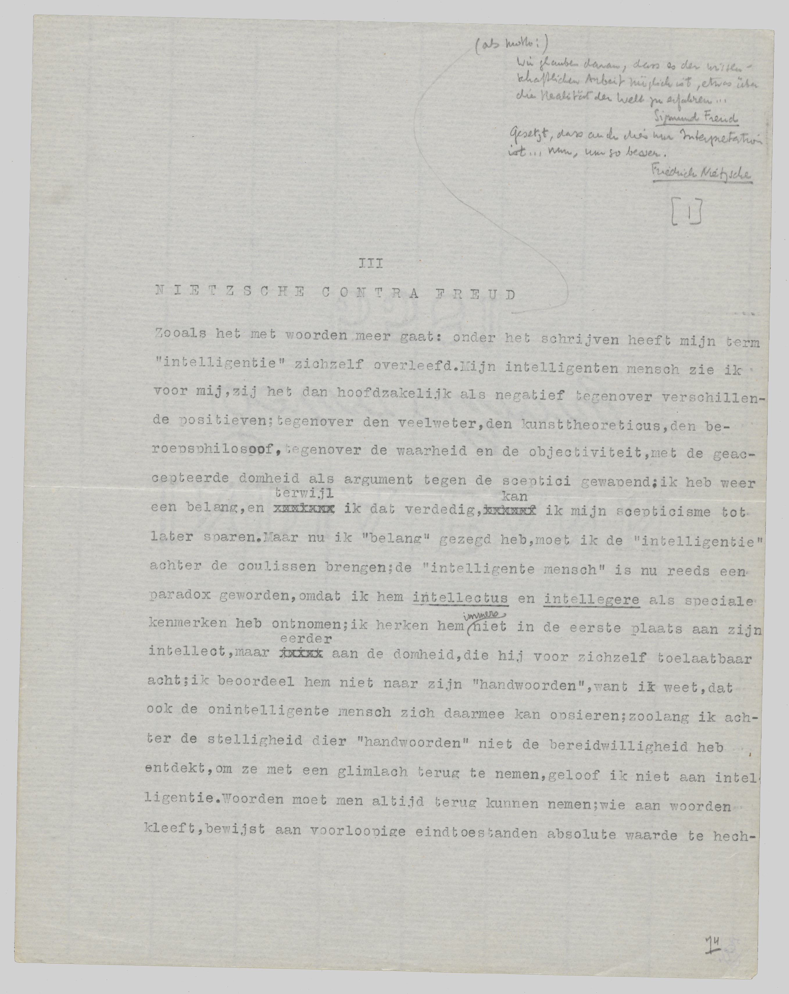 Terwijl ik Freud las, voelde ik mij voortdurend gespleten in een voor- en tegenstander. Een voorstander: want ik bewonderde ieder oogenblik zijn vondsten, ik gleed mee met zijn helderen, soms door wetenschapsbescheidenheid licht pedanten, maar nooit artificieel aangedikten stijl, ik genoot vooral van wat ik zooeven zijn zindelijkheid noemde: zijn afkeer van de philosophen, zijn koude verachting voor de infantiele illusies van het christendom,