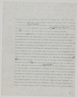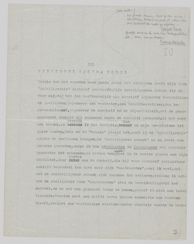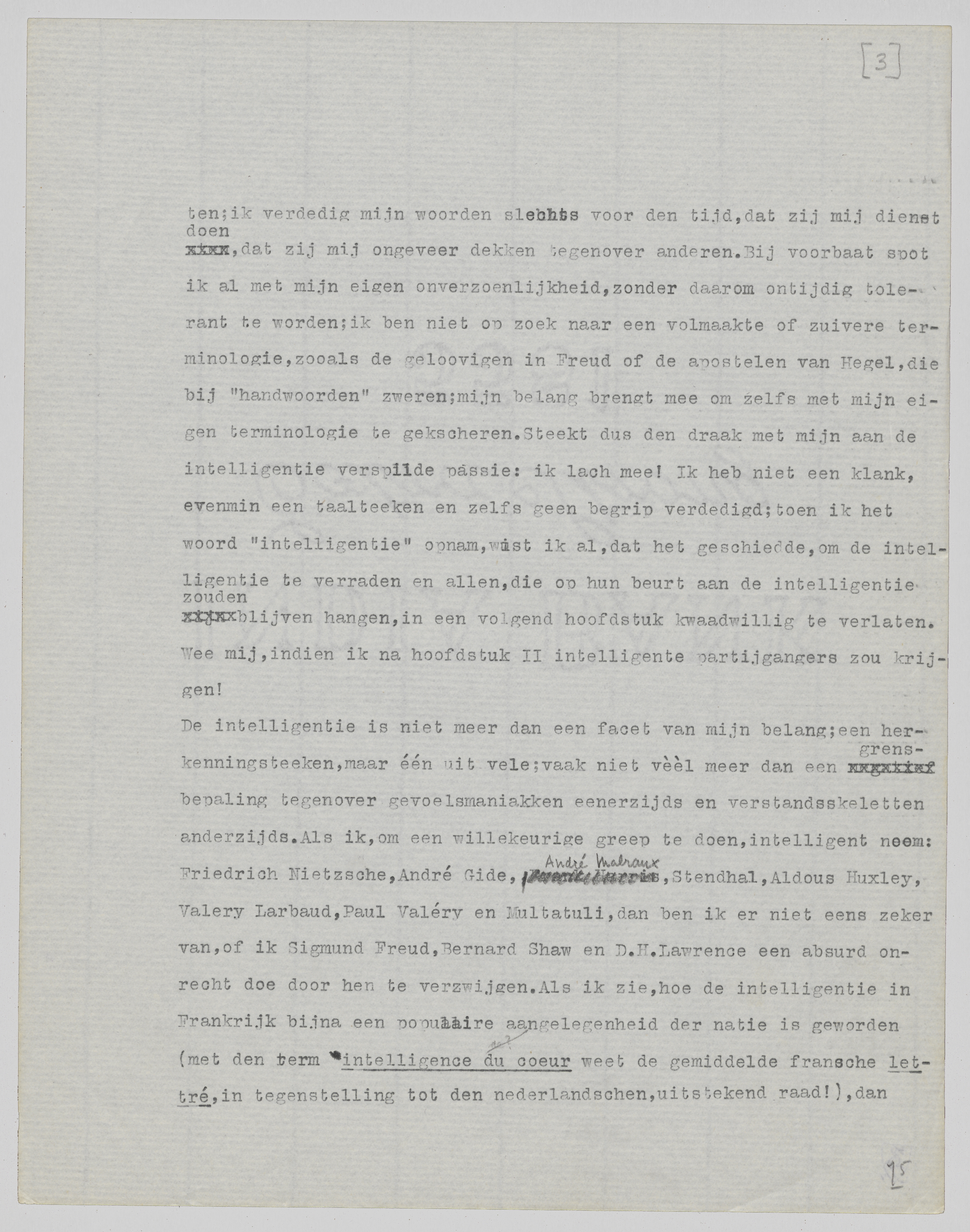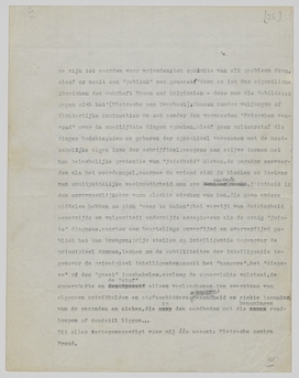Zooals het met woorden meer gaat: onder het schrijven heeft mijn term ‘intelligentie’ zichzelf overleefd. Mijn intelligenten mensch zie ik voor mij, zij het dan hoofdzakelijk als negatief tegenover verschillende positieven; tegenover den veelweter, den kunsttheoreticus, den beroepsphilosoof, tegenover de waarheid en de objectiviteit, met de geaccepteerde domheid als argument tegen de sceptici gewapend: ik heb weer een belang, en terwijl ik dat verdedig, kan ik mijn scepticisme tot later sparen. Maar nu ik ‘belang’ gezegd heb, moet ik de ‘intelligentie’ achter de coulissen brengen; de ‘intelligente mensch’ is nu reeds een paradox geworden, omdat ik hem intellectus en intellegere als speciale kenmerken heb ontnomen; ik herken hem immers niet in de eerste plaats aan zijn intellect, maar eerder aan de domheid, die hij voor zichzelf toelaatbaar acht; ik beoordeel hem niet naar zijn ‘handwoorden’, want ik weet,