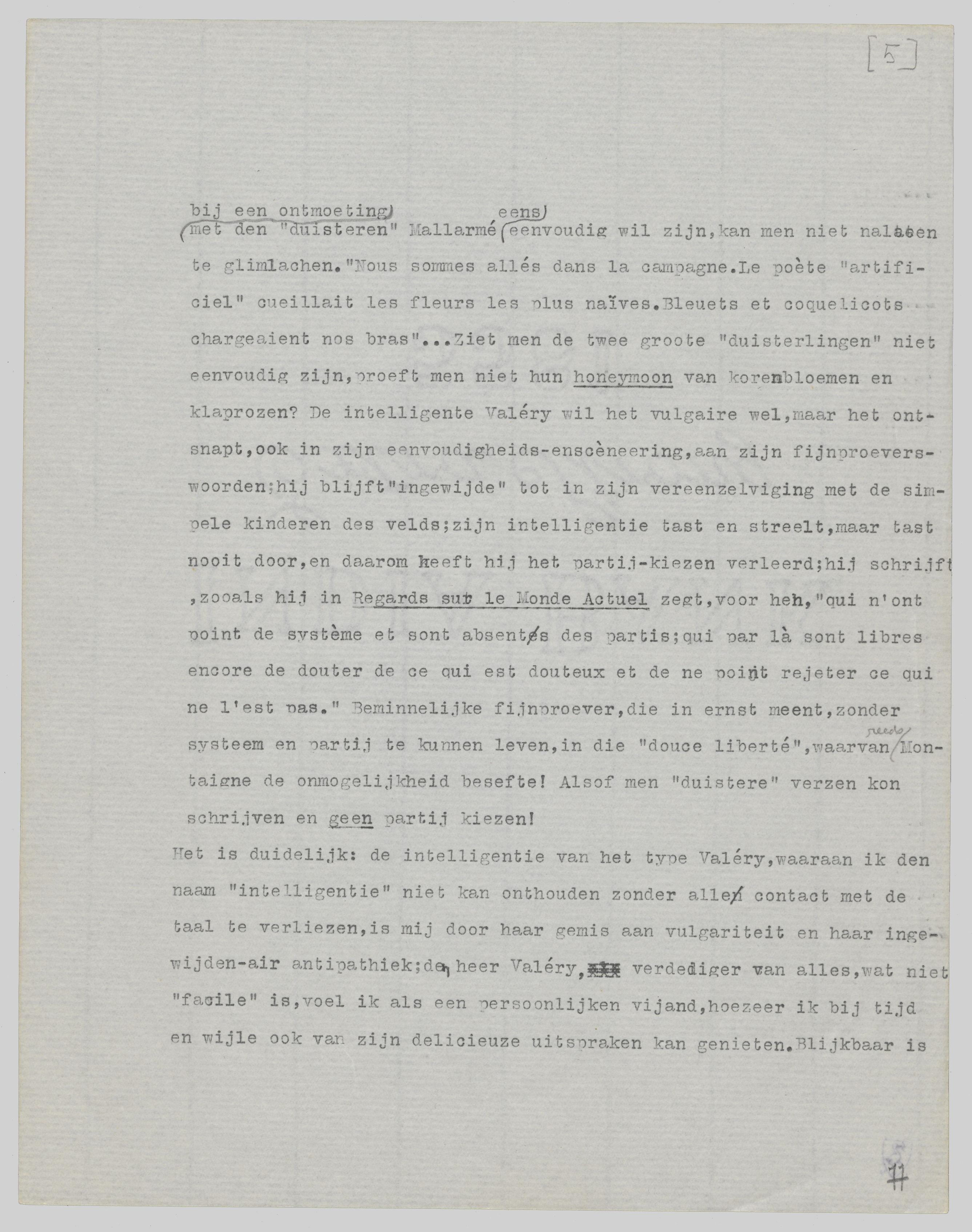 In bepaalde gevallen is mij de intelligentie, waar ik haar volledig moet laten gelden als een intelligentie in mijn beteekenis, zelfs duidelijk antipathiek: een teeken, dat het woord zich voor mij overleefd heeft. Ik laat Paul Valéry gelden als een bijzonder intelligent schrijver, maar mijn belang wijst hem af en prefereert b.v. den minder intelligenten Lawrence. De intelligentie van Valéry is zoo genuanceerd en kwetsbaar, dat men hem soms problemen ziet opnemen als oud porselein; alsof problemen konden breken! Hij mist alle gevoel voor het vulgaire en blijft aestheet tot in zijn anti-aesthetische oogenblikken; als hij bij een ontmoeting met den ‘duisteren’ Mallarmé eens eenvoudig wil zijn, kan men niet nalaten te glimlachen. ‘Nous sommes allés dans la campagne. Le poète “artificiel” cueillait les fleurs les plus naïves. Bleuets et coquelicots chargeaient nos bras’... Ziet men de twee groote ‘duisterlingen’ niet eenvoudig zijn, proeft men niet hun honeymoon van korenbloemen en klaprozen? De intelligente Valéry wil het vulgaire wel, maar het ontsnapt, ook in zijn eenvoudigheids-enscèneering, aan zijn fijnproeverswoorden; hij blijft ‘ingewijde’ tot in zijn vereenzelviging met de simpele kinderen des velds; zijn intelligentie tast en streelt, maar tast nooit door, en daarom heeft hij het partij-kiezen verleerd; hij schrijft, zooals hij in Regards sur le Monde Actuel zegt, voor hen ‘qui n'ont point de système