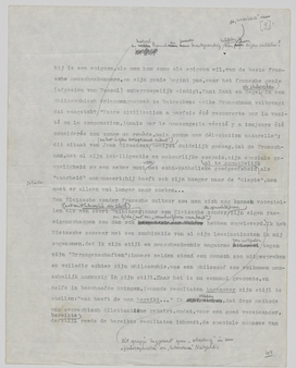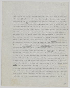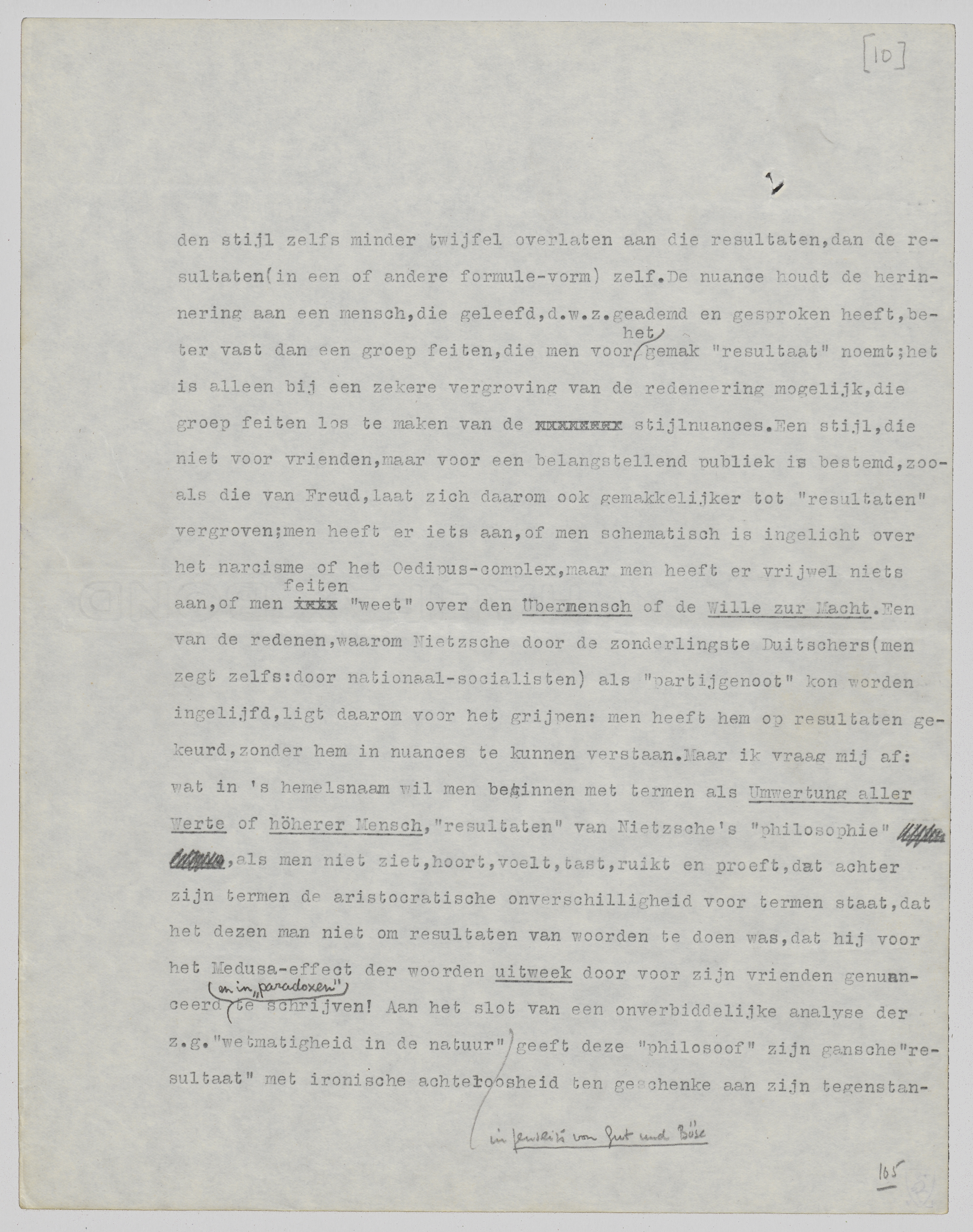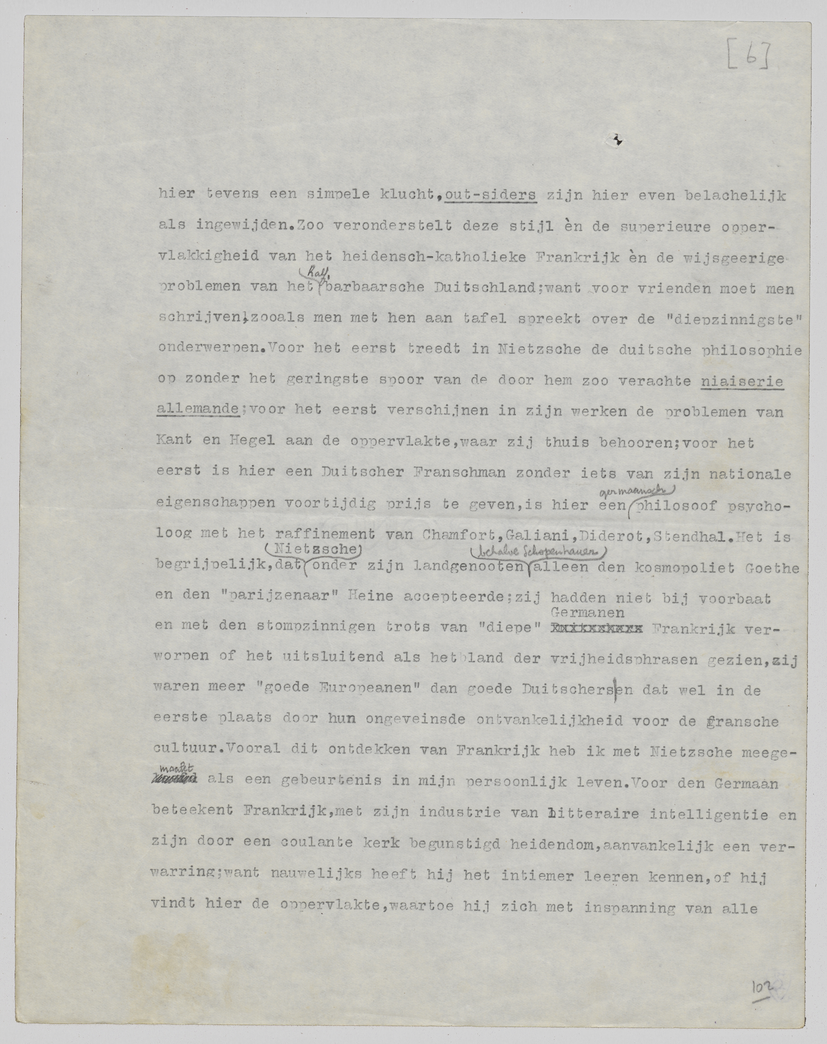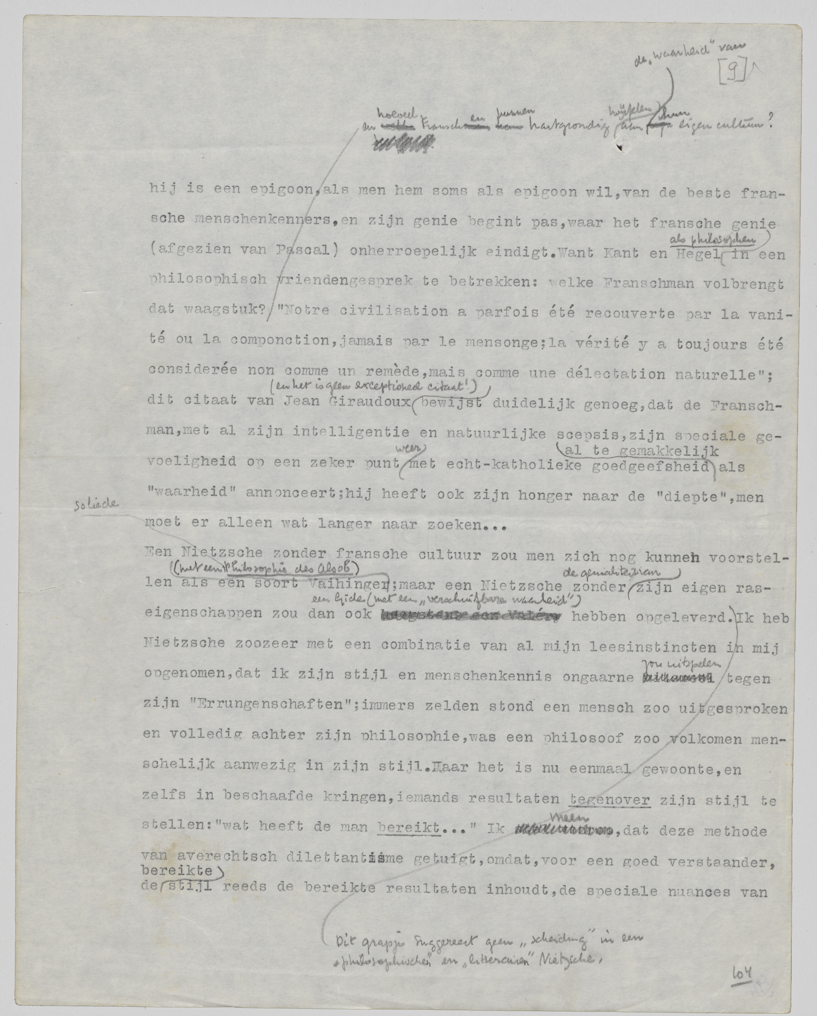 Een Nietzsche zonder fransche cultuur zou men zich nog kunnen voorstellen als een soort Vaihinger (met een solide Philosophie des Alsob); maar een Nietzsche zonder de genialiteit van zijn eigen raseigenschappen zou dan ook een Gide (met een ‘verschuifbare waarheid’) hebben opgeleverd. Dit grapje suggereert geen ‘scheiding’ in een ‘philosophischen’ en een ‘litterairen’ Nietzsche. Ik heb Nietzsche zoozeer met een combinatie van al mijn leesinstincten in mij opgenomen, dat ik zijn stijl en menschenkennis ongaarne zou uitspelen tegen