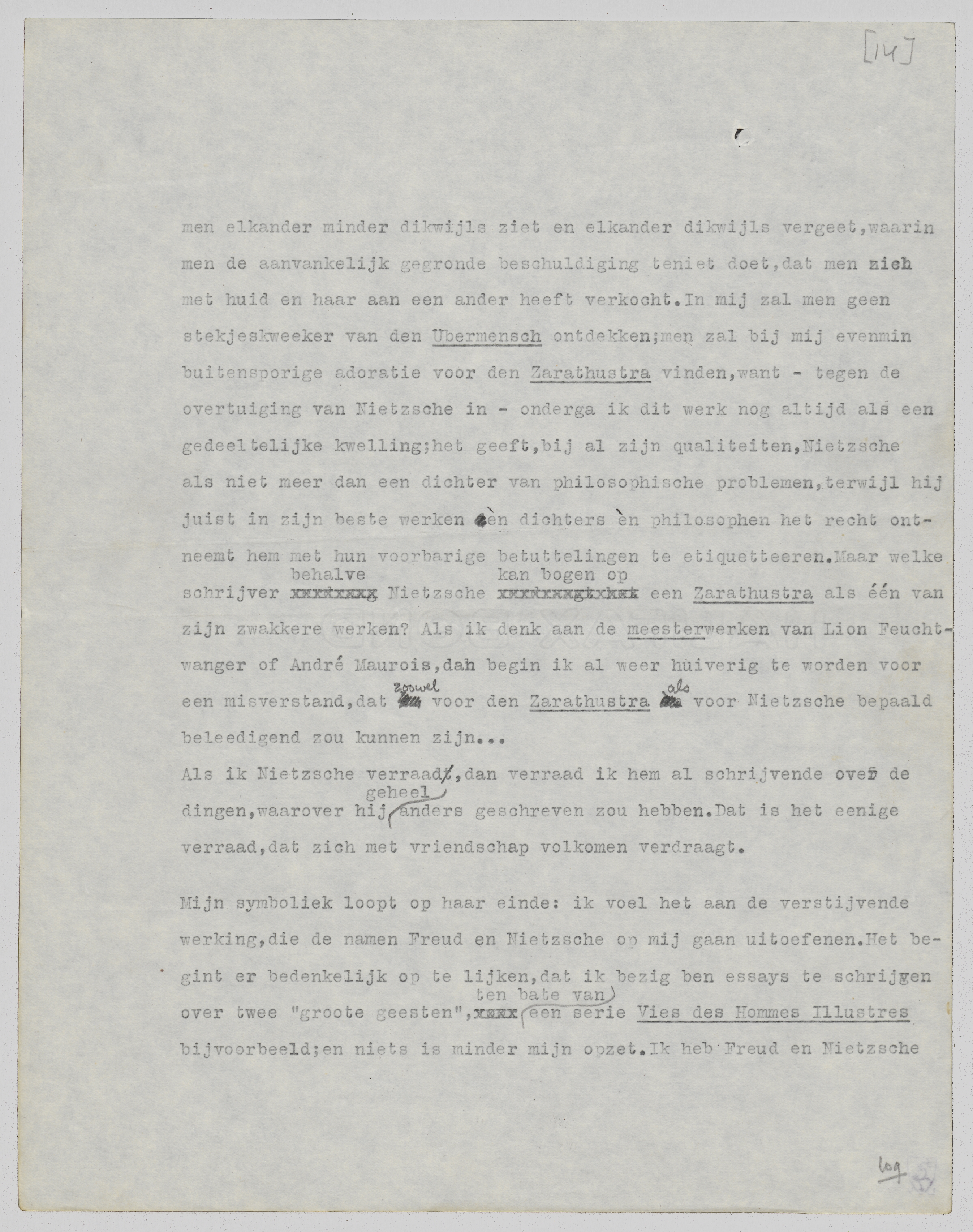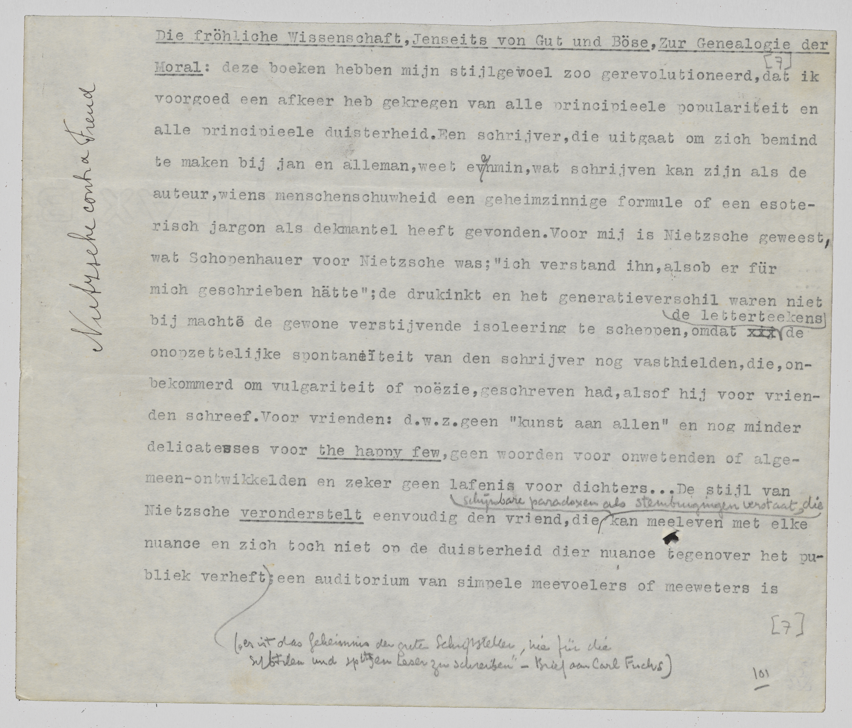 Als ik Nietzsche verraad, dan verraad ik hem al schrijvende over de dingen, waarover hij geheel anders geschreven zou hebben. Dat is het eenige verraad, dat zich met vriendschap volkomen verdraagt.