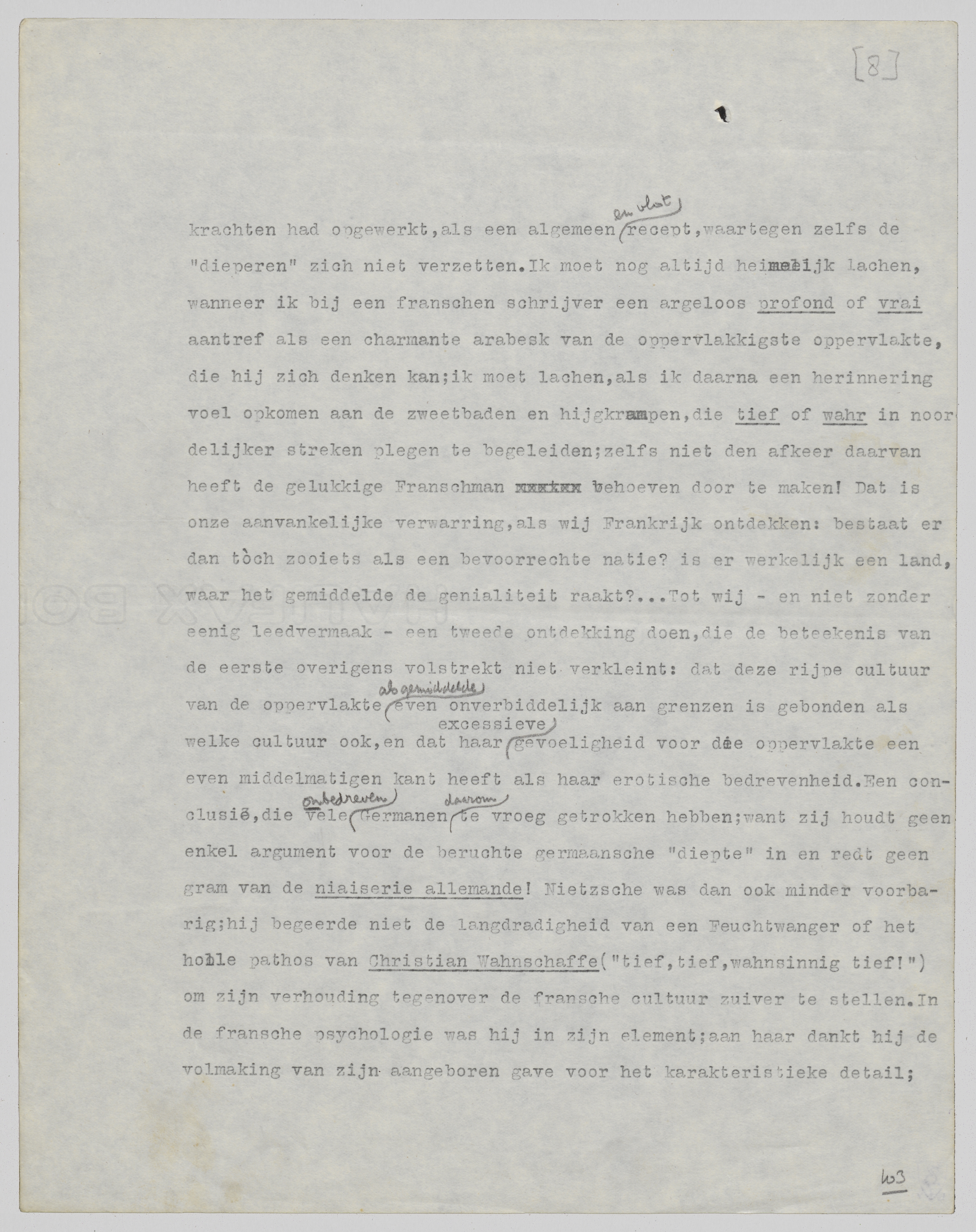 arabesk van de oppervlakkigste oppervlakte, die hij zich denken kan; ik moet lachen, als ik daarna een herinnering voel opkomen aan de zweetbaden en hijgkrampen, die tief of wahr in noordelijker streken plegen te begeleiden; zelfs niet den afkeer daarvan heeft de gelukkige Franschman behoeven door te maken! Dat is onze aanvankelijke verwarring, als wij Frankrijk ontdekken: bestaat er dan tòch zooiets als een bevoorrechte natie? is er werkelijk een land, waar het gemiddelde de genialiteit raakt?... Tot wij - en niet zonder eenig leedvermaak - een tweede ontdekking doen, die de beteekenis van de eerste overigens volstrekt niet verkleint: dat deze rijpe cultuur van de oppervlakte als gemiddelde even onverbiddelijk aan grenzen is gebonden als welke cultuur ook, en dat haar excessieve gevoeligheid voor die oppervlakte een even middelmatigen kant heeft als haar erotische bedrevenheid. Een conclusie, die vele Germanen daarom te vroeg getrokken hebben; want zij houdt geen enkel argument voor de beruchte germaansche ‘diepte’ in en redt geen gram van de niaiserie allemande! Nietzsche was dan ook minder voorbarig; hij begeerde niet de langdradigheid van een Feuchtwanger of het holle pathos van Christian Wahnschaffe (‘tief, tief, wahnsinnig tief!’) om zijn verhouding tegenover de fransche cultuur zuiver te stellen. In de fransche psychologie was hij in zijn element; aan haar dankt hij de volmaking van zijn aangeboren gave voor het karakteristieke detail; hij is een epigoon, als men hem soms als epigoon