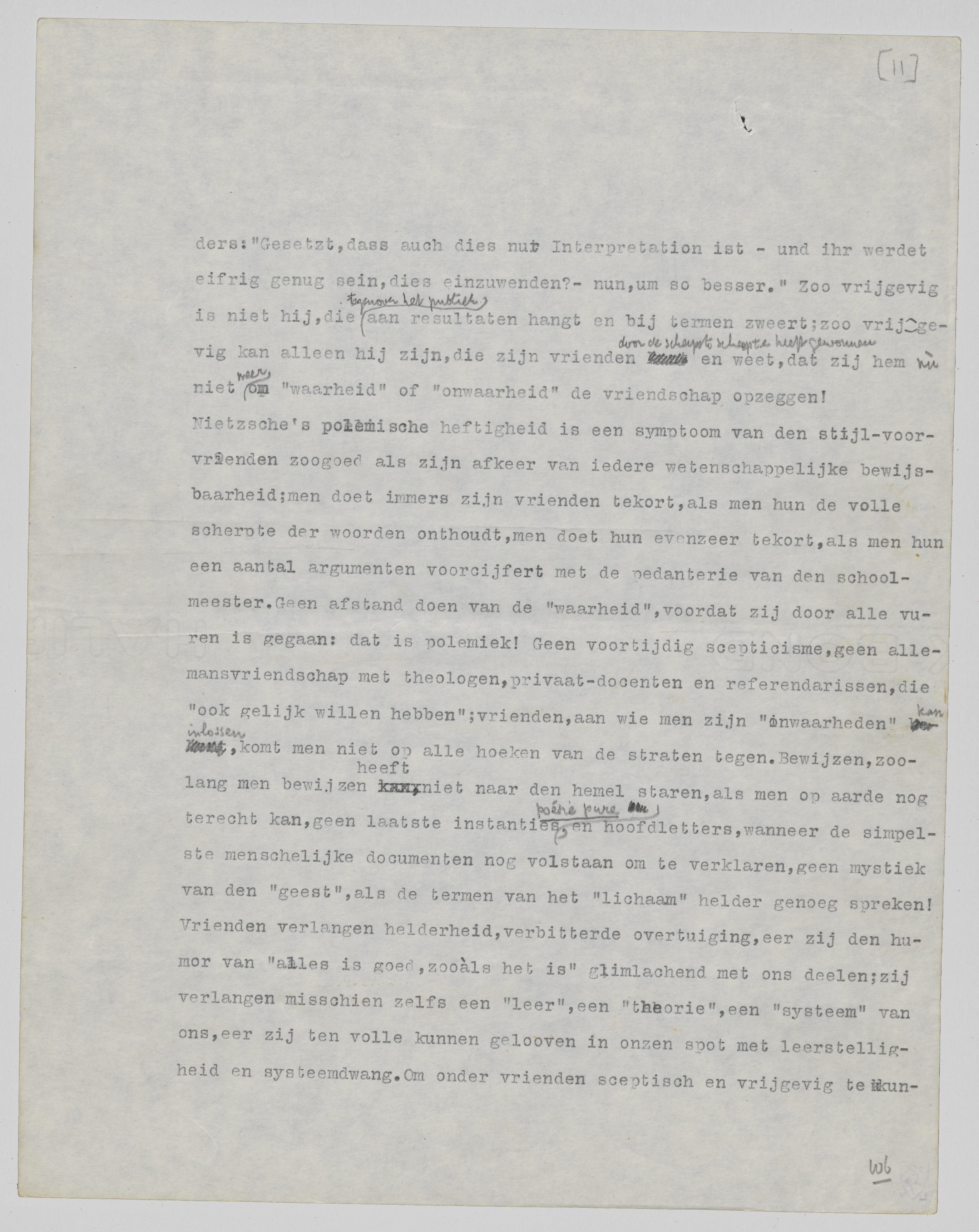 Nietzsche's polemische heftigheid is een symptoom van den stijl-voor-vrienden zoogoed als zijn afkeer van iedere wetenschappelijke bewijsbaarheid; men doet immers zijn vrienden tekort, als men hun de voile scherpte der woorden onthoudt, men doet hun evenzeer tekort, als men hun een aantal argumenten voorcijfert met de pedanterie van den school-
