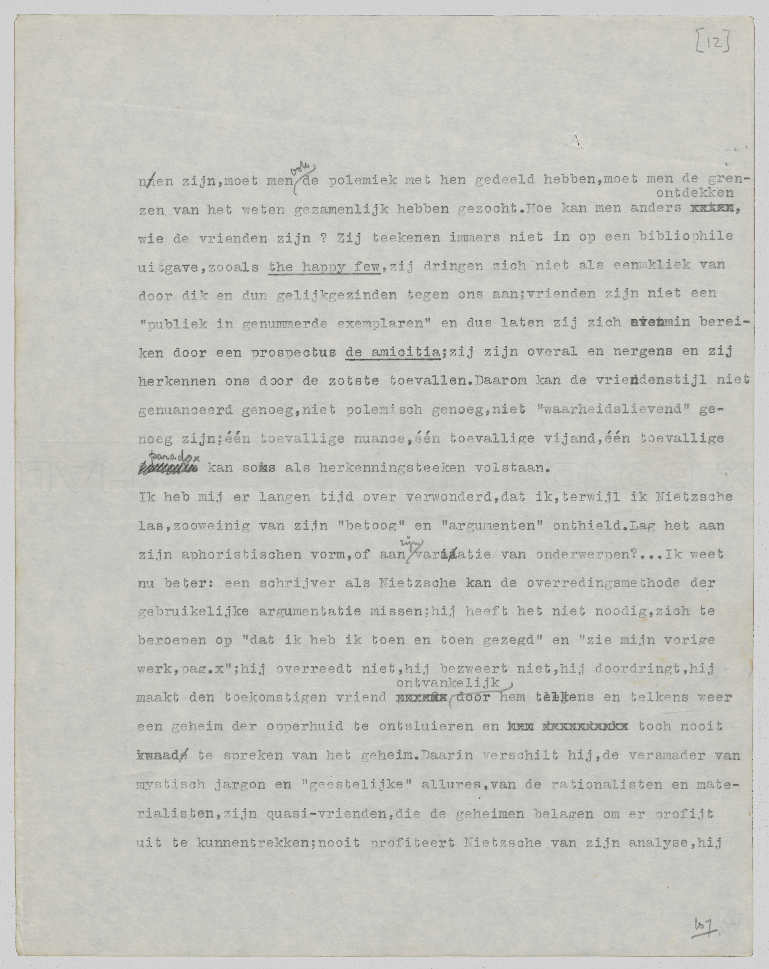 amicitia; zij zijn overal en nergens en zij herkennen ons door de zotste toevallen. Daarom kan de vriendenstijl niet genuanceerd genoeg, niet polemisch genoeg, niet ‘waarheidslievend’ genoeg zijn; één toevallige nuance, één toevallige vijand, één toevallige formule kan soms als herkenningsteeken volstaan.