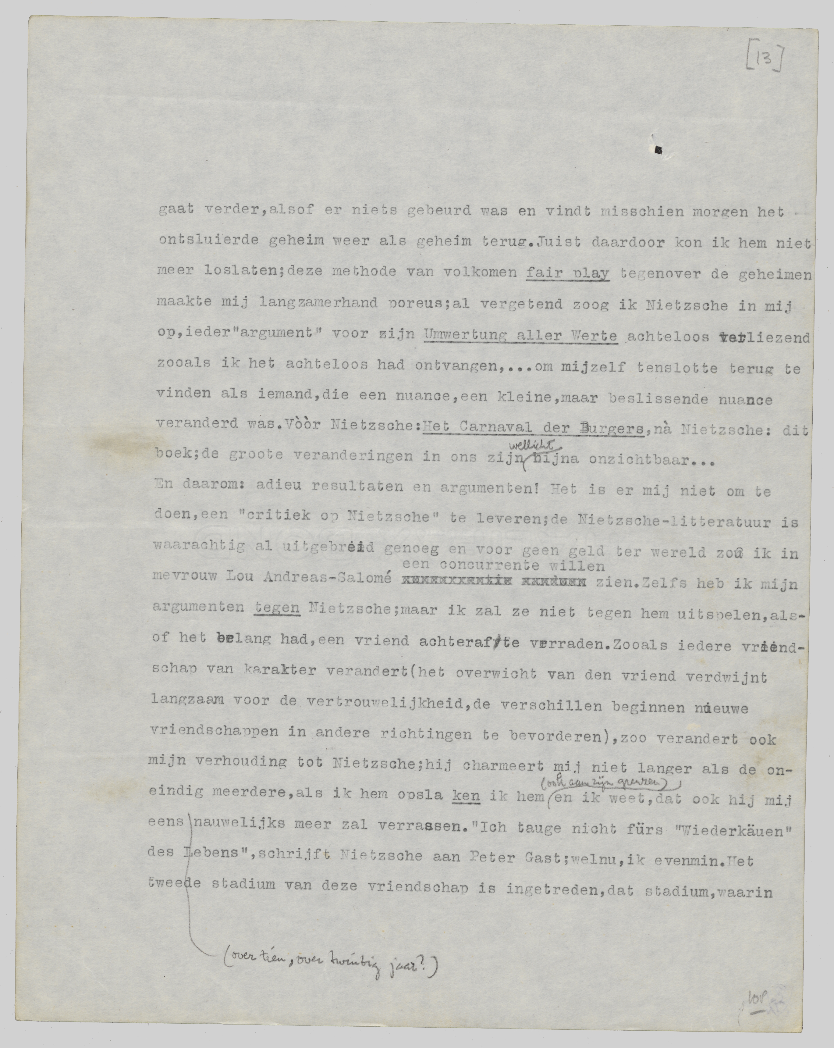 En daarom: adieu resultaten en argumenten! Het is er mij niet om te doen, een ‘critiek op Nietzsche’ te leveren; de Nietzsche-litteratuur is waarachtig al uitgebreid genoeg en voor geen geld ter wereld zou ik in mevrouw Lou Andreas - Salomé een concurrente willen zien. Zelfs heb ik mijn argumenten tegen Nietzsche; maar ik zal ze niet tegen hem uitspelen, alsof het belang had, een vriend achteraf te verraden. Zooals iedere vriendschap van karakter verandert (het overwicht van den vriend verdwijnt langzaam voor de vertrouwelijkheid, de verschillen beginnen nieuwe vriendschappen in andere richtingen te bevorderen), zoo verandert ook mijn verhouding tot Nietzsche; hij charmeert mij niet langer als de oneindig meerdere, als ik hem opsla ken ik hem (ook aan zijn grenzen) en ik weet, dat ook hij mij eens nauwelijks meer zal verrassen. ‘Ich tauge nicht fürs “Wiederkäuen” des Lebens’, schrijft Nietzsche aan Peter Gast; welnu, ik evenmin. Het tweede stadium van deze vriendschap is ingetreden, dat stadium, waarin men elkander minder dikwijls ziet