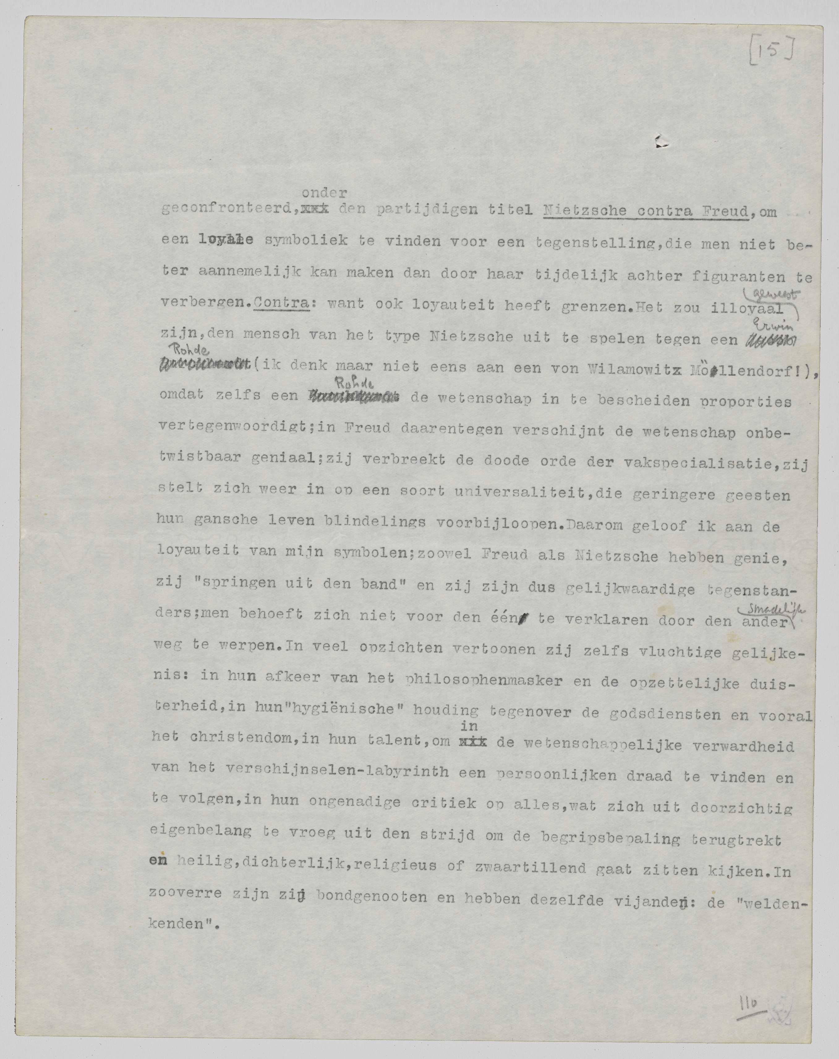 schrijven over twee ‘groote geesten’, ten bate van een serie Vies des Hommes Illustres bijvoorbeeld; en niets is minder mijn opzet. Ik heb Freud en Nietzsche geconfronteerd, onder den partijdigen titel Nietzsche contra Freud, om een loyale symboliek te vinden voor een tegenstelling, die men niet beter aannemelijk kan maken dan door haar tijdelijk achter figuranten te verbergen. Contra: want ook loyauteit heeft grenzen. Het zou illoyaal geweest zijn, den mensch van het type Nietzsche uit te spelen tegen een Erwin Rohde (ik denk maar niet eens aan een von Wilamowitz Moellendorf!), omdat zelfs een Rohde de wetenschap in te bescheiden proporties vertegenwoordigt; in Freud daarentegen verschijnt de wetenschap onbetwistbaar geniaal; zij verbreekt de doode orde der vakspecialisatie, zij stelt zich weer in op een soort universaliteit, die geringere geesten hun gansche leven blindelings voorbijloopen. Daarom geloof ik aan de loyauteit van mijn symbolen; zoowel Freud als Nietzsche hebben genie, zij ‘springen uit den band’ en zij zijn dus gelijkwaardige tegenstanders; men behoeft zich niet voor den één te verklaren door den ander smadelijk weg te werpen. In veel opzichten vertoonen zij zelfs vluchtige gelijkenis: in hun afkeer van het philosophenmasker en de opzettelijke duisterheid, in hun ‘hygiënische’ houding tegenover de godsdiensten en vooral het christendom, in hun talent, om in de wetenschappelijke verwardheid van het verschijnselen-labyrint een persoonlijken draad te vinden en te volgen, in