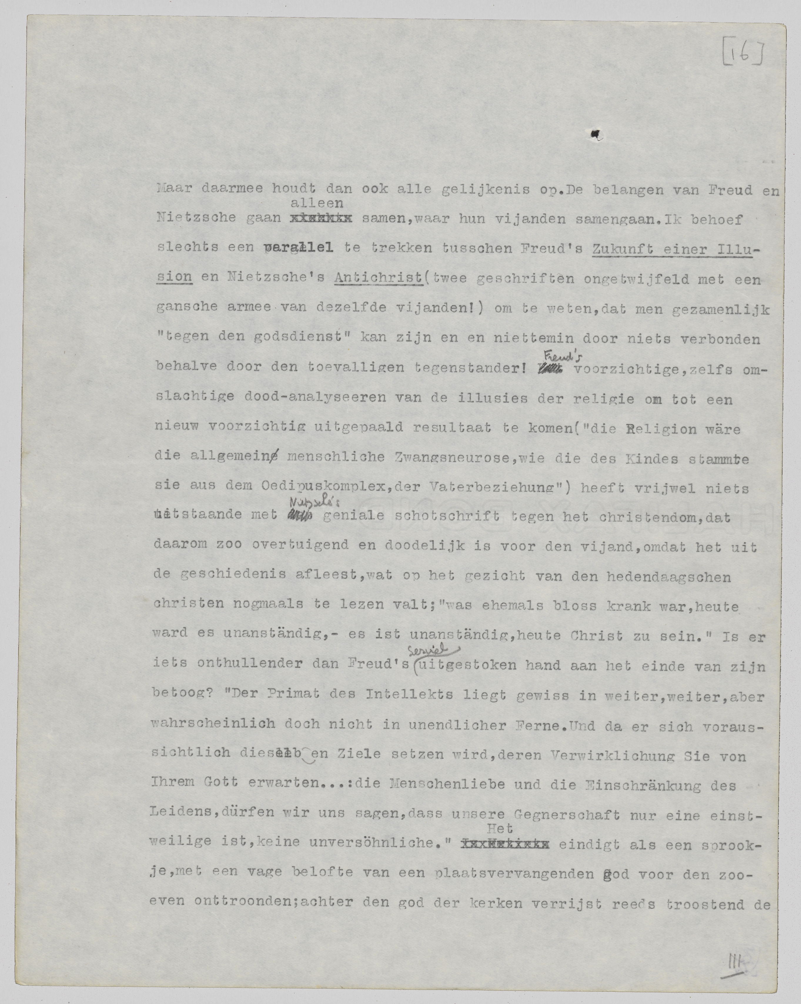 Maar daarmee houdt dan ook alle gelijkenis op. De belangen van Freud en Nietzsche gaan alleen samen, waar hun vijanden samengaan. Ik behoef slechts een parallel te trekken tusschen Freud's Zukunft einer Illusion en Nietzsche's Antichrist (twee geschriften ongetwijfeld met een gansche armee van dezelfde vijanden!) om te weten, dat men gezamenlijk ‘tegen den godsdienst’ kan zijn en niettemin door niets verbonden behalve door den toevalligen tegenstander! Het voorzichtige, zelfs omslachtige dood-analyseeren van de illusies der religie om tot een nieuw voorzichtig uitgepaald resultaat te komen (‘die Religion wäre die allgemein menschliche Zwangsneurose, wie die des Kindes stammte sie aus dem Oedipuskomplex, der Vaterbeziehung’) heeft vrijwel niets uitstaande met Nietzsche's geniale schotschrift tegen het christendom, dat daarom zoo overtuigend en doodelijk is voor den vijand, omdat het uit de geschiedenis afleest, wat op het gezicht van den hedendaagschen christen nogmaals te lezen valt; ‘was ehemals bloss krank war, heute ward es unanständig, - es ist unanständig, heute Christ zu sein.’ Is er iets onthullender dan Freud's serviel uitgestoken hand aan het einde van zijn betoog?