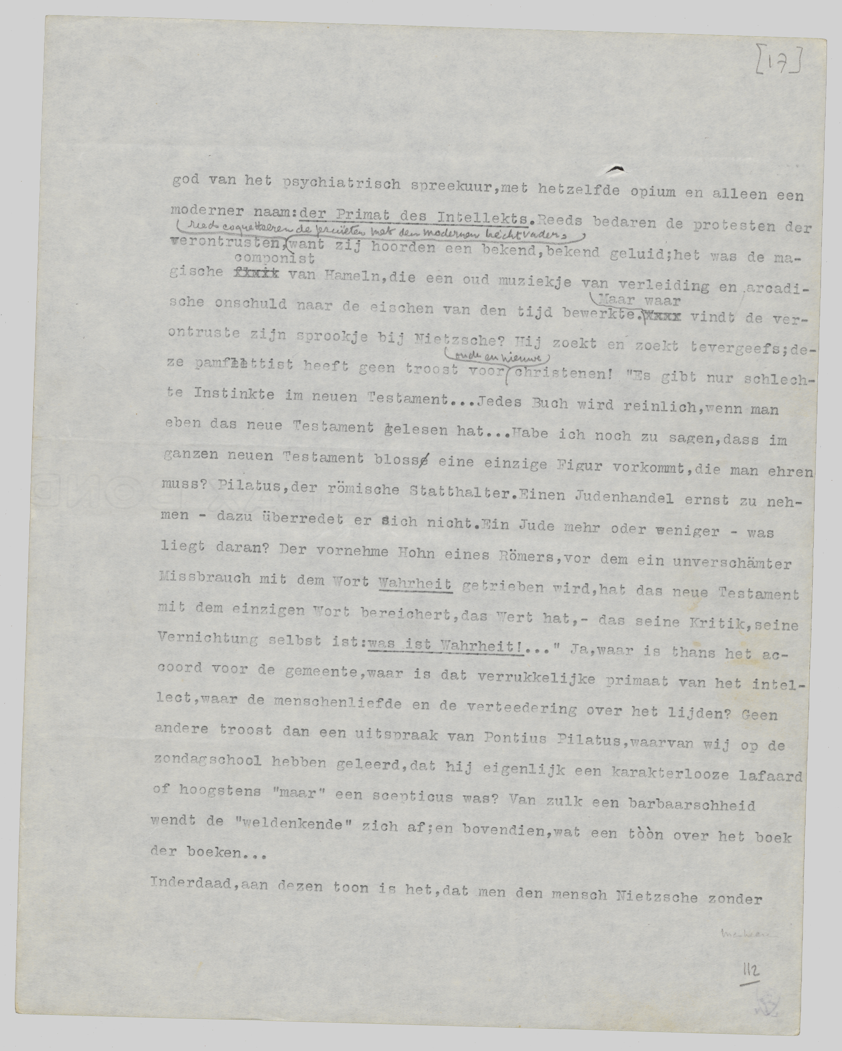 - was liegt daran?2 Der vornehme Hohn eines Römers, vor dem ein unverschämter Missbrauch mit dem Wort Wahrheit getrieben wird, hat das neue Testament mit dem einzigen Wort bereichert, das Wert hat, - das seine Kritik, seine Vernichtung selbst ist: was ist Wahrheit!....’ Ja, waar is thans het accoord voor de gemeente, waar is dat verrukkelijke primaat van het intellect, waar de menschenliefde en de verteedering over het lijden? Geen andere troost dan een uitspraak van Pontius Pilatus, waarvan wij op de zondagschool hebben geleerd, dat hij eigenlijk een karakterlooze lafaard of hoogstens ‘maar’ een scepticus was? Van zulk een barbaarschheid wendt de ‘weldenkende’ zich af; en bovendien, wat een tóón over het boek der boeken...
