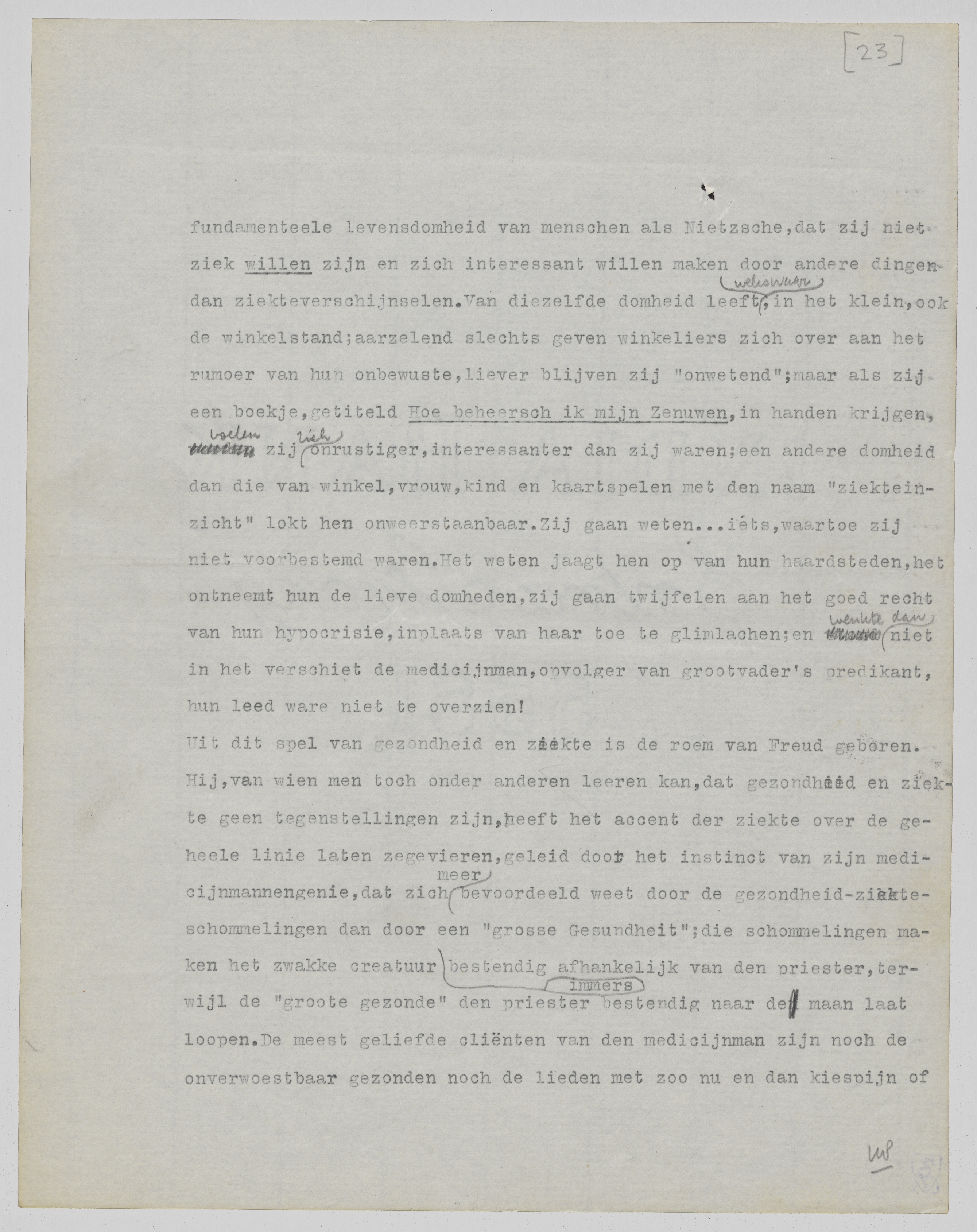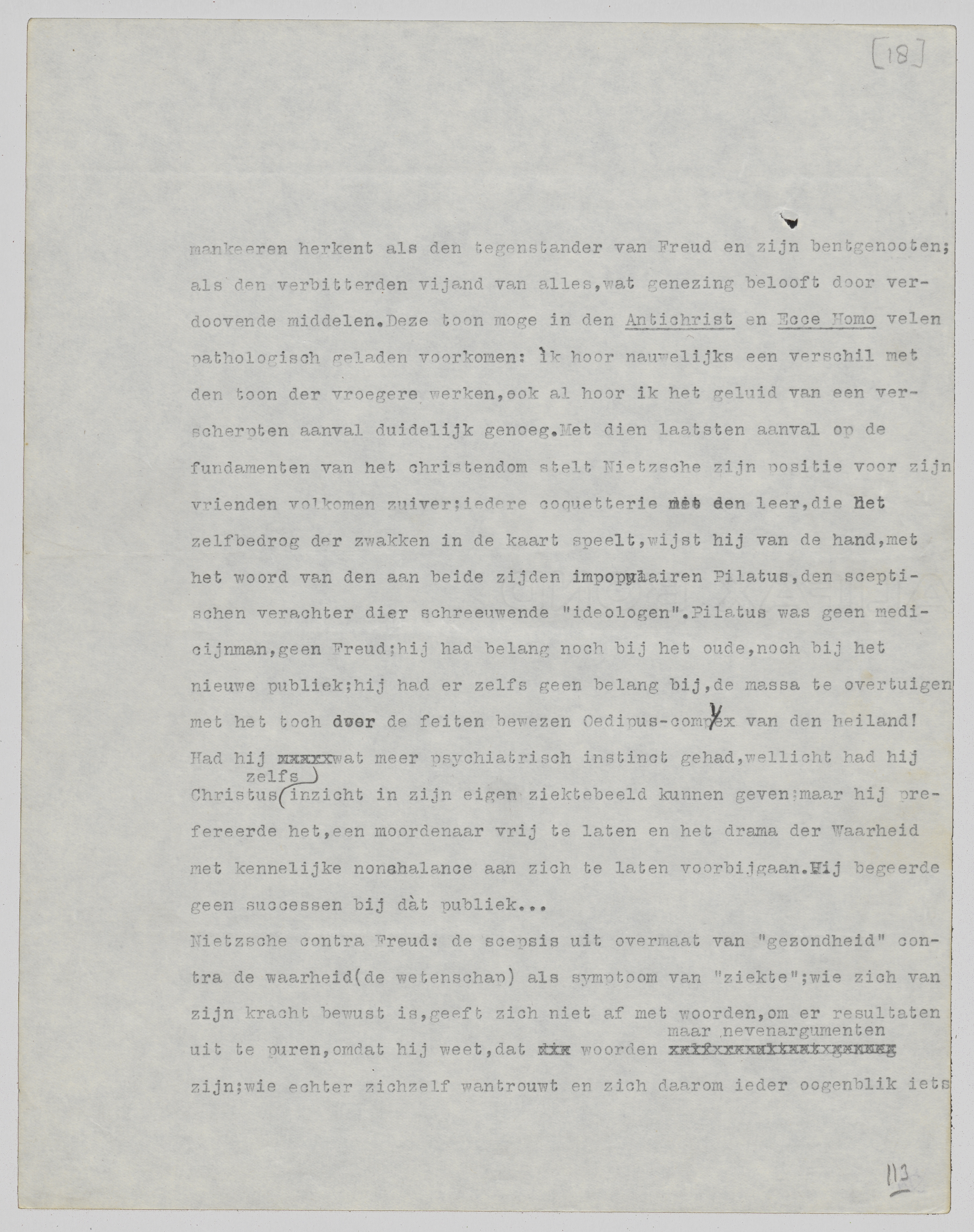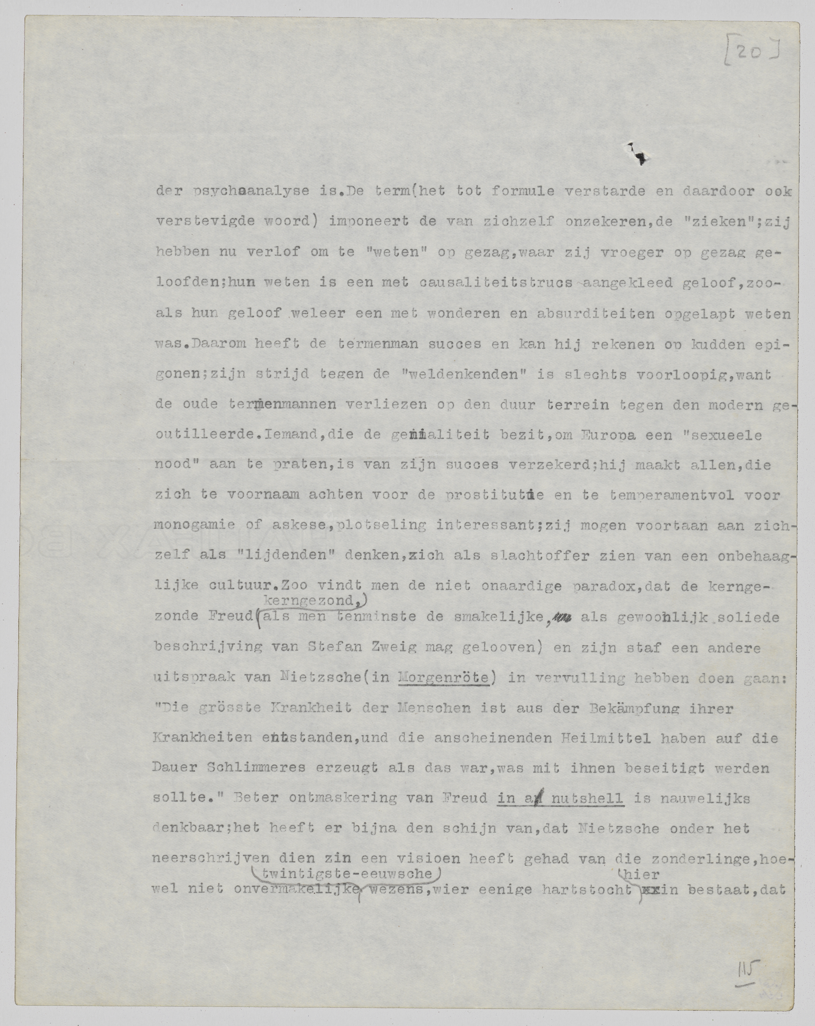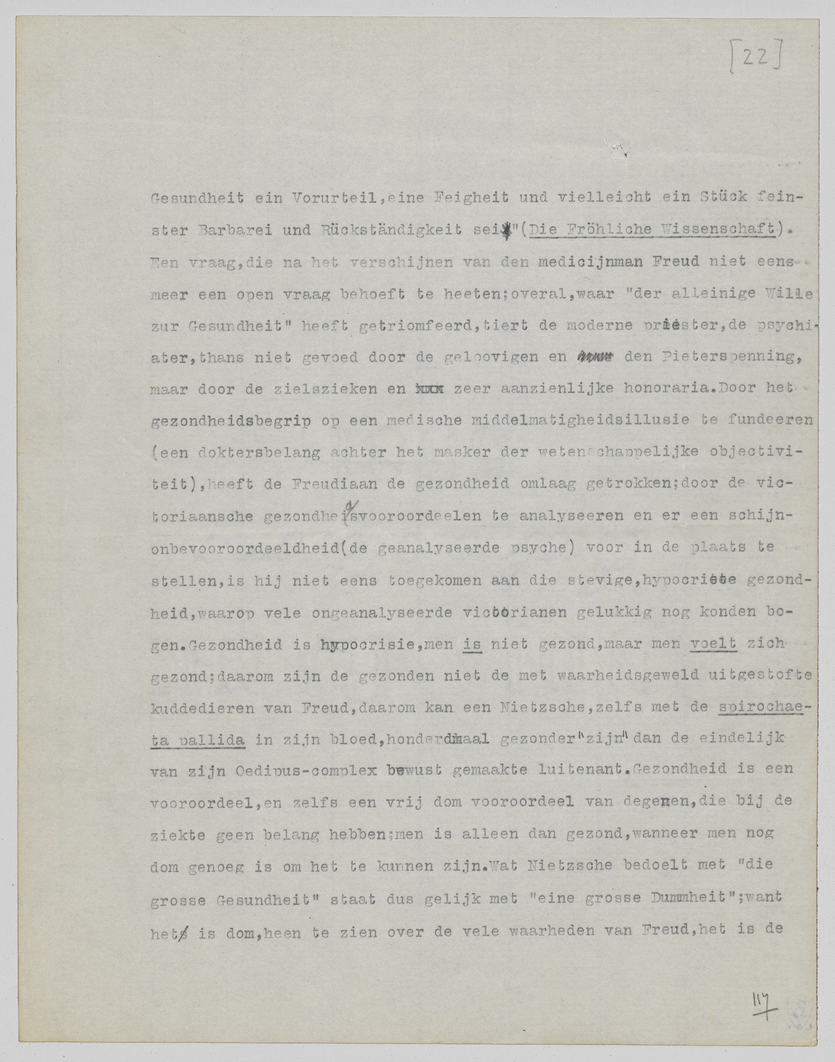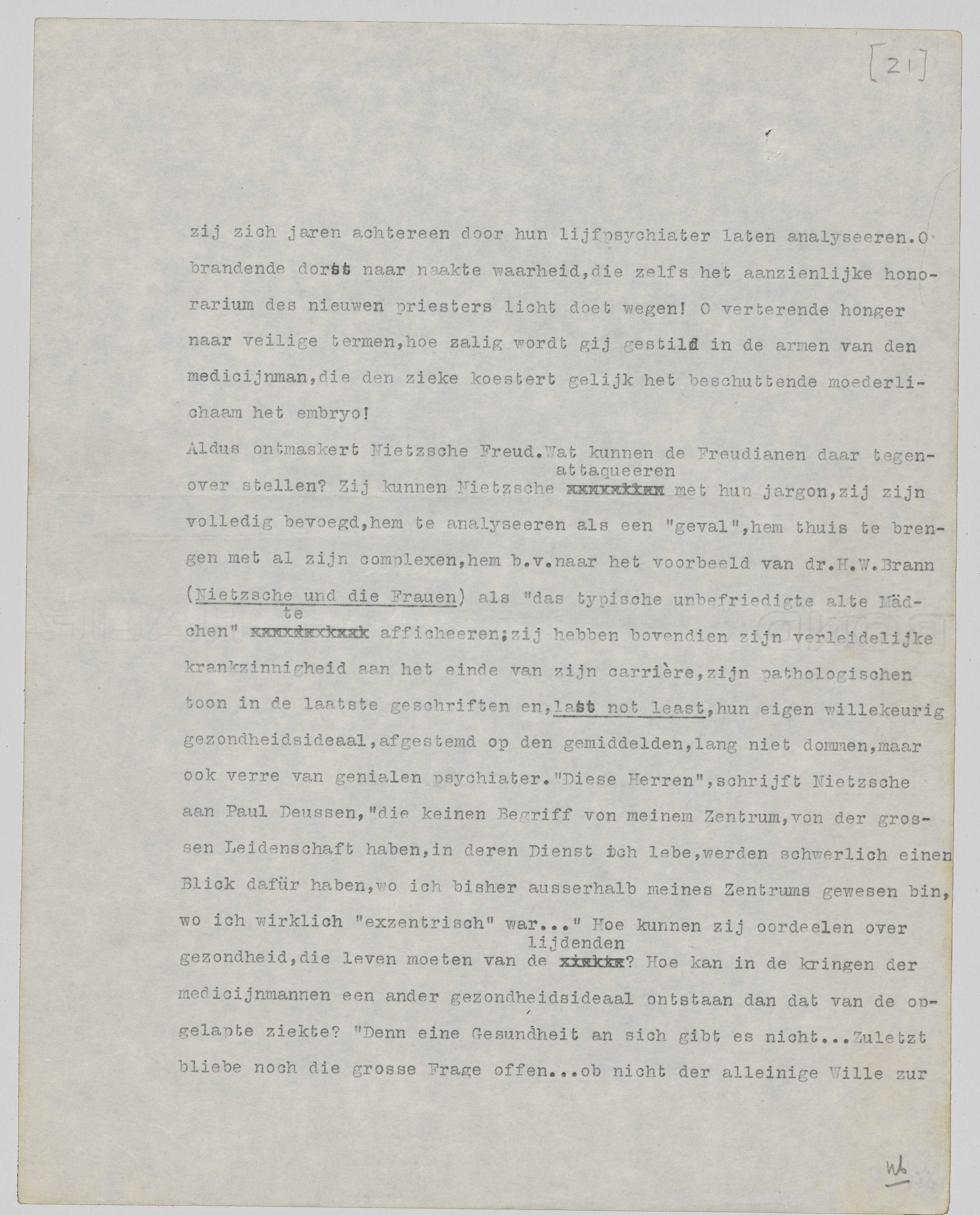 Aldus ontmaskert Nietzsche Freud. Wat kunnen de Freudianen daar tegenover stellen? Zij kunnen Nietzsche attaqueeren met hun jargon, zij zijn volledig bevoegd, hem te analyseeren als een ‘geval’, hem thuis te brengen met al zijn complexen, hem b.v. naar het voorbeeld van dr. H.W. Brann (Nietzsche und die Frauen) als ‘das typische unbefriedigte alte Mädchen’ te afficheeren; zij hebben bovendien zijn verleidelijke krankzinnigheid aan het einde van zijn carrière, zijn pathologischen toon in de laatste geschriften en, last not least, hun eigen willekeurig gezondheidsideaal, afgestemd op den gemiddelden, lang niet dommen, maar ook verre van genialen psychiater. ‘Diese Herren’, schrijft Nietzsche aan Paul Deussen, ‘die keinen Begriff von meinem Zentrum, von der grossen Leidenschaft haben, in deren Dienst ich lebe, werden schwerlich einen Blick dafër haben, wo ich bisher ausserhalb meines Zentrums gewesen bin, wo ich wirklich “exzentrisch” war...’ Hoe kunnen zij oordeelen over gezondheid, die leven moeten van de lijdenden?