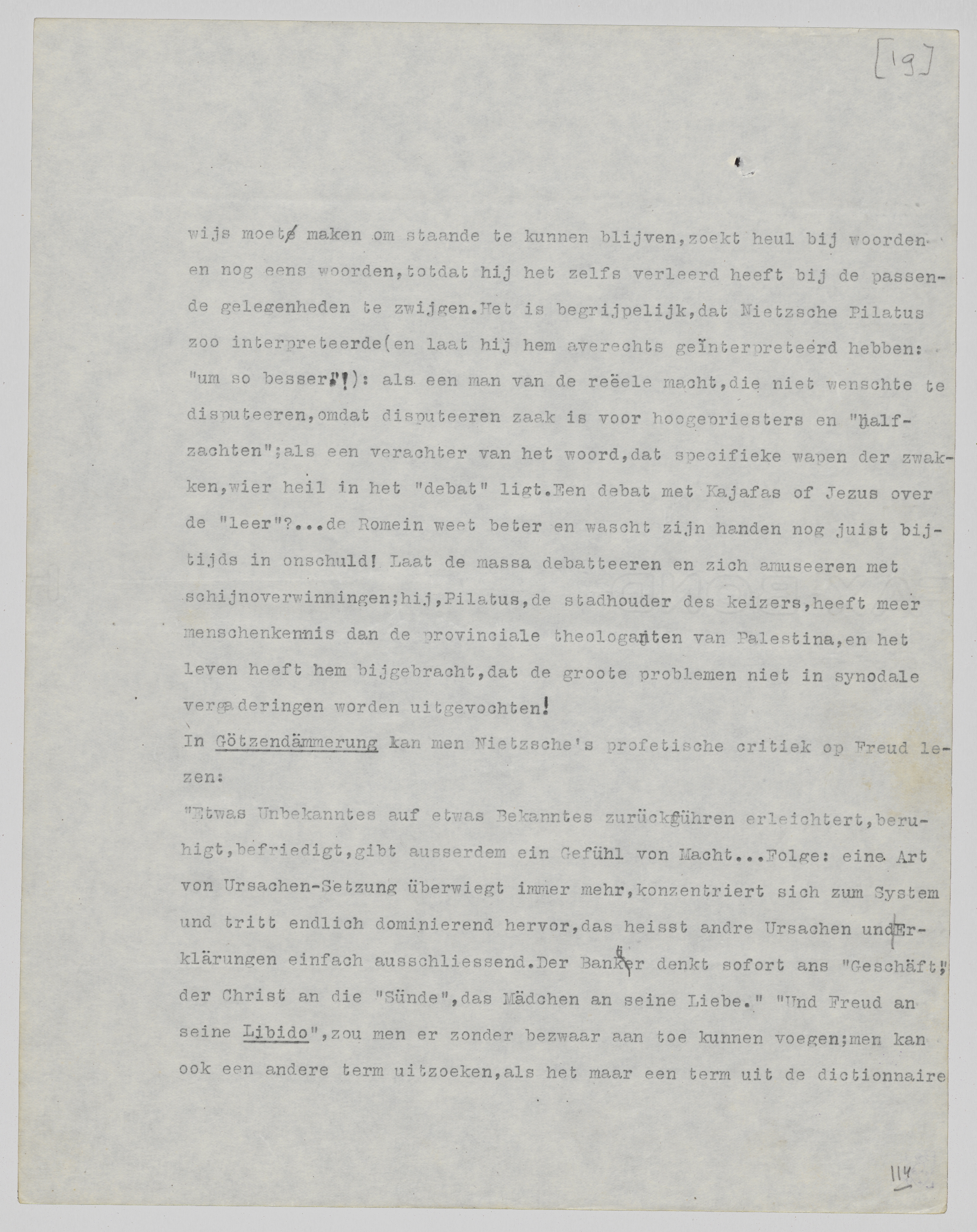 Nietzsche contra Freud: de scepsis uit overmaat van ‘gezondheid’ contra de waarheid (de wetenschap) als symptoom van ‘ziekte’; wie zich van zijn kracht bewust is, geeft zich niet af met woorden, om er resultaten uit te puren, omdat hij weet, dat woorden maar nevenargumenten zijn; wie echter zichzelf wantrouwt en zich daarom ieder oogenblik iets wijs moet maken om staande te kunnen blijven, zoekt heul bij woorden en nog eens woorden, totdat hij het zelfs verleerd heeft bij de passende gelegenheden te zwijgen. Het is begrijpelijk, dat Nietzsche Pilatus zoo interpreteerde (en laat hij hem averechts geïnterpreteerd hebben: ‘um so besser’): als een