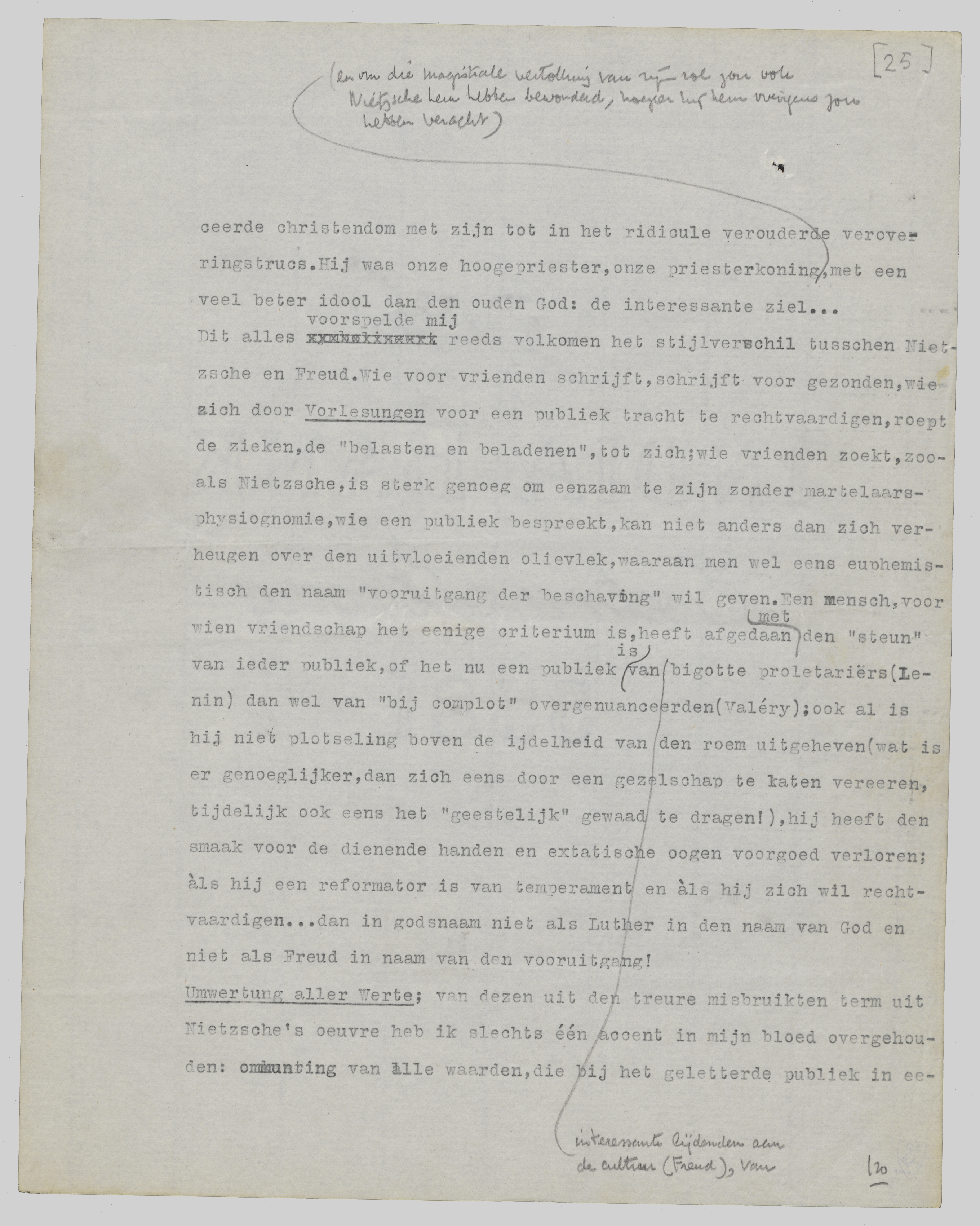 ladenen’, tot zich; wie vrienden zoekt, zooals Nietzsche, is sterk genoeg om eenzaam te zijn zonder martelaarsphysiognomie, wie een publiek bespreekt, kan niet anders dan zich verheugen over de uitvloeiende olievlek, waaraan men wel eens euphemistisch den naam ‘vooruitgang der beschaving’ wil geven. Een mensch, voor wien vriendschap het eenige criterium is, heeft afgedaan met den ‘steun’ van ieder publiek, of het nu een publiek is van interessante lijdenden aan de cultuur, van bigotte proletariërs (Lenin) dan wel van ‘bij complot’ overgenuanceerden (Valéry); ook al is hij niet plotseling boven de ijdelheid van den roem uitgeheven (wat is er genoeglijker, dan zich eens door een gezelschap te laten vereeren, tijdelijk ook eens het ‘geestelijk’ gewaad te dragen!), hij heeft den smaak voor de dienende handen en extatische oogen voorgoed verloren; àls hij een reformator is van temperament en àls hij zich wil rechtvaardigen... dan in godsnaam niet als Luther in den naam van God en niet als Freud in naam van den vooruitgang!