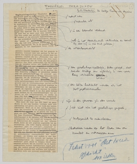 tallisatie’ te laten vallen, wanneer het aan geen persoonlijke werkelijkheid meer... beant ‘woordt’. Het ligt, dunkt mij, voor de hand, dat deze genegenheid voor de paradox, die voorkomt uit de laatste consequenties der woorden zelf, iets geheel anders dan, of liever: precies het tegendeel is van het spelletje vangbal van het type, dat ik eerst schetste. In het eerste geval is de paradox het vuurwerk, met bombarie afgestoken ter eere van de autoriteit, die men zich heeft verworven; in het laatste geval is het de autoriteit zelf, die ‘in vlammen opgaat’, d.w.z. zich onophoudelijk moet vernieuwen en verjongen om autoriteit te kunnen blijven. En derhalve zullen deze twee verschillende typen van paradoxale menschen lijnrecht tegenover elkaar staan... met niets anders dan het woord ‘paradox’ als gemeenschappelijk bezit! Met dit gemeenschappelijk bezit zullen zij elkaar bestrijden en elkaar het recht op de paradox betwisten: dat is nog de allerbeste paradox... Beschouwt men Chesterton als een vertegenwoordiger van het paradoxale menschentype van de eerste kategorie, dan is zijn katholieke zendingsgeest (en in dit speciale geval zijn voorliefde voor den katholieken denker Thomas van Aquino) minder zonderling dan men op het eerste gezicht geneigd zou zijn te denken. Zonder eenigen twijfel is Chesterton een beweeglijke, amusante en spitsvondige geest, wiens paradoxen in veel gevallen raak zijn; hij is in enkele opzichten te vergelijken met den Nederlandschen katholieken essayist Anton van Duinkerken, die ook dikwijls beweeglijk, amusant en spitsvondig kan zijn, al gaat zijn durf nog aanzienlijk minder ver dan die van zijn En-