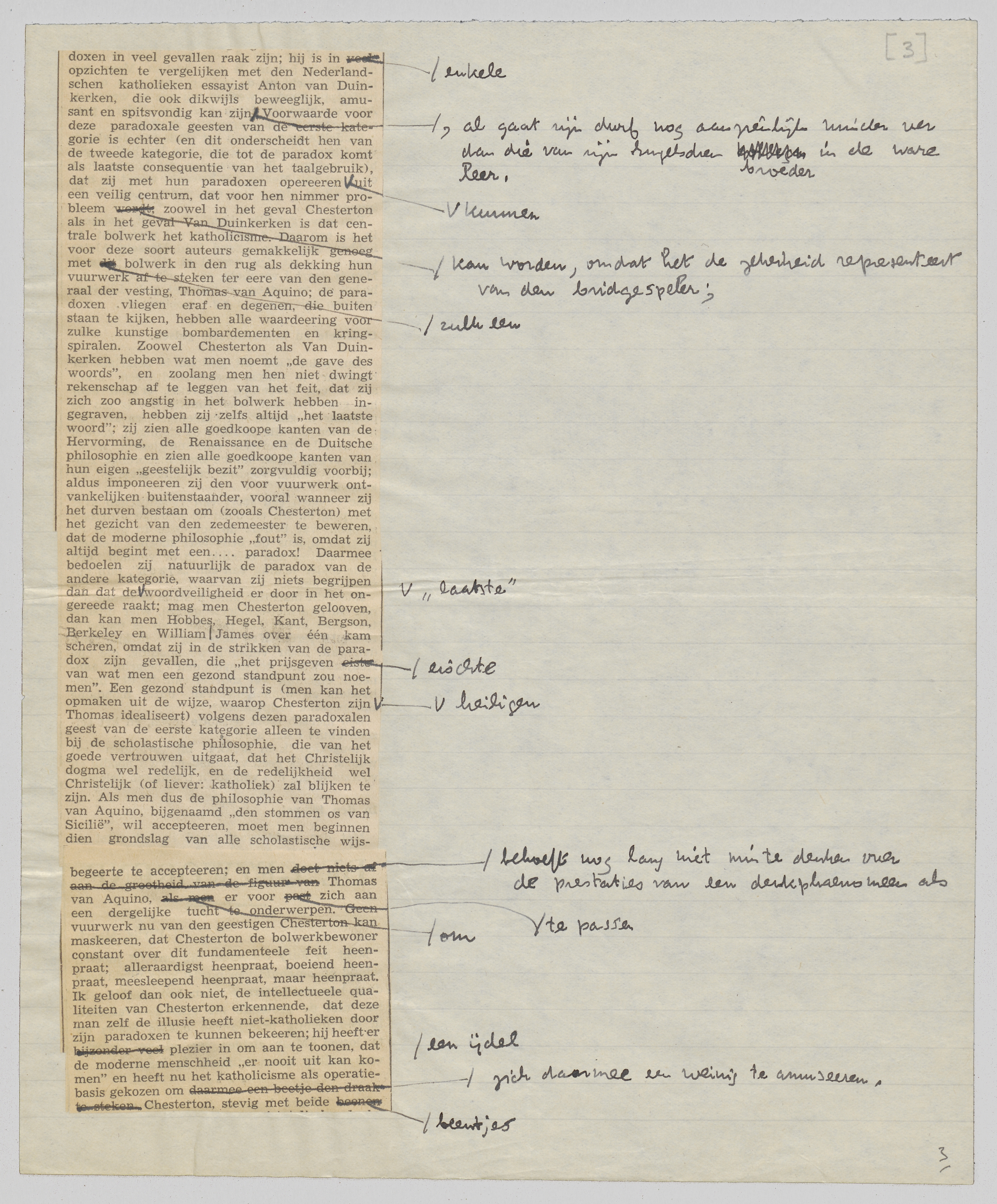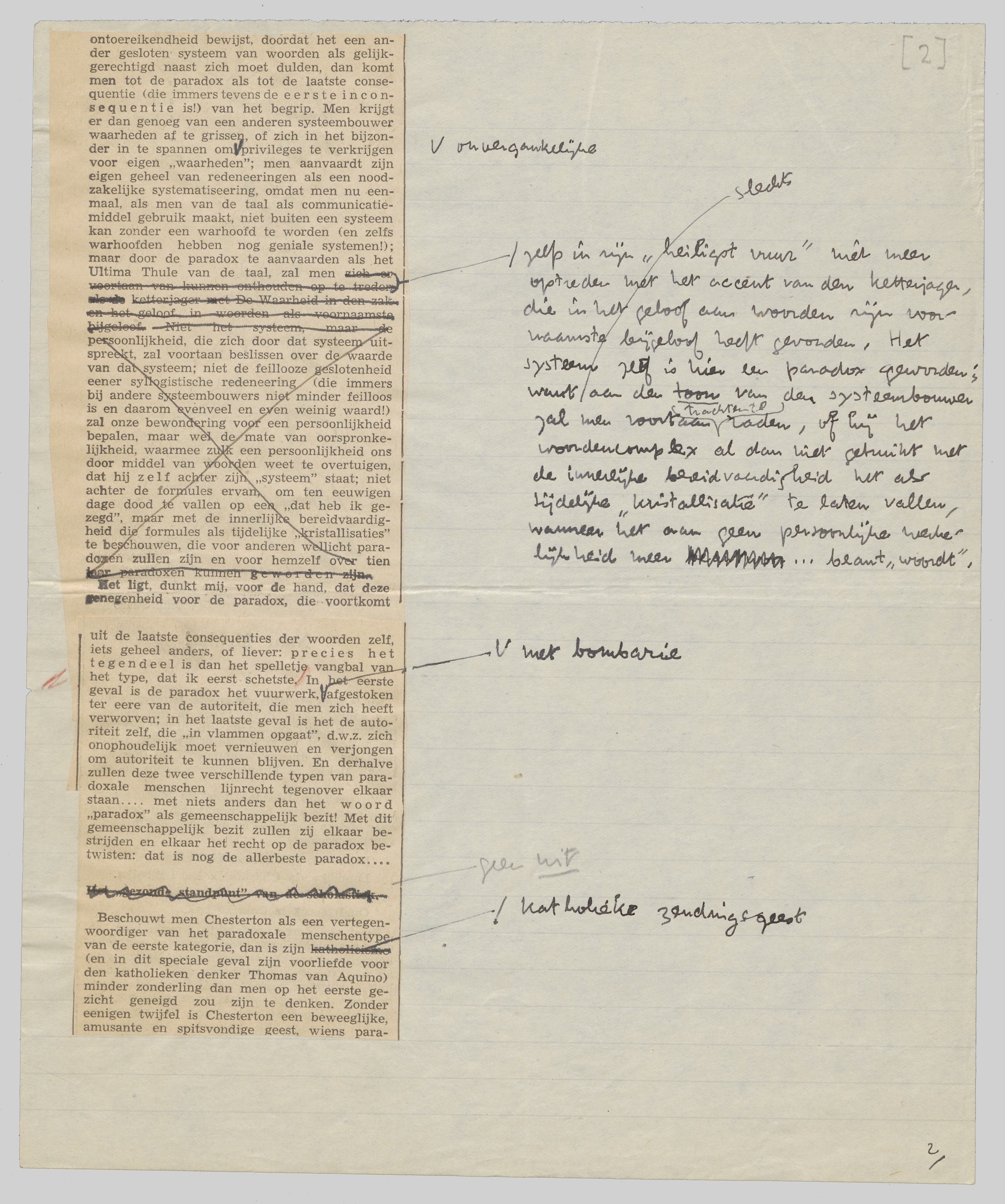 De geheele heer Chesterton heeft als apologeet van Thomas eigenlijk slechts één fout; die fout is zijn geboortebewijs, dat in de negentiende eeuw moet zijn verstrekt aan twee ouders, wier groote vergissing het was, dat zij in die eeuw paarden en aldus een zoon verwekten. En daarom wil Chesterton, die aan de consequentie van deze vergissing niet ontkomen kan, te veel bewijzen; als hij er mee had volstaan de grootheid van Thomas als persoonlijkheid aan te toonen, zou hij meer hebben bereikt; want zoodra men het systeem beschouwt in het licht van de persoonlijkheid, die het ‘veroorzaakte’, krijgt men voor Thomas en zijn synthetische werkzaamheid een behoorlijk respect. Dat is Chesterton echter niet genoeg; zonder orthodox thomisme bestaat er voor hem ook geen Thomas; wat na Thomas kwam, was een misstap, d.w.z. een paradox; en dus moeten wij teruggeschroefd worden naar