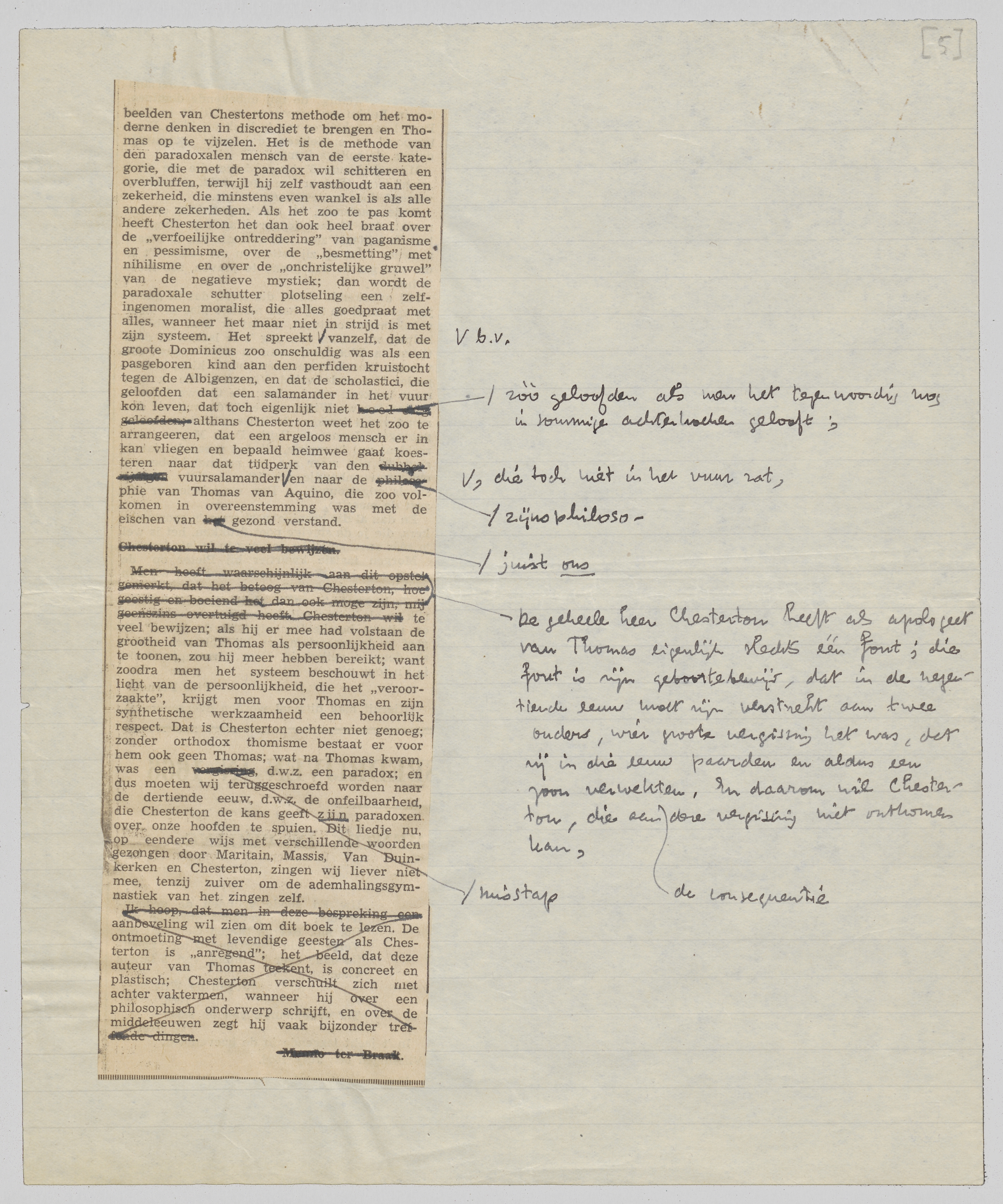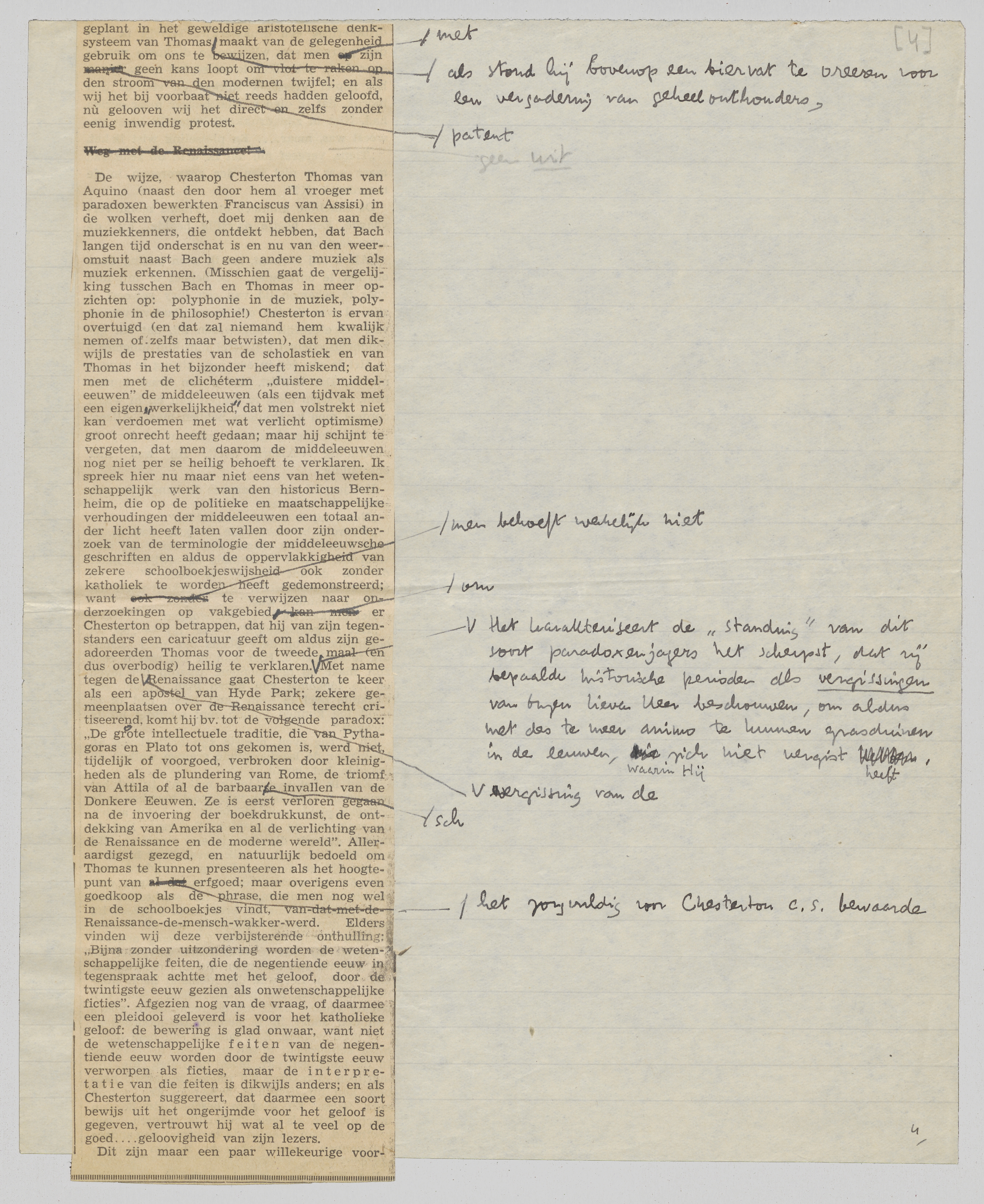 De wijze, waarop Chesterton Thomas van Aquino (naast den door hem al vroeger met paradoxen bewerkten Franciscus van Assisi) in de wolken verheft, doet mij denken aan de muziekkenners, die ontdekt hebben, dat Bach langen tijd onderschat is en nu van den weeromstuit naast Bach geen andere muziek als muziek erkennen. (Misschien gaat de vergelijking tusschen Bach en Thomas in meer opzichten op; polyphonie in de muziek, polyphonie in de philosophie!) Chesterton is ervan overtuigd (en dat zal niemand hem kwalijk nemen of zelfs maar betwisten), dat men dikwijls de prestaties van de scholastiek en van Thomas in het bijzonder heeft miskend; dat men met de cliché-term ‘duistere middeleeuwen’ de middeleeuwen (als een tijdvak met een eigen ‘werkelijkheid’, dat men volstrekt niet kan verdoemen met wat verlicht optimisme) groot onrecht heeft gedaan; maar hij schijnt te vergeten, dat men daarom de middeleeuwen nog niet per se heilig behoeft te verklaren. Ik spreek hier