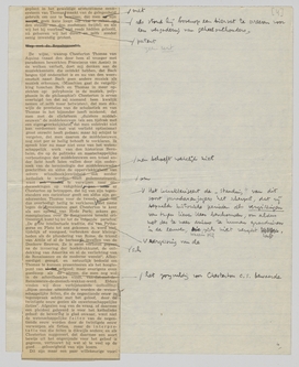 nu maar niet eens van het wetenschappelijk werk van den historicus Bernheim, die op de politieke en maatschappelijke verhoudingen der middeleeuwen een totaal ander licht heeft laten vallen door zijn onderzoek van de terminologie der middeleeuwsche geschriften en aldus de oppervlakkigheid van zekere schoolboekjeswijsheid ook zonder katholiek te worden heeft gedemonstreerd; want men behoeft werkelijk niet te verwijzen naar onderzoekingen op vakgebied om er Chesterton op te betrappen, dat hij van zijn tegenstanders een caricatuur geeft om aldus zijn geadoreerden Thomas voor de tweede maal (en dus overbodig) heilig te verklaren. Het karakteriseert de ‘standing’ van dit soort paradoxenjagers het scherpst, dat zij bepaalde historische perioden als vergissingen van Onzen Lieven Heer beschouwen, om aldus met des te meer animo te kunnen grasduinen in de eeuwen, waarin Hij zich niet vergist heeft. Met name tegen de vergissing van de Renaissance gaat Chesterton te keer als een apostel van Hyde Park; zekere gemeenplaatsen over de Renaissance terecht critiseerend, komt hij b.v. tot de volgende paradox: ‘De groote intellectueele traditie, die van Pythagoras en Plato tot ons gekomen is, werd niet, tijdelijk of voorgoed, verbroken door kleinigheden als de plundering van Rome, de triomf van Attila of al de barbaarsche invallen van de Donkere Eeuwen. Ze is eerst verloren gegaan na de invoering der boekdrukkunst, de ontdekking van Amerika en al de verlichting van de Renaissance en de moderne wereld’. Alleraardigst gezegd, en natuurlijk bedoeld om Thomas te kunnen presenteeren als het hoogtepunt