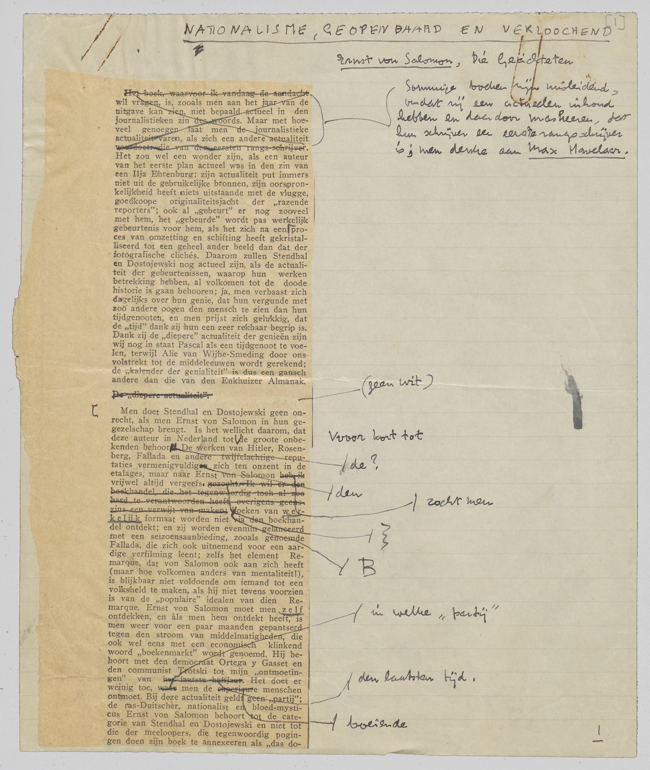 Men doet Stendhal en Dostojewski geen onrecht, als men Ernst von Salomon in hun gezelschap brengt. Is het wellicht daarom, dat deze auteur in Nederland tot voor kort tot de groote onbekenden behoorde? De werken van Hitler, Rosenberg, Fallada en andere twijfelachtige reputaties vermenigvulden zich ten onzent in de etalages, maar naar Ernst von Salomon zocht men vrijwel altijd vergeefs. Boeken van werkelijk formaat worden niet via den boekhandel ontdekt; en zij worden evenmin gelanceerd met een seizoensaanbieding, zooals genoemde Fallada, die zich ook uitnemend voor een aardige verfilming leent; zelfs het element Remarque, dat von Salomon ook aan zich heeft (maar hoe volkomen anders van mentaliteit!), is blijkbaar niet voldoende om iemand tot een volksheld te maken, als hij niet tevens voorzien is van de ‘populaire’ idealen van dien Remarque. Ernst von Salomon moet men zelf ontdekken, en àls men hem ontdekt heeft, is men weer voor een paar maanden gepantserd tegen den stroom van middelmatigheden, die ook wel eens met een economisch klinkend woord ‘boekenmarkt’ wordt genoemd. Hij behoort met den democraat Ortéga y Gasset en den communist Trotski tot mijn ‘ontmoetingen’ van den laatsten tijd. Het doet er weinig toe, in welke ‘partij’ men de boeiende menschen ontmoet. Bij deze actualiteit geldt geen ‘partij’; de ras-Duitscher, nationalist en bloed-mysticus Ernst von Salomon behoort tot de kategorie van Stendhal en Dostojewski en niet tot die der meeloopers, die tegenwoordig pogingen doen zijn boek te annexeeren als ‘das dokumentarische Werk über die