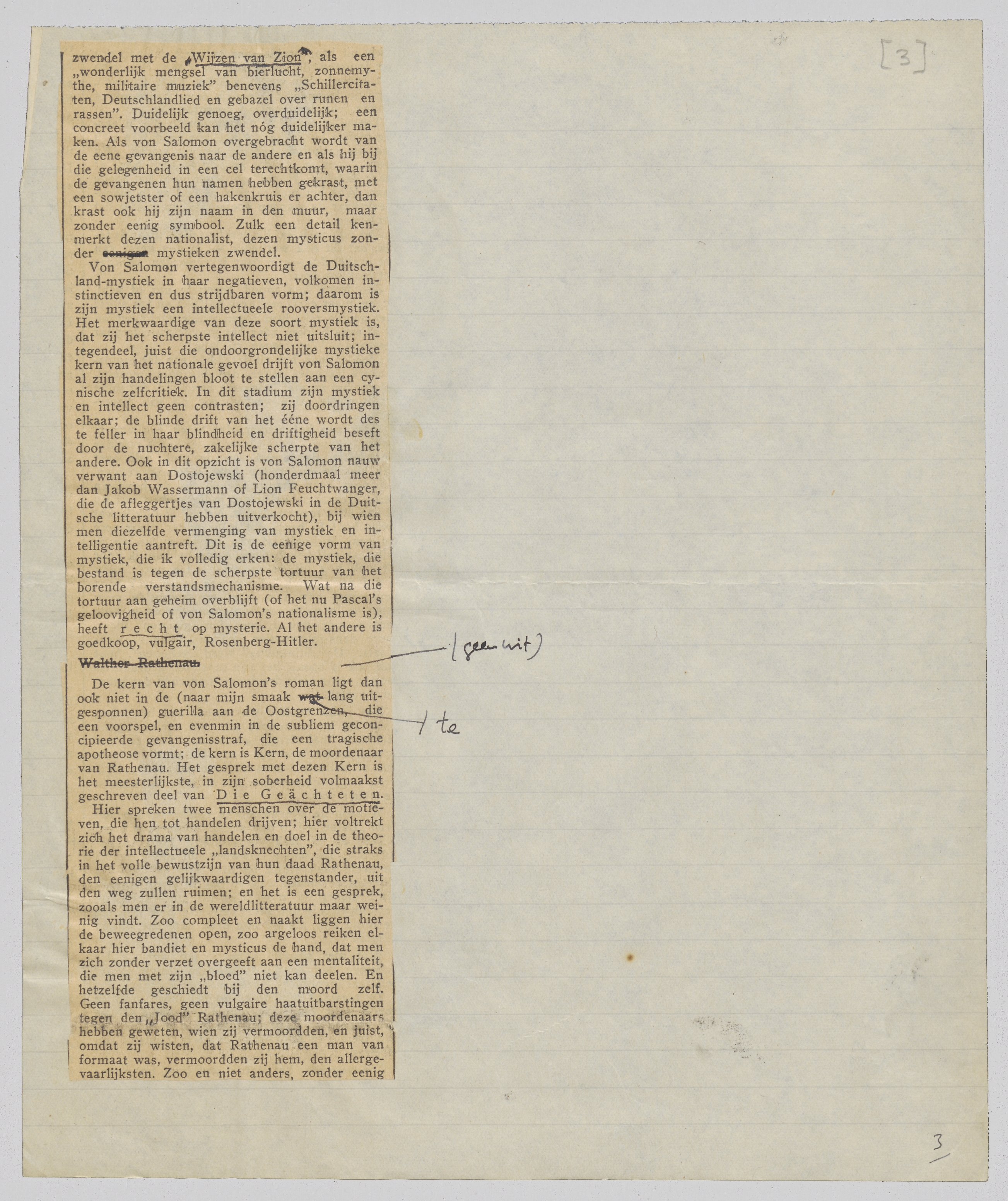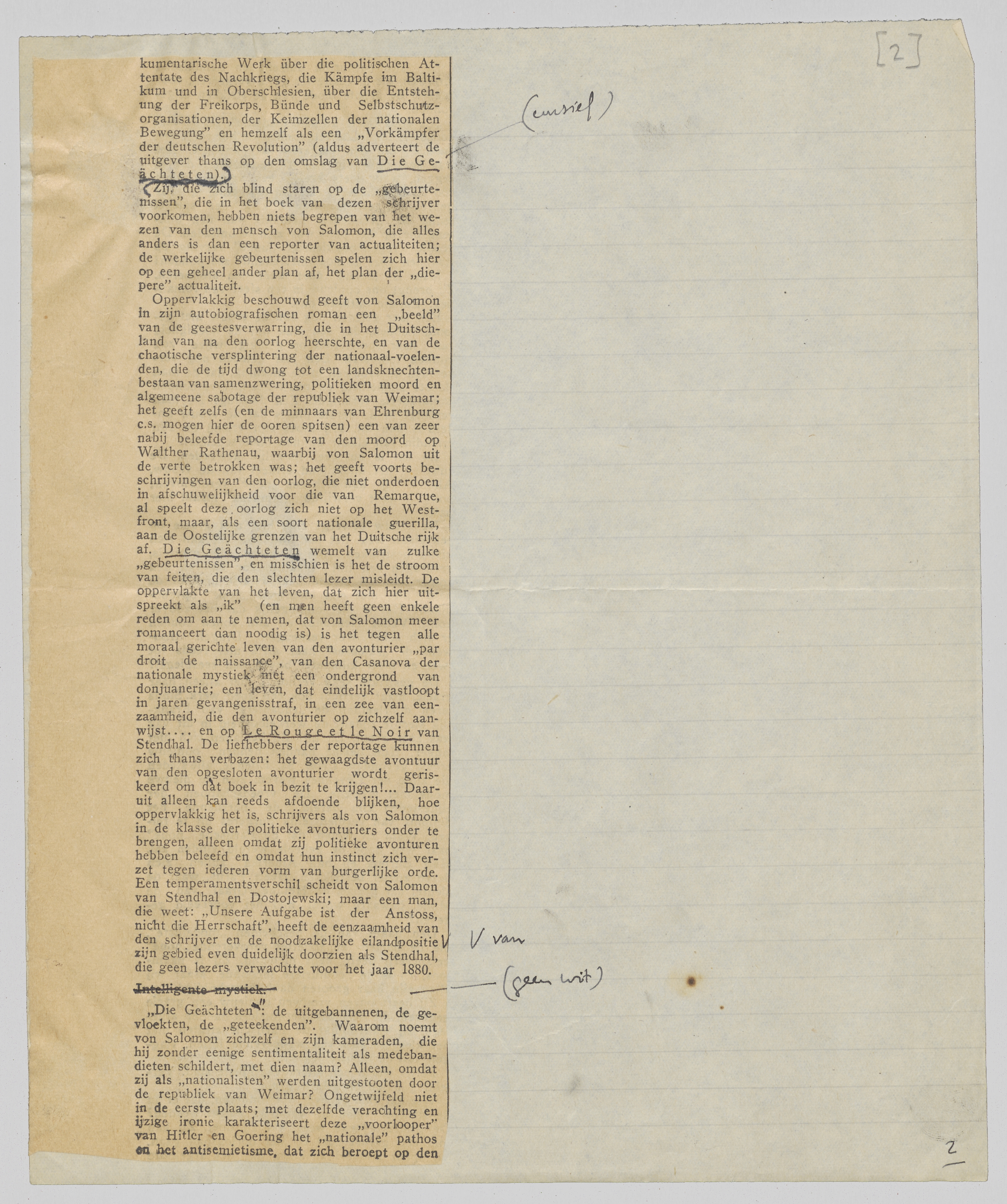 Von Salomon vertegenwoordigt de Duitschland-mystiek in haar negatieven, volkomen instinctieven en dus strijdbaren vorm; daarom is zijn mystiek een intellectueele rooversmystiek. Het merkwaardige van deze soort mystiek is, dat zij het scherpste intellect niet uitsluit; integendeel, juist die ondoorgrondelijke mystieke kern van het nationale gevoel drijft von Salomon al zijn handelingen bloot te stellen aan een cynische zelfcritiek. In dit stadium zijn mystiek en intellect geen contrasten; zij doordringen elkaar; de blinde drift van het ééne wordt des te feller in haar blindheid en driftigheid beseft door de nuchtere, zakelijke scherpte van het andere. Ook in dit opzicht is von Salomon nauw verwant aan Dostojewski (honderdmaal meer dan