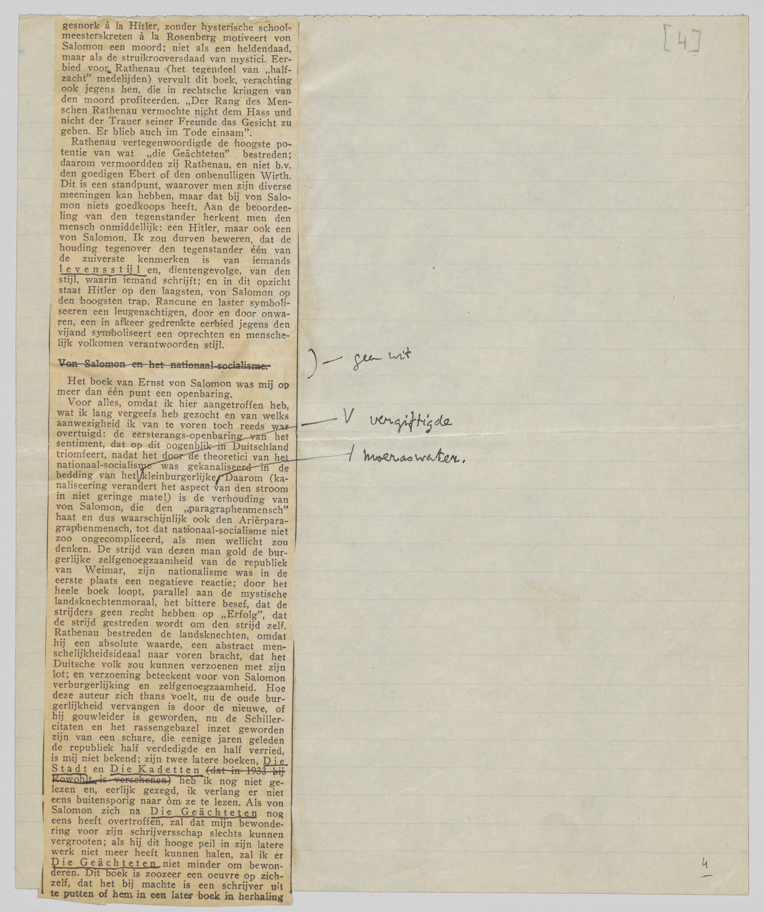 Voor alles, omdat ik hier aangetroffen heb, wat ik lang vergeefs heb gezocht en van welks aanwezigheid ik van te voren toch reeds was overtuigd: de eersterangsopenbaring van het sentiment, dat op dit oogenblik in Duitschland triomfeert, nadat het door de theoretici van het nationaal-socialisme was gekanaliseerd in de bedding van het vergiftigde kleinburgerlijke moeraswater. Daarom (kanaliseering verandert het aspect van den stroom in niet geringe mate!) is de verhouding van von Salomon, die den ‘paragraphenmensch’ haat en dus waarschijnlijk ook den Ariërparagraphenmensch, tot dat nationaal-socialisme niet zoo ongecompliceerd, als men wellicht zou denken. De strijd van dezen man gold de burgerlijke zelfgenoegzaamheid van de republiek van Weimar, zijn nationalisme was in de eerste plaats een negatieve reactie; door het heele boek loopt, parallel aan de mystische landsknechtenmoraal, het bittere besef, dat de strijders geen recht hebben op ‘Erfolg’, dat de strijd gestreden wordt om den strijd zelf. Rathenau bestreden de landsknechten, omdat hij een absolute waarde, een abstract menschelijkheidsideaal naar voren bracht, dat het Duitsche volk zou kunnen verzoenen met zijn lot; en verzoening beteekent voor von Salomon verburgerlijking en zelfgenoegzaamheid. Hoe deze auteur zich thans voelt nu de oude burgerlijkheid vervangen is door de nieu-