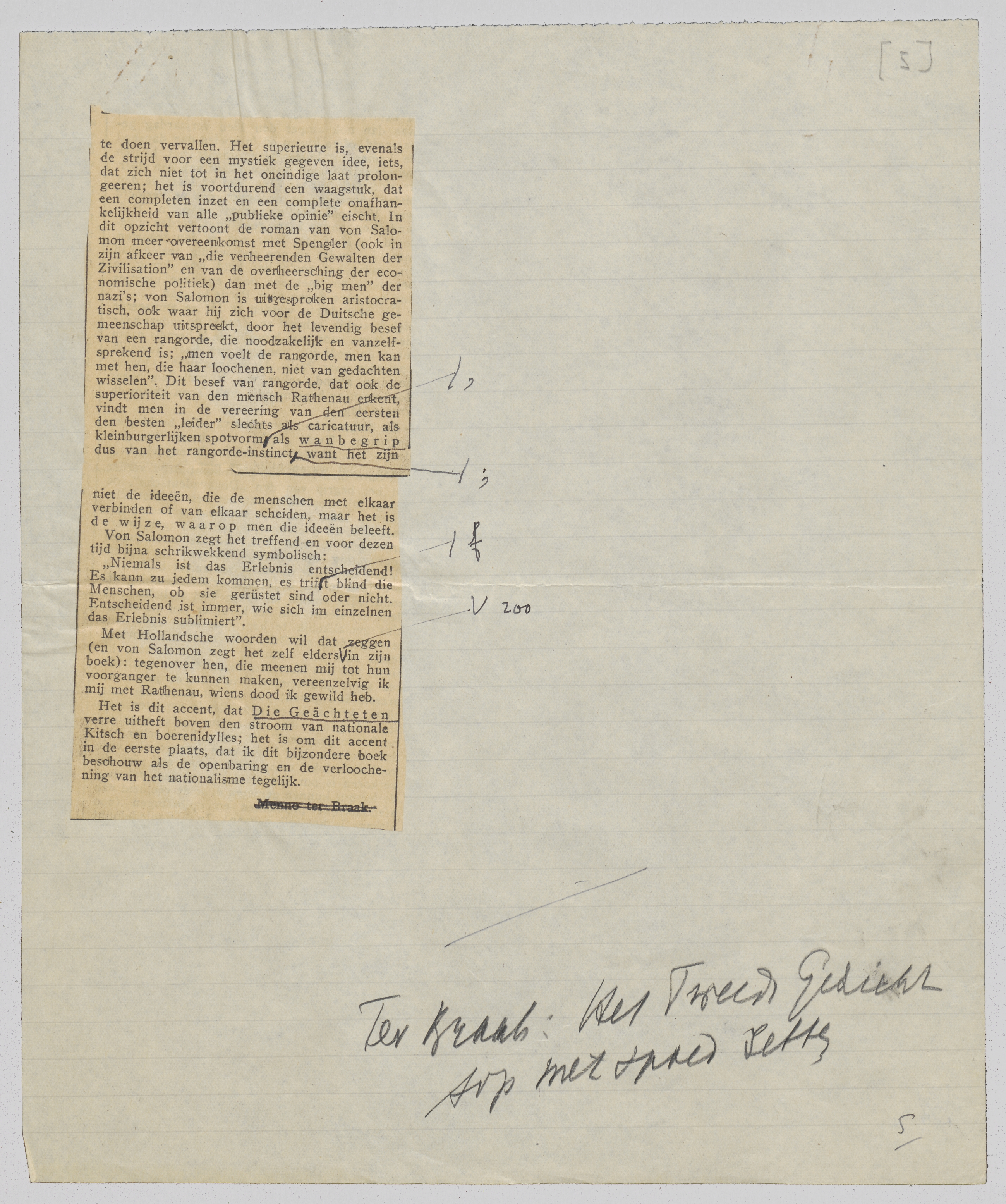 Rathenau vertegenwoordigde de hoogste potentie van wat die ‘Geächteten’ bestreden; daarom vermoordden zij Rathenau, en niet b.v. den goedigen Ebert of den onbenulligen Wirth. Dit is een standpunt, waarover men zijn diverse meeningen kan hebben, maar dat bij von Salomon niets goedkoops heeft. Aan de beoordeeling van den tegenstander herkent men den mensch onmiddellijk: een Hitler, maar ook een von Salomon. Ik zou durven beweren, dat de houding tegenover den tegenstander één van de zuiverste kenmerken is van iemands levensstijl en, dientengevolge, van den stijl, waarin iemand schrijft; en in dit opzicht staat Hitler op den laagsten, von Salomon op den hoogsten trap. Rancune en laster symboliseeren een leugenachtigen, door en door onwaren stijl, een in afkeer