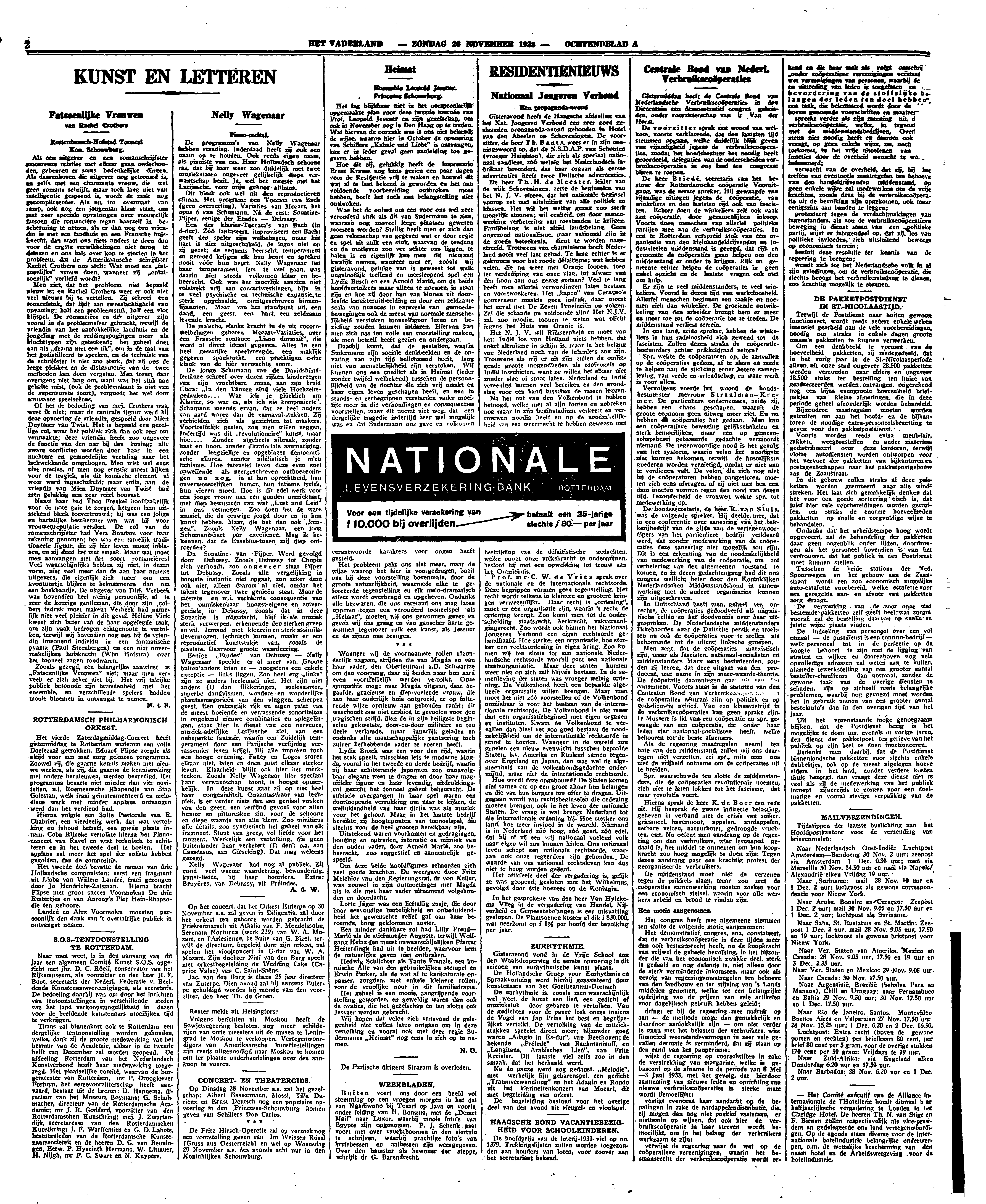 Men ziet, dat het probleem niet bepaald nieuw is; en Rachel Crothers weet er ook niet veel nieuws bij te vertellen. Zij schreef een tooneelstuk, dat lijdt aan tweeslachtigheid van opvatting: half een probleemstuk, half een vlot blijspel. De romancière en de uitgever zijn vooral in de probleemsfeer gebracht, terwijl de vriendin van het aanlokkelijke landhuis en de jongeling met de reddingspogingen meer als kluchttypen zijn geteekend; het geheel doet aan als ‘drama met een tik’, om in de taal van het gedistilleerd te spreken, en de techniek van de schrijfster is niet zoo sterk, dat zij ons de leege plekken en de disharmonie van de twee methoden kan doen vergeten. Men treurt daar overigens niet lang om, want wat het stuk aan gehalte mist, (ook de probleemkant is niet van de superieurste soort), vergoedt het wel door amusante speelscènes.