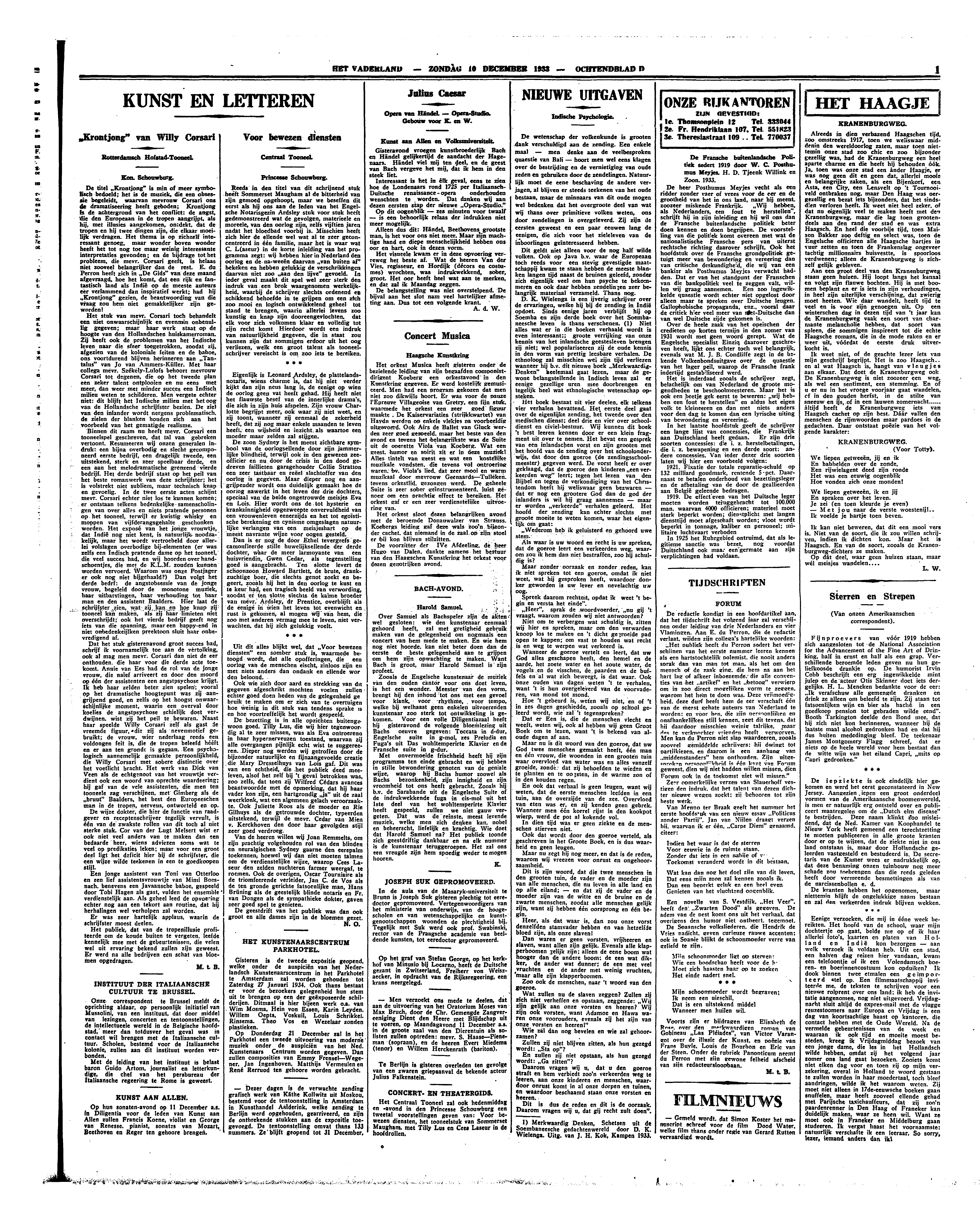 De titel ‘Krontjong’ is min of meer symbolisch bedoeld; het is de muziek, die een obsessie begeleidt, waarvan mevrouw Corsari ons de dramatiseering heeft geboden; Krontjong is de achtergrond van het conflict: de angst, die den Europeaan in de tropen aangrijpt, als hij, met illusies aangekomen, ontdekt, dat de tropen en hij twee dingen zijn, die elkaar moeilijk verdragen. Het thema is op zichzelf interessant genoeg, maar wonder boven wonder heeft het tot nog toe maar weinig interessante interpretaties gevonden; en de bijdrage tot het probleem, die mevr. Corsari geeft, is helaas niet zooveel belangrijker dan de rest. E. du Perron heeft zich in ‘De Gids’ van deze maand afgevraagd, hoe het komt, dat een rijk en fantastisch land als Indië op de meeste auteurs eer verlammend dan inspiratief werkt; had hij ‘Krontjong’ gezien, de beantwoording van die vraag zou hem niet gemakkelijker zijn geworden!
