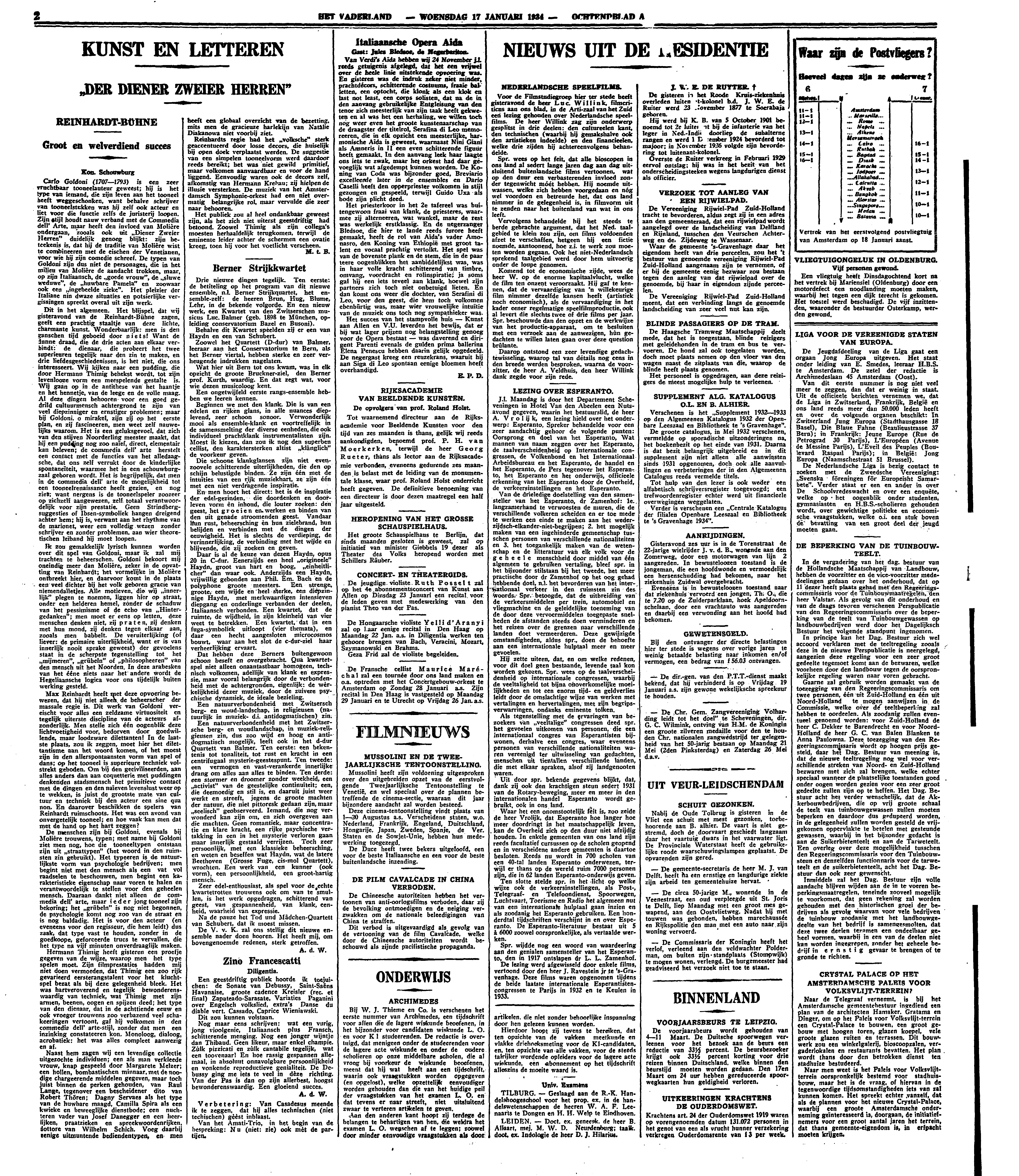 Dit in het algemeen. Het blijspel, dat wij gisteravond van de Reinhardt-Bühne zagen, geeft een prachtig staaltje van deze lichte, charmante kunst. Wonderbaarlijk: men is den ganschen tijd geboeid door niets! Want de dunne draad, die de drie acten aan elkaar verbindt: de dienaar, die probeert het twee superieuren tegelijk naar den zin te maken, en drie liefdesgeschiedenissen, is het niet, die ons interesseert. Wij kijken naar een pudding, die door Hermann Thimig behekst wordt, tot zijn levenlooze vorm een meespelende gestalte is. Wij gaan op in de antithese van het haantje en het hennetje, van de leege en de volle maag. Al deze dingen behooren voor een goed gedrild cultuurmensch achtergrond te zijn van veel diepzinniger en ernstiger problemen; maar bij Goldoni, o mirakel, zijn zij op het eerste plan, en zij fascineeren, men weet zelf nauwelijks waarom. Het is een geluksgevoel, dat zich van den stijven Noorderling meester maakt, dat hij een pudding nog zoo naïef, direct, elementair kan beleven; de commedia dell' arte herstelt een contact met de functies van het alledaagsche, dat ons zelf verrukt door de kinderlijke spontaneïteit, waarmee het in een schouwburgzaal geboren wordt. Het is begrijpelijk, dat men in de commedia dell' arte de mogelijkheid tot een tooneelrenaissance heeft gezien, en nog ziet; want nergens is de tooneelspeler zoozeer op zichzelf aangewezen, zelf totaal verantwoordelijk voor zijn prestatie. Geen Strindbergsuggesties of Ibsen-symboliek hangen dreigend achter hem; hij is, verwant aan het rhythme van de marionet, weer een volledig wezen zonder schrijver en zonder problemen, aan wier theoretischen leiband hij moet loopen.