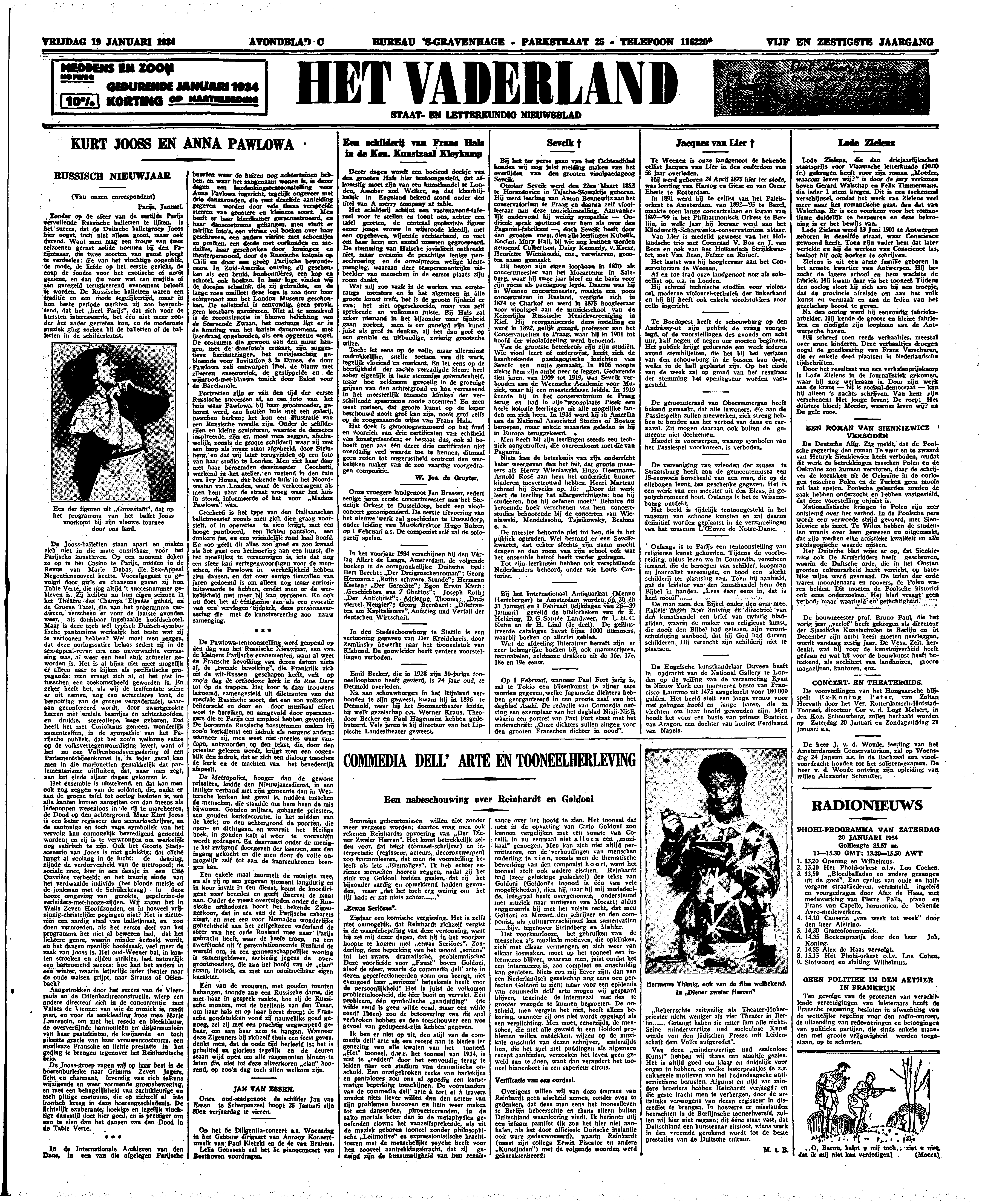 Ik ben er niet op uit, den stijl van de commedia dell' arte als een recept aan te bieden ter genezing van alle kwalen van het tooneel. ‘Het’ tooneel, d.w.z. het tooneel van 1934, is niet te ‘redden’ door het eenvoudig terug te leiden naar een stadium van dramatische onschuld. Een onafgebroken reeks van harlekijns en pantalones zou ons al spoedig een kunstmatige beperking toeschijnen. De voorstanders van de commedia dell' arte à tort et à travers zouden niets liever willen dan den acteur van zijn problemen berooven en hem weer maken tot een dansenden, pirouetteerenden, in de salto mortale beter dan in de metaphysica geoefenden clown; het vanzelfsprekende, als uit de muziek geboren tooneel zonder philosophische ‘Leitmotive’ en expressionistische krachttoeren met de menschelijke psyche heeft voor hen zooveel aantrekkingskracht, dat zij geneigd zijn de kunstmatigheid van hun renaissance over het hoofd te zien. Het tooneel dat men in de opvatting van Carlo Goldoni zou kunnen vergelijken met een sonate van Corelli, in nu eenmaal niet alleen een ‘muzikaal’ genoegen. Men kan zich niet altijd permitteeren, om de verhoudingen van menschen onderling te zien, zooals men de thematische bewerking van den componist hoort, want het tooneel stelt ook andere eischen. Reinhardt had (zeer gelukkige gedachte!) den tekst van Goldoni (Goldoni's tooneel is één van vele mogelijkheden), dien hij, naar hij mij mededeelde, integraal heeft overgenomen, ondersteund met muziek naar motieven van Mozart; aldus suggereerde hij met het volste recht, dat men Goldoni en Mozart, den schrijver en den componist, als cultuurverschijnsel kan samenvatten......bijv. tegenover Strindberg en Mahler.