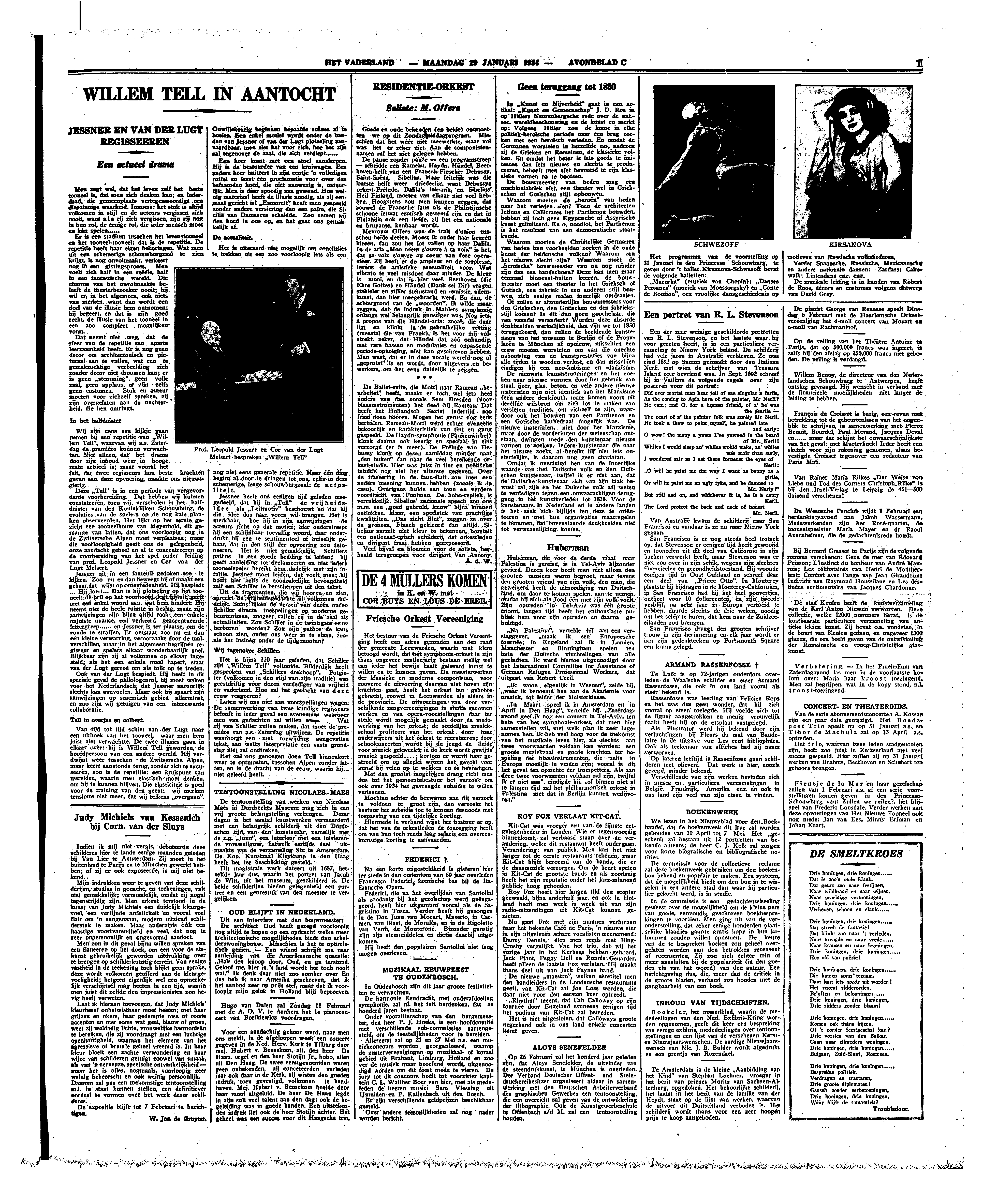 Deze ‘Tell’ is in een periode van vergevorderde voorbereiding. Dat hebben wij kunnen constateeren, toen wij, verscholen in het halfduister van den Koninklijken Schouwburg, de evoluties van de spelers op de nog kale planken observeerden. Het lijkt op het eerste gezicht een tooneelbouw van Meyerhold, dit geraamte van latten, dat ons voorloopig nog in de Zwitsersche Alpen moet verplaatsen; maar die voorloopigheid geeft ons de gelegenheid, onze aandacht geheel en al te concentreeren op de voorbereiding van het spel onder leiding van prof. Leopold Jessner en Cor van der Lugt Melsert.