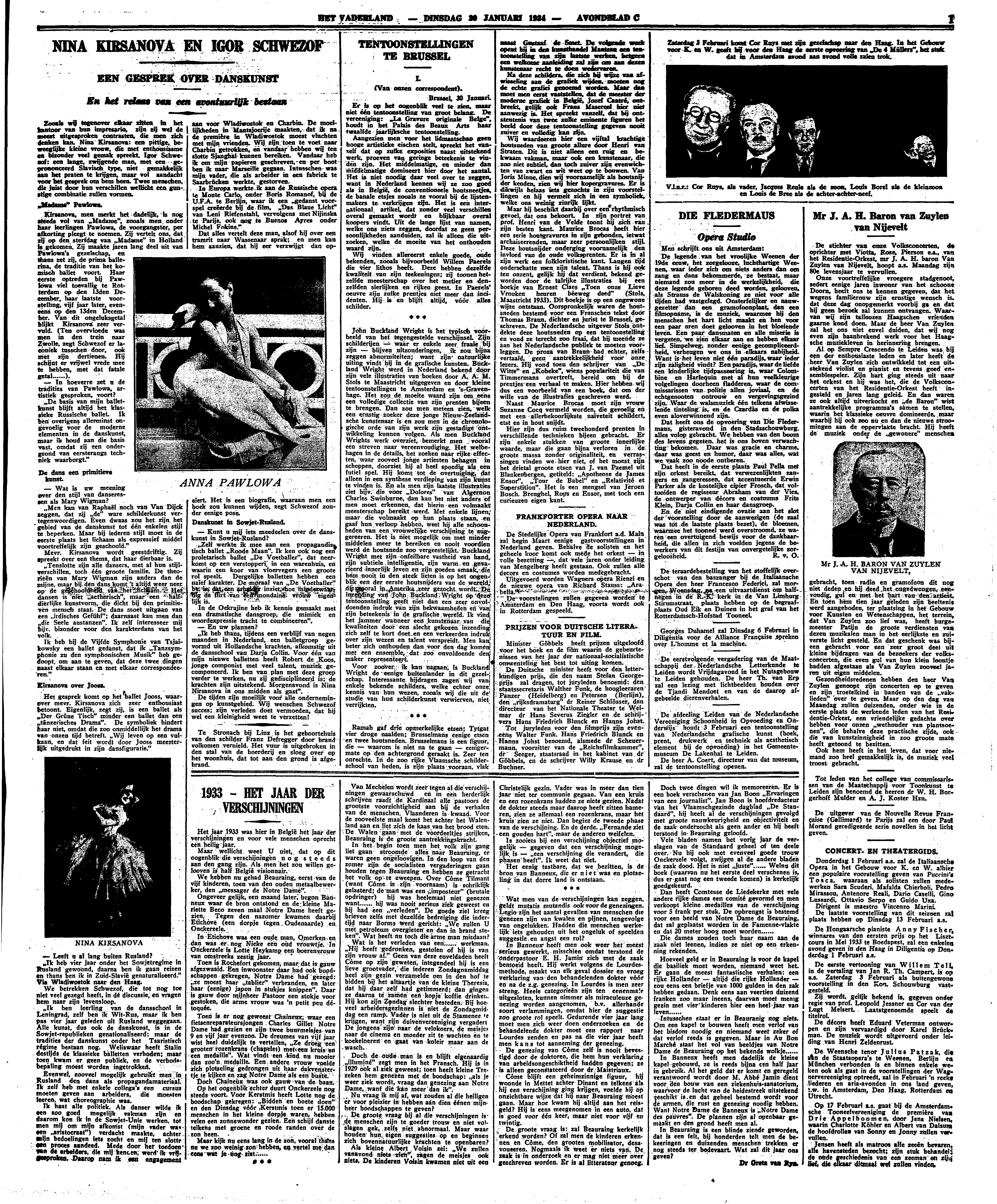 Ik haat alle politiek. Als danser wilde ik een zoo goed mogelijk vakman zijn en daarom kon ik in de Sowjet-Unie werken, tot men mij om mijn afkomst (mijn vader was een ‘aristocraat’) verdacht maakte, achter mijn bedoelingen iets zocht en mij ten slotte een proces aandeed. Mede door het toedoen van de arbeiders, die mij kenden, werd ik vrijgesproken. Daarop nam ik een engagement aan voor Wladiwostok en Charbin. De moeilijkheden in Mantsjoerije maakten, dat ik na de première in Wladiwostok moest vluchten met mijn vrienden. Wij zijn toen te voet naar Charbin getrokken, en vandaar hebben wij ten slotte Sjanghai kunnen bereiken. Vandaar heb ik om mijn papieren geschreven, en per boot ben ik naar Marseille gegaan. Intusschen was mijn vader, die als arbeider in een fabriek te Saarbrūcken werkte, gestorven.