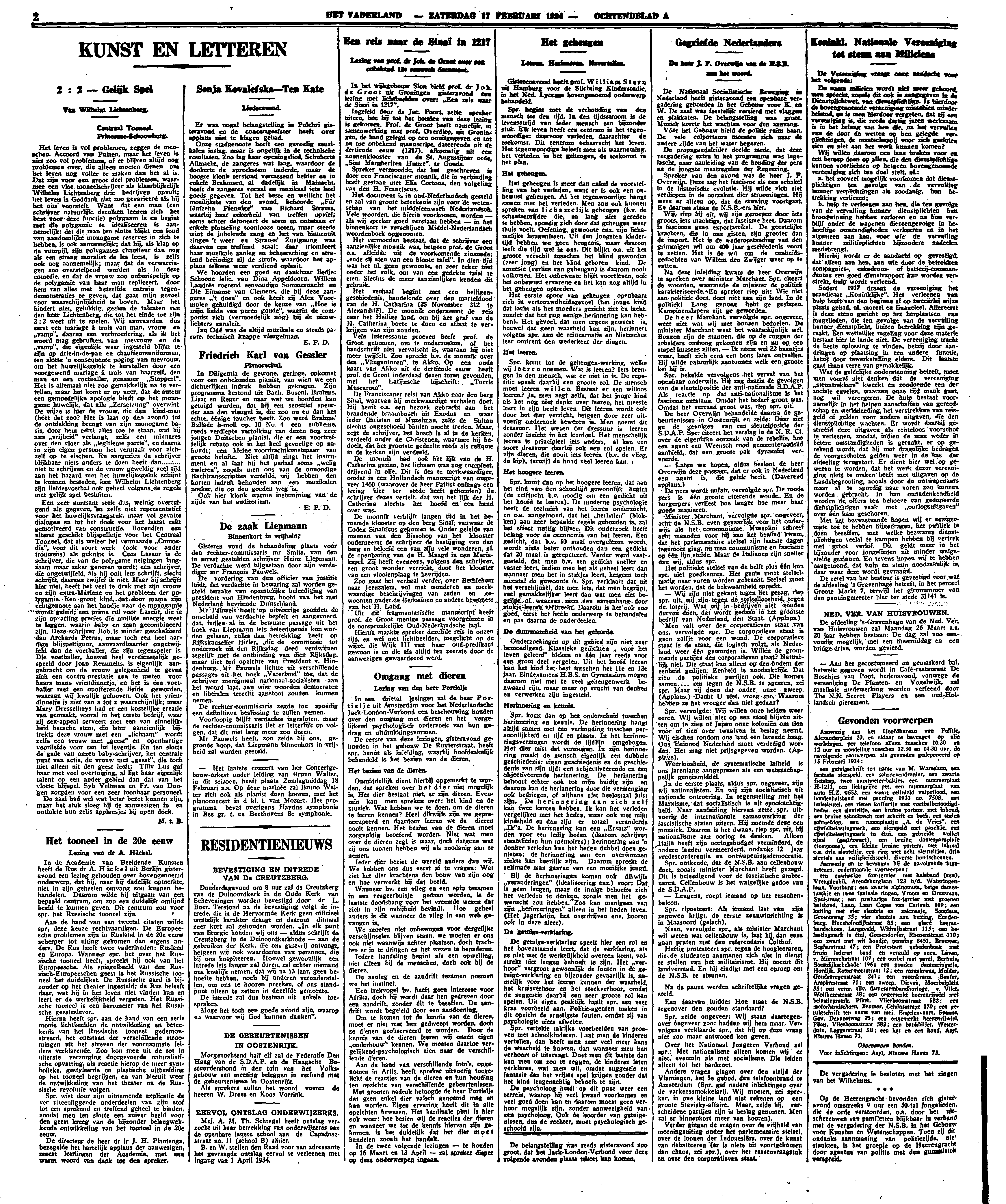 Het leven is vol problemen, zeggen de menschen. Accoord van Putten, maar het leven is niet zoo vol problemen, of er blijven altijd nog problemen over, die alleen moeten dienen om het leven nog voller te maken dan het al is. Dat zijn voor een groot deel problemen, waarmee een vlot tooneelschrijver als klaarblijkelijk Wilhelm Lichtenberg drie bedrijven opvult; het leven is Goddank niet zoo gevarieerd als hij het ons voorstelt. Want dat een man (een schrijver natuurlijk, dezulken leenen zich het best voor deze functie) polygaam is en begint met die polygamie te idealiseeren is aannemelijk; dat die man ten slotte blijkt een fond van aandoenlijke monogame reserves in zich te hebben, is ook aannemelijk; dat hij, als klap op de vuurpijl, zijn polygamen chauffeur dan nog als een streng moralist de les leest, is zelfs ook nog aannemelijk; maar dat de verwarrigen zoo overstelpend worden als in deze comedie, en dat de vrouw zoo onberispelijk op de polygamie van haar man repliceert, door hem van alles met hetzelfde entrain tegendemonstraties te geven, dat gaat mijn gevoel voor waarschijnlijkheid te boven. Maar het hindert niet, gelukkig, gezien de talenten van den heer Lichtenberg, die tot het einde toe zijn 2:2 weet uit te spelen. Wij aanvaarden dus eerst een mariage à trois van man, vrouw en ‘vamp’, daarna een verbroedering, als ik het woord mag gebruiken, van mevrouw en de ‘vamp’, die eigenlijk weer ingesteld blijkt te zijn op drie-in-de-pan en chauffeursuniformen, ten slotte 'n consequente poging van mevrouw, om het huwelijksgeluk te herstellen door een voorgewend mariage à trois van haarzelf, den man en een voetballer, genaamd ‘Stopperl’. Het is allemaal niet zoo gemakkelijk na te vertellen, maar het komt er op neer, dat de auteur een gemoedelijke apologie biedt op het monogame huwelijk, dat alle ‘Zersetzung’ overwint. De wijze is hier de vrouw, die den kind-man (heet dat zoo? Het is laat op den avond) tot de ontdekking brengt van zijn monogame basis, door hem eerst alles toe te staan, wat hij aan ‘vrijheid’ verlangt, zelfs een minnares over den vloer als ‘legitieme partie’, en daarna in zijn eigen persoon het vermaak voor zichzelf op te eischen. En aangezien de schrijver blijkbaar niets anders te doen heeft dan......... niet te schrijven en de vrouw geweldig veel tijd aan het hazard met het huwelijksgeluk schijnt te kunnen besteden, kan Wilhelm Lichtenberg zijn liefdesvoetbal ook geheel volgens de regels met gelijk spel besluiten.