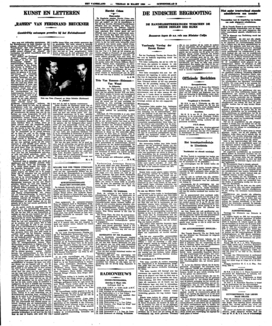 Johan Schmitz als Karlanner speelt nog altijd wat zwaar, maar hij heeft verder eer van zijn gecompliceerde rol, die veel van den acteur eischt. Dick van Veen (als de enthousiast Tessow) had door zijn nieuwe grime aan Germaanschheid gewonnen; hij is zeer geschikt voor dit type, al vond ik hem ditmaal tegen het einde wat mat. Paul Steenbergen geeft den Joodschen student Siegelmann bescheiden en met talent, terwijl Jan van der Linden's Rosloh (de agitator, die het Schlageter-effect exploiteert) ook nog aanmerkelijk vooruit was gegaan. Op de prachtige rollen van Vera Bondam, die met de juiste nuanceering het Joodsche meisje speelde, en van Hermann Schwab als haar vader, den Joodschen fabrikant, heb ik na de voorstelling te Rotterdam al gewezen. De kleinere rollen en het samenspel waren ditmaal ook een speciaal woord van lof waard. De decors van Veterman en Brückmann ondersteunden de acteurs bijzonder goed.