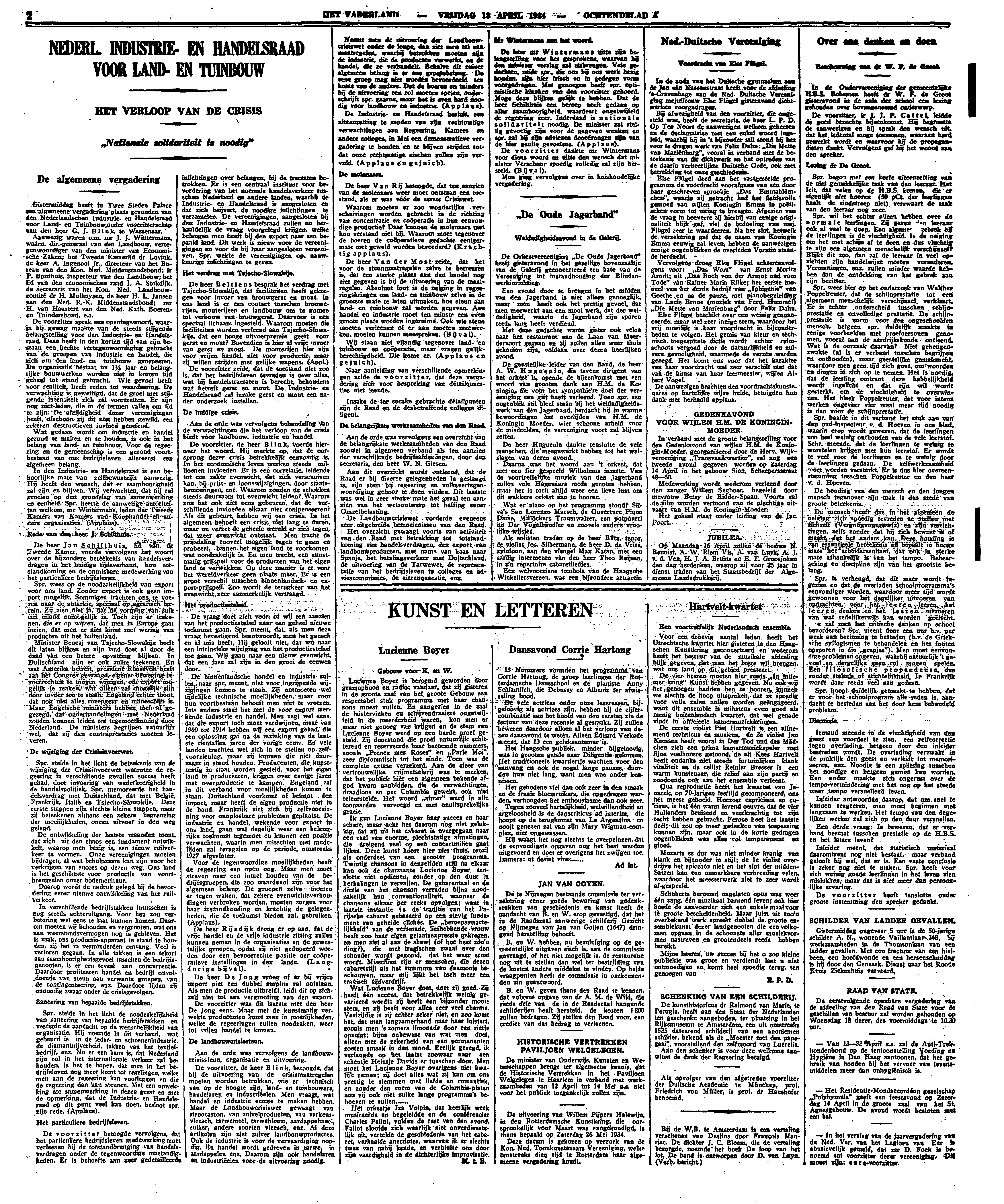 Lucienne Boyer is beroemd geworden door gramophoon en radio; vandaar, dat zij gisteren in de groote zaal van het groote Gebouw een respectabel stuk programma met haar chansons moest vullen. En aangezien in de zaal de luistervinken en schijvendraaiers ongetwijfeld in de meerderheid waren, kon men er maar niet genoeg van krijgen en de stem van Lucienne Boyer werd op een harde proef gesteld. Zij doorstond die proef natuurlijk schitterend en reserveerde haar beroemde nummers, zooals ‘Prenez mes Roses’ en ‘Parle Moi’, zeer diplomatisch tot het einde. Toen was de complete extase verzekerd. Aan de sfeer van vertrouwelijke vrijmetselarij was te merken, dat het publiek hier een algemeen bekende afgod kwam aanbidden, die de verwachtingen, draadloos en per Columbia gewekt, ook niet teleurstelde. Het woord ‘aimer’ werd in alle toonaarden vervoegd en met onuitsprekelijke gracie.