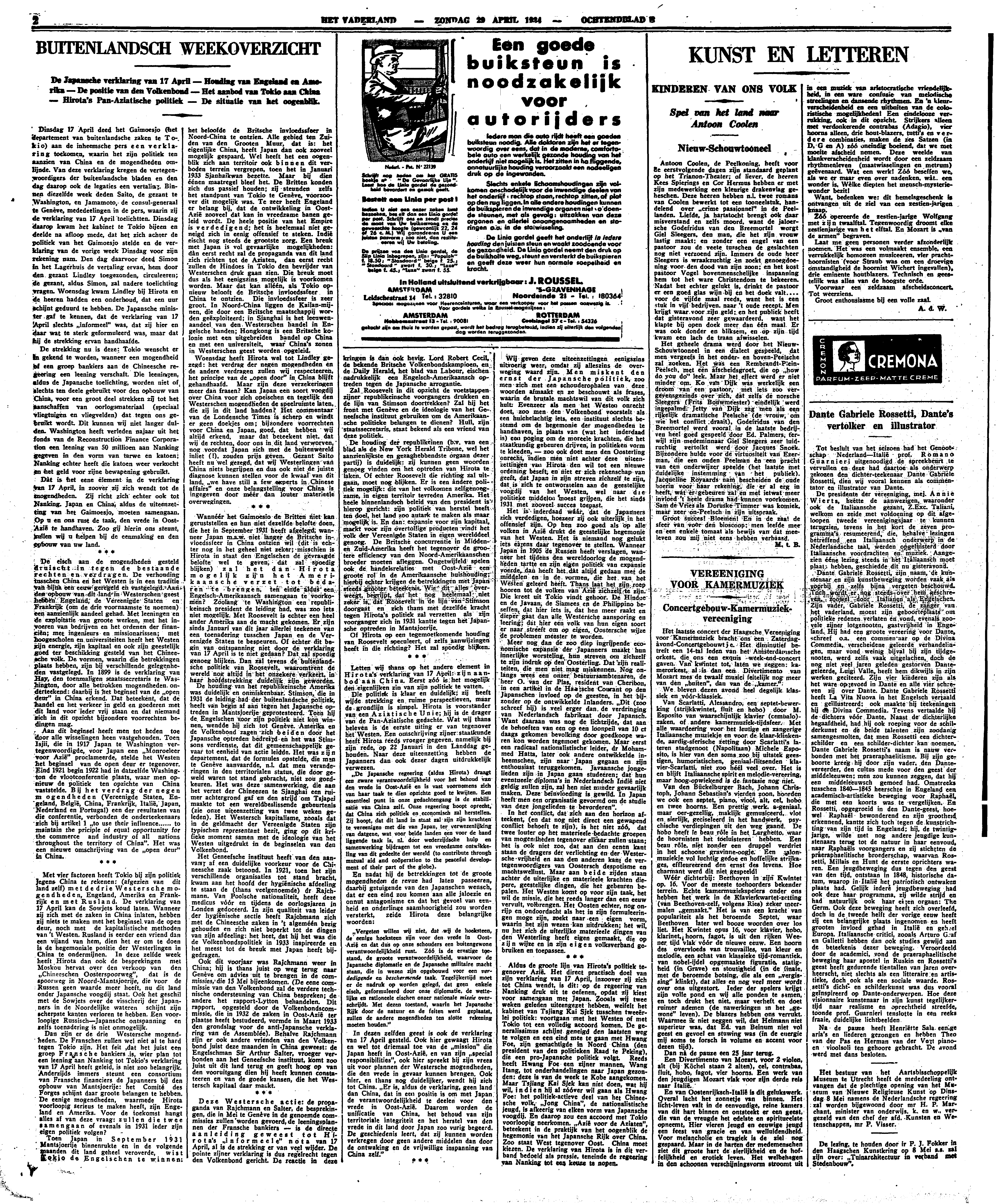Antoon Coolen, de Peelkoning, heeft voor de eerstvolgende dagen zijn standaard geplant op het Trianon-Theater; of liever, de heeren Kees Spierings en Cor Hermus hebben er met zijn medewerking een kleurige drakenvlag geheschen. Deze heeren hebben n.l. twee romans van Coolen bewerkt tot een tooneelstuk, handelend over ‘crime passionnel’ in de Peellanden. Liefde, ja hartstocht brengt ook daar misverstand en zelfs moord, want de jaloersche Godefridus van den Breemortel worgt Giel Sleegers, den man, die het zijn vrouw lastig maakt; en zonder een engel van een pastoor zou de veete tusschen de geslachten nog niet verzoend zijn. Immers de oude heer Sleegers is wraakzuchtig en zoekt genoegdoening voor den dood van zijn zoon; en het kost pastoor Vogel bovenmenschelijke inspanning hem tot het ware Christendom te bekeeren. Nadat het echter gelukt is, drinkt de pastoor er een goed glas wijn bij en het doek valt.... voor de vijfde maal reeds, want het is een stuk in vijf bedrijven, naar 't oude recept. Men krijgt waar voor zijn geld; en het publiek heeft dat gisteravond zeer gewaardeerd, want het klapte bij open doek meer dan één maal. Er was ook donder en bliksem, en op zijn tijd kwam een lach de traan afwisselen.