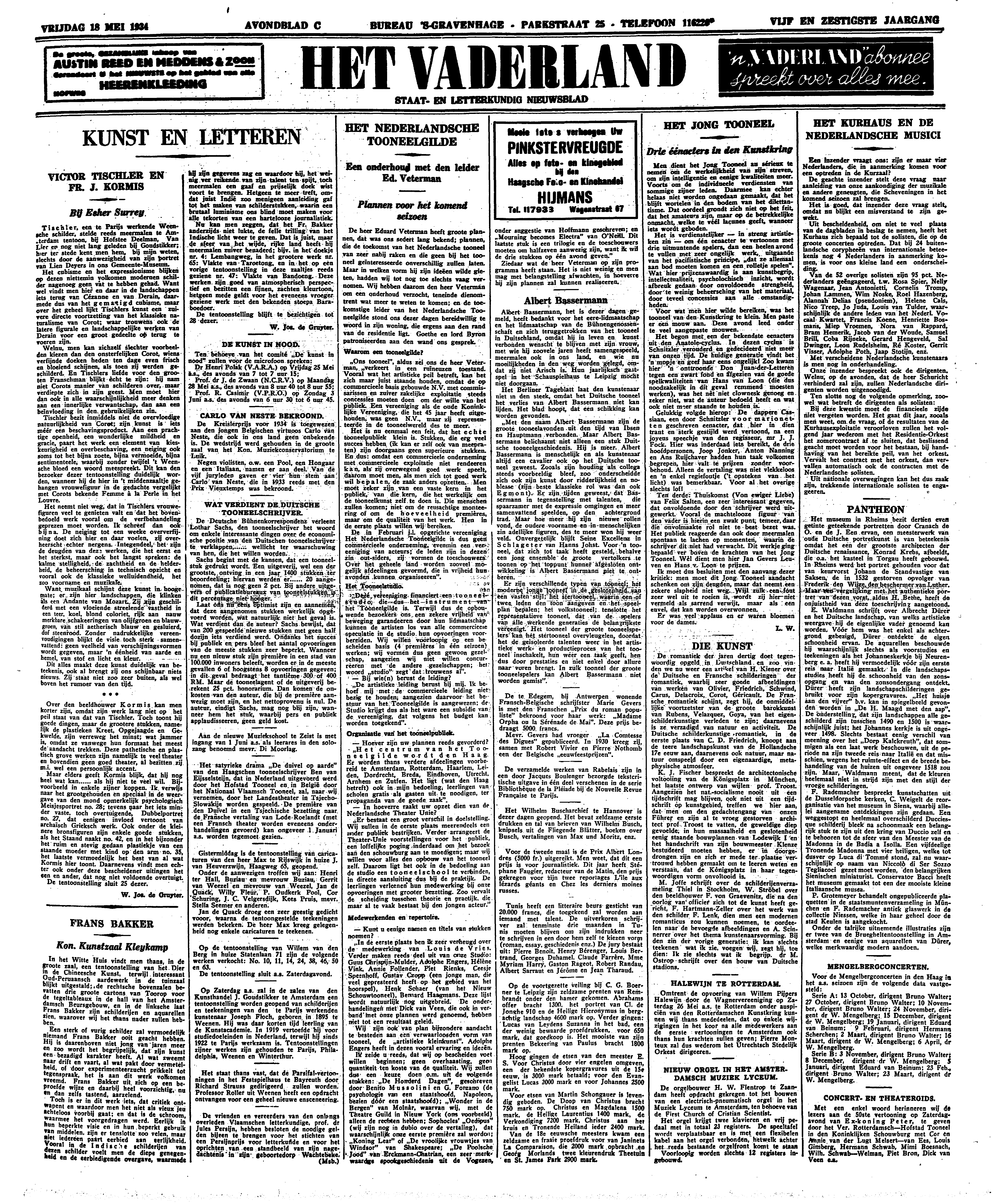 De heer Eduard Veterman heeft groote plannen, dat was ons sedert lang bekend; plannen, die de toekomst van het Nederlandsche tooneel van zeer nabij raken en die geen bij het tooneel geïnteresseerde onverschillig zullen laten. Maar in welken vorm hij zijn ideëen wilde gieten, hadden wij tot nog toe slechts vaag vernomen. Wij hebben daarom den heer Veterman om een onderhoud verzocht, teneinde dienomtrent wat meer te weten te komen; en de toekomstige leider van het Nederlandsche Tooneelgilde stond ons dezer dagen bereidwillig te woord in zijn woning, die ergens aan den rand van de residentie ligt. Goethe en lord Byron patroniseerden aan den wand ons gesprek.