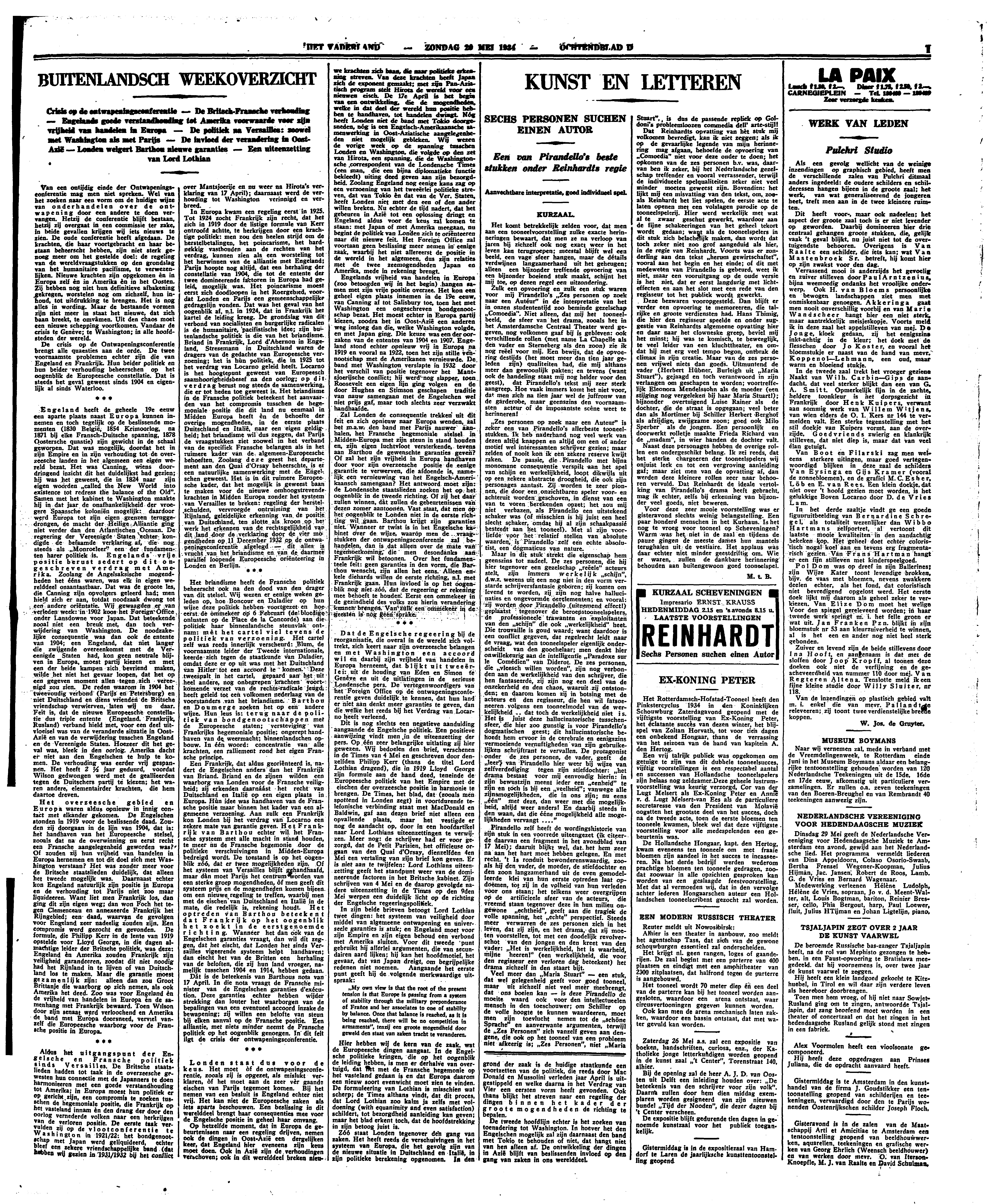 Naast deze personages hebben de overige rollen een ondergeschikt belang. Ik zei reeds, dat het sterke chargeeren der tooneelspelers mij onjuist leek en tot een vergroving aanleiding gaf; maar ziet men van de opvatting af, dan werden deze kleinere rollen zeer naar behooren vervuld. Dat Reinhardt de ideale vertolking van Pirandello's drama heeft gebracht, mag ik echter, zelfs bij erkenning van bijzonder veel goeds, niet beweren.