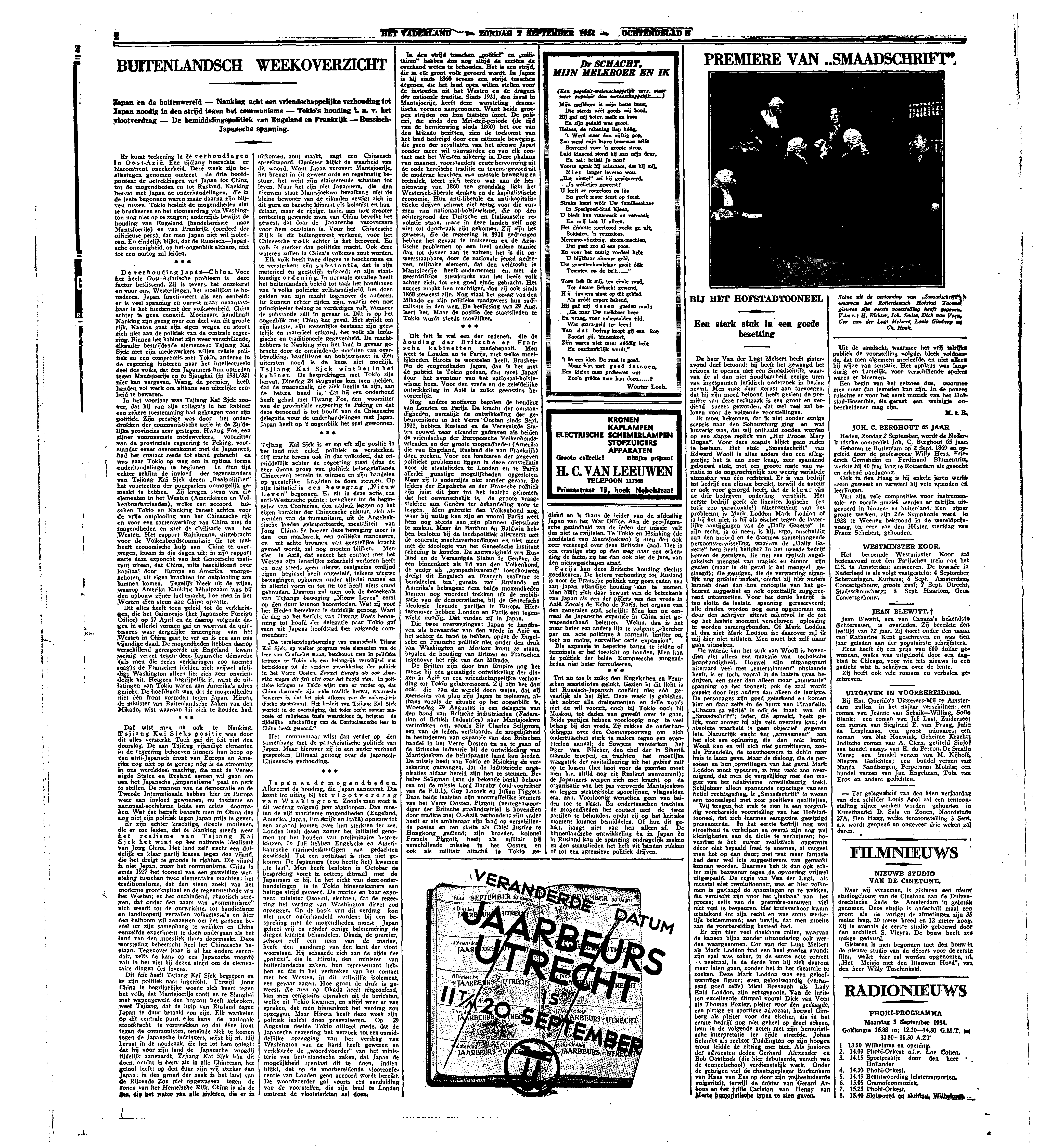 Ik moet bekennen, dat ik niet zonder eenige scepsis naar den Schouwburg ging en wat huiverig was, dat wij onthaald zouden worden op een slappe repliek van ‘Het Proces Mary Dugan’. Voor deze scepsis blijkt geen reden te bestaan. Het stuk ‘Smaadschrift’ van Edward Wooll is alles anders dan een afleggertje; het is een zeer knap, zeer spannend gebouwd stuk, met een groote mate van variatie in de oogenschijnlijk zoo weinig variabele atmosfeer van één rechtzaal. Er is van bedrijf tot bedrijf een climax bereikt, terwijl de auteur er ook voor gezorgd heeft, dat de kleur van de drie bedrijven onderling verschilt. Het eerste bedrijf geeft de lineaire, logische (en toch zoo paradoxale!) uiteenzetting van het probleem: is Mark Loddon Mark Loddon of is hij het niet, is hij als eischer tegen de lasterlijke aantijgingen van de ‘Daily Gazette’ in zijn recht, ja of neen, is hij, ergo, onschuldig aan den moord en de daarmee samenhangende persoonsverwisseling, waarvan de ‘Daily Gazette’ hem heeft beticht? In het tweede bedrijf komen de getuigen, die met een typisch angelsaksisch mengsel van tragiek en humor zijn gezien (maar in dit geval is het mengsel geslaagd); die getuigen, die de verwarring eigenlijk nog grooter maken, omdat zij niet anders kunnen doen dan hun conceptie van het gebeuren suggestief en ook opzettelijk suggereerend uiteenzetten. Voor het derde bedrijf is ten slotte de laatste spanning gereserveerd; alle draden worden nog eens opgenomen om door den schrijver uiterst talentvol in de tot op het laatste moment verschoven oplossing te worden samengebonden. Of Mark Loddon al dan niet Mark Loddon is: daarover zal ik mij hier niet uitlaten. Men moet het zelf maar gaan uitmaken.