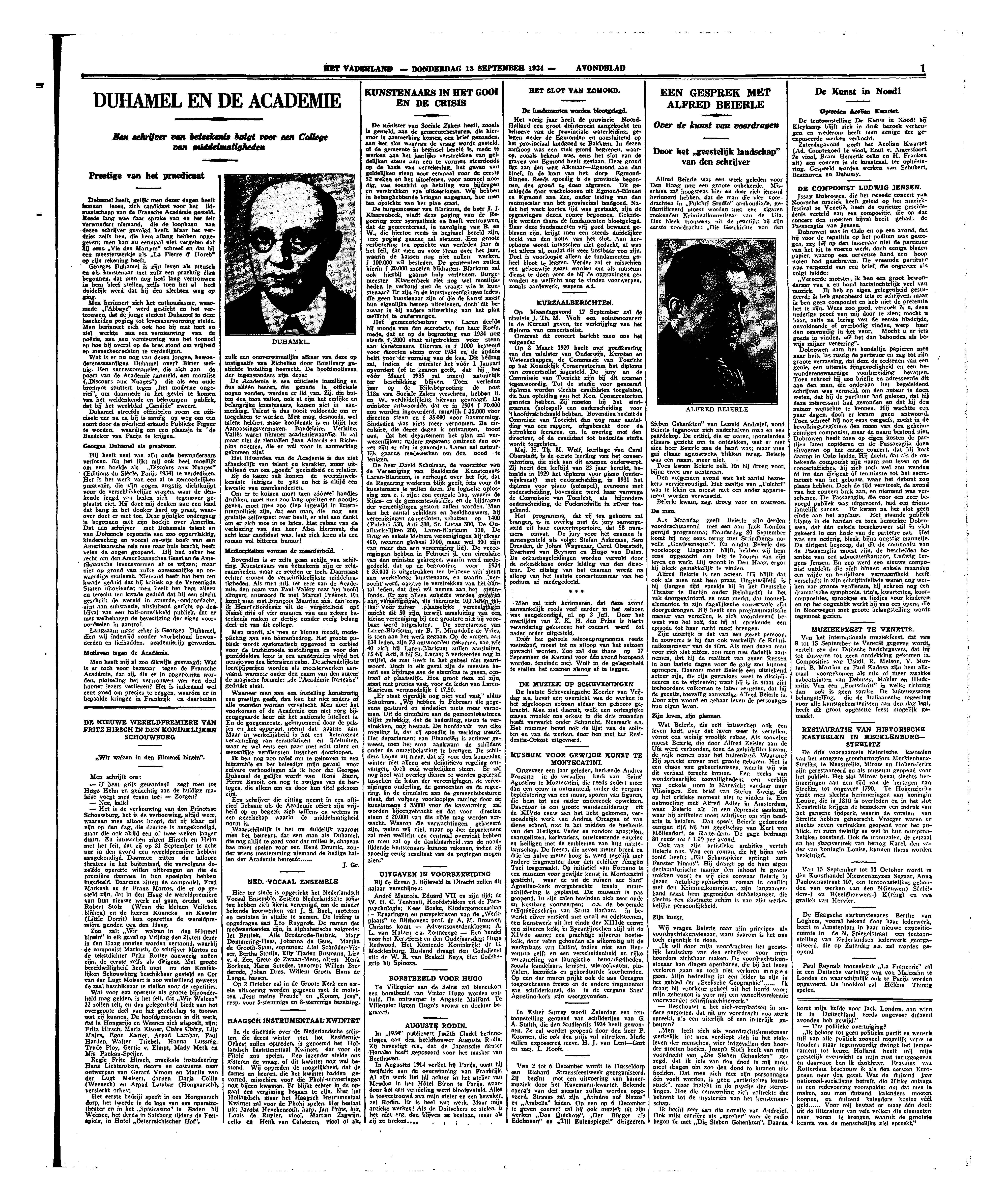 Alfred Beierle was een week geleden voor Den Haag nog een groote onbekende. Misschien zal hoogstens hier en daar zich iemand herinnerd hebben, dat de man die vier voordrachten in ‘Pulchri Studio’ aankondigde, geidentificeerd moest worden met een sigaren rookenden Kriminalkommissar van de Ufa. Het bleek trouwens uit de practijk: bij zijn eerste voordracht: ‘Die Geschichte von den Sieben Gehenkten’ van Leonid Andrejef, vond Beierle tegenover zich, anderhalven man en een paardekop. De critici, die er waren, monsterden elkaars gezicht om te ontdekken, wat er met dien heer Beierle aan de hand was; maar men gaf elkaar agnostische blikken terug. Beierle was een naam, meer niet.