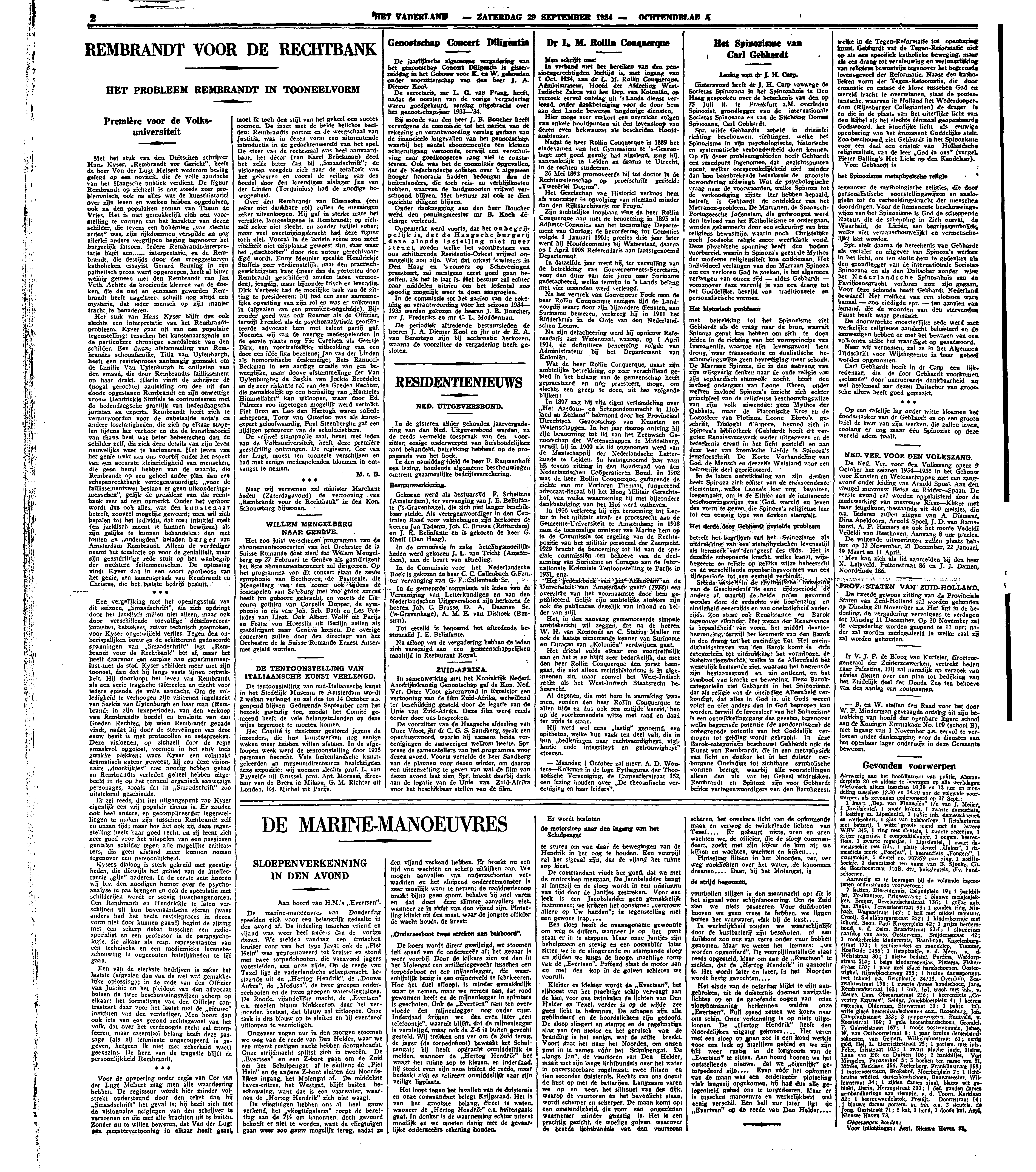 Met het stuk van den Duitschen schrijver Hans Kyser, ‘Rembrandt vor Gericht’, heeft de heer Van der Lugt Melsert wederom beslag gelegd op een noviteit, die de volle aandacht van het Haagsche publiek verdient. De figuur Rembrandt op zichzelf is nog steeds zeer problematisch, ook na alles wat de kunsthistorici over zijn leven en werken hebben opgedolven, ook na den populairen roman van Theun de Vries. Het is niet gemakkelijk zich een voorstelling te vormen van het karakter van dezen schilder, die tevens een bohémien ‘van slechte zeden’ was, zijn rijkdommen verspilde en nog allerlei andere vergrijpen beging tegenover het burgeriijk fatsoen. Iedere Rembrandt-interpretatie blijft een...... interpretatie, en de Rembrandt, die destijds door den vroeggestorven katholieken essayist Gerard Bruning in zijn pathetisch proza werd opgeroepen, heeft al bitter weinig gemeen met den Rembrandt van Jan Veth. Achter de broeiende kleuren van de doeken, die de oud en eenzaam geworden Rembrandt heeft nagelaten, schuilt nog altijd een mysterie, dat ieder mensch op zijn manier tracht te benaderen.