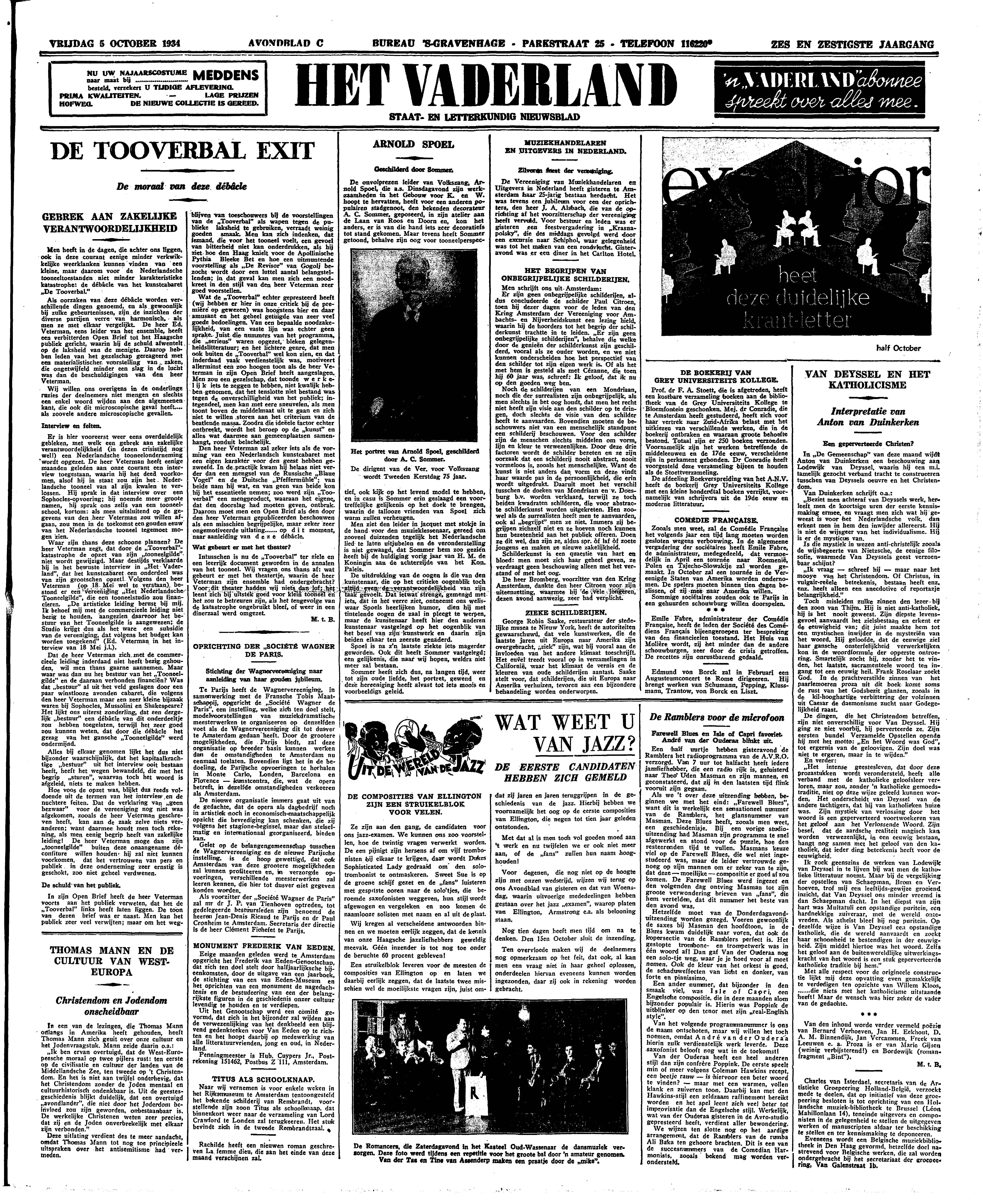 Dat de heer Veterman zich met de commercieele leiding inderdaad niet heeft bezig gehouden, wil men thans gaarne aannemen. Maar waar was dan nu het bestuur van het ‘Tooneelgilde’ en de daaraan verbonden financiën? Was dat ‘bestuur’ al uit het veld geslagen door een paar winstlooze avonden cabaret, die volgens den heer Veterman maar een zeer kleine bijzaak waren bij Sophocles, Mussolini en Shakespeare? Het lijkt ons uiterst zonderling, dat een dergelijk ‘bestuur’ een débâcle van dit onderdeeltje zou hebben toegelaten, terwijl het zeer goed zou kunnen weten, dat door die débâcle het gezag van het gansche ‘Tooneelgilde’ werd ondermijnd.