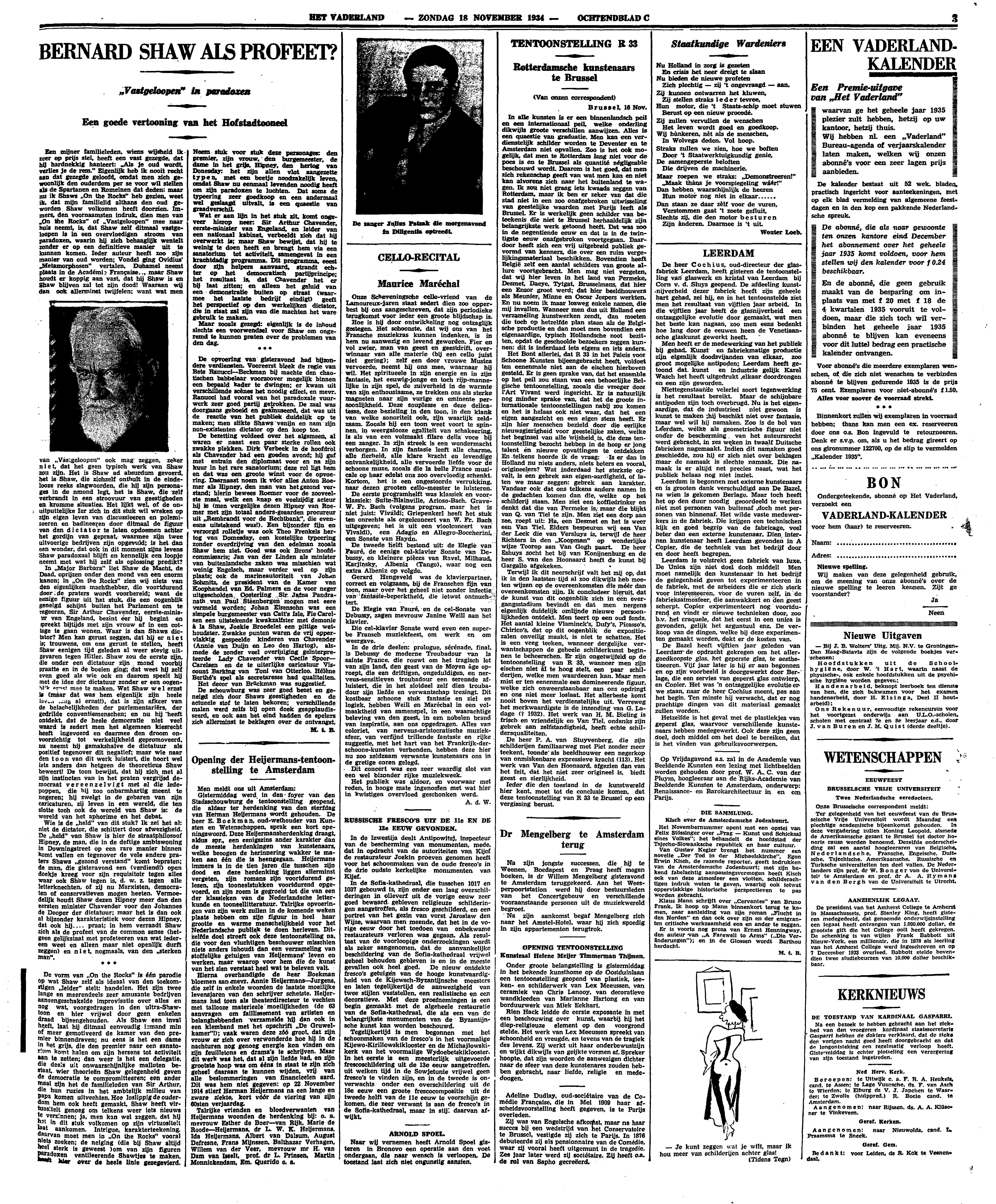 Een mijner familieleden, wiens wijsheid ik zeer op prijs stel, heeft een vast gezegde, dat hij hardnekkig hanteert: ‘Als je oud wordt, verlies je de rem.’ Eigenlijk heb ik nooit recht aan dat gezegde geloofd, omdat men zich gewoonlijk den ouderdom per se voor wil stellen als de Spartanen en Romeinen dat deden; maar nu ik Shaws ‘On the Rocks’ heb gezien, weet ik, dat mijn familielid althans den oud geworden Shaw volkomen heeft doorzien. Immers, den voornaamsten indruk, dien men van ‘On the Rocks’ of ‘Vastgeloopen’ mee naar huis neemt, is, dat Shaw zelf ditmaal vastgeloopen is in een overvloedigen stroom van paradoxen, waarin hij zich behaaglijk wentelt zonder er op een definitieve manier uit te kunnen komen. Ieder auteur heeft zoo zijn manier van oud worden; Vondel ging Ovidius' ‘Metamorphosen’ vertalen, Duhamel neemt plaats in de Académie Française.., maar Shaw houdt er koppig aan vast dat hij Shaw is en Shaw blijven zal tot zijn dood! Waaraan wij dan ook allerminst twijfelen; want wat men van ‘Vastgeloopen’ ook mag zeggen, zeker niet, dat het geen typisch werk van Shaw zou zijn. Het is Shaw ad absurdum gevoerd, het is Shaw, die zichzelf onthult in de eindelooze reeks slagwoorden, die hij zijn personages in den mond legt, het is Shaw, die zelf verbrandt in een stroovuur van geestigheden en kromme situaties. Het lijkt wel, of de onuitputtelijke Ier zich in dit stuk wil wreken op zijn eigen leven van discussieeren en polemiseeren en badineeren door ditmaal de figuur van den dictator te laten opdoemen achter het gordijn van gepraat, waarmee zijn twee uitvoerige bedrijven zijn opgevuld; is het dan een wonder, dat ook in dit moment zijns levens Shaw paradoxaal blijft en kennelijk een loopje neemt met wat hij zelf als oplossing predikt?
