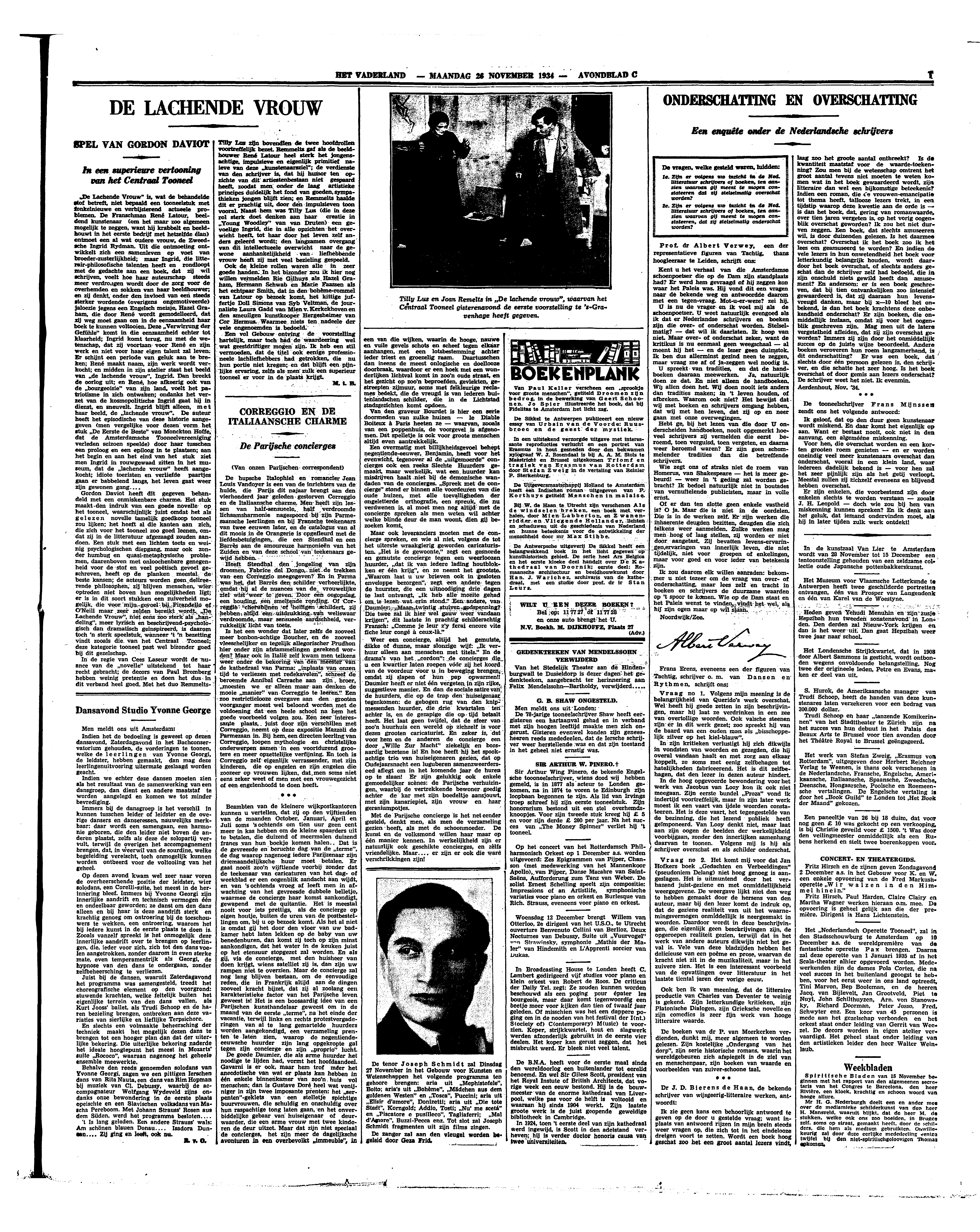 Gordon Daviot heeft dit gegeven behandeld met een onmiskenbare charme. Het stuk maakt den indruk van een goede novelle op het tooneel, waarschijnlijk juist omdat het als gelezen novelle tamelijk goedkoop tooneel zou lijken; het heeft al die kanten aan zich, die zich voor het tooneel zoo goed leenen, omdat zij in de litteratuur afgezaagd zouden aandoen. Een stuk met een lichten toets en weinig psychologischen diepgang, maar ook zonder humbug en quasi-metaphysische problemen, daarenboven met onloochenbare genegenheid voor de stof en veel poëtisch gevoel geschreven, heeft op de planken meestal de beste kansen; de acteurs worden geen delireerende philosophen, zij blijven menschen, wier optreden niet boven hun mogelijkheden ligt; er is in dit soort stukken een zuiverheid mogelijk, die voor mijn gevoel bij Pirandello of O'Neill maar zeer zelden bereikt wordt. ‘De Lachende Vrouw’, niet eens zoo sterk als ‘handeling’, meer lyrisch en beschrijvend-psychologisch dan dramatisch geinspireerd, is daarom toch 'n sterk speelstuk, wanneer 't 'n bezetting vindt zooals die van het Centraal Tooneel; deze kategorie tooneel past wel bizonder goed bij dit gezelschap.